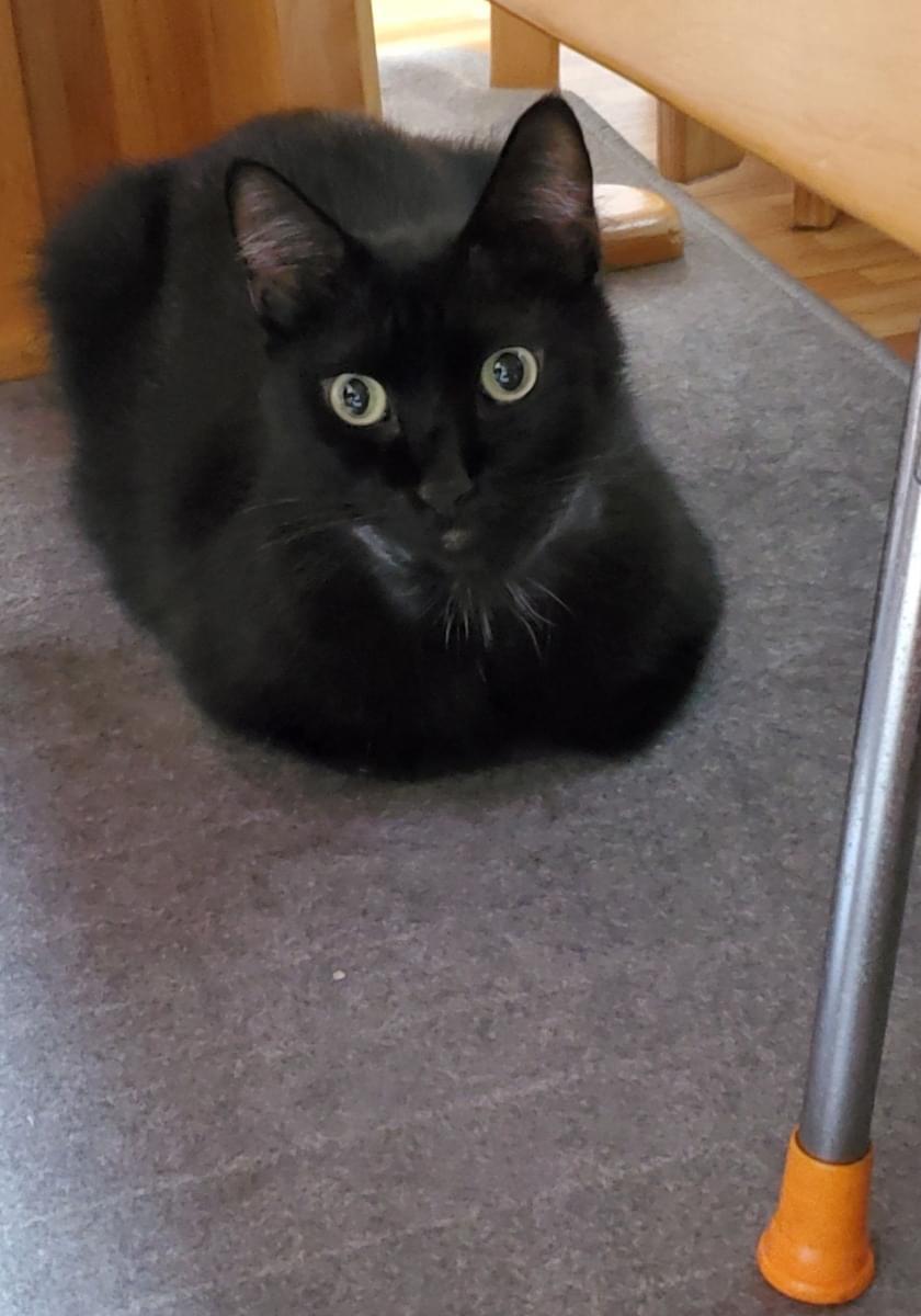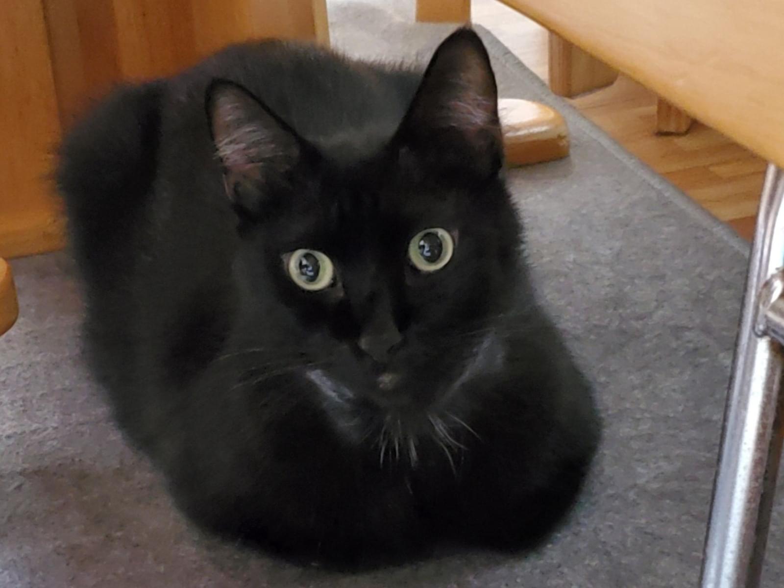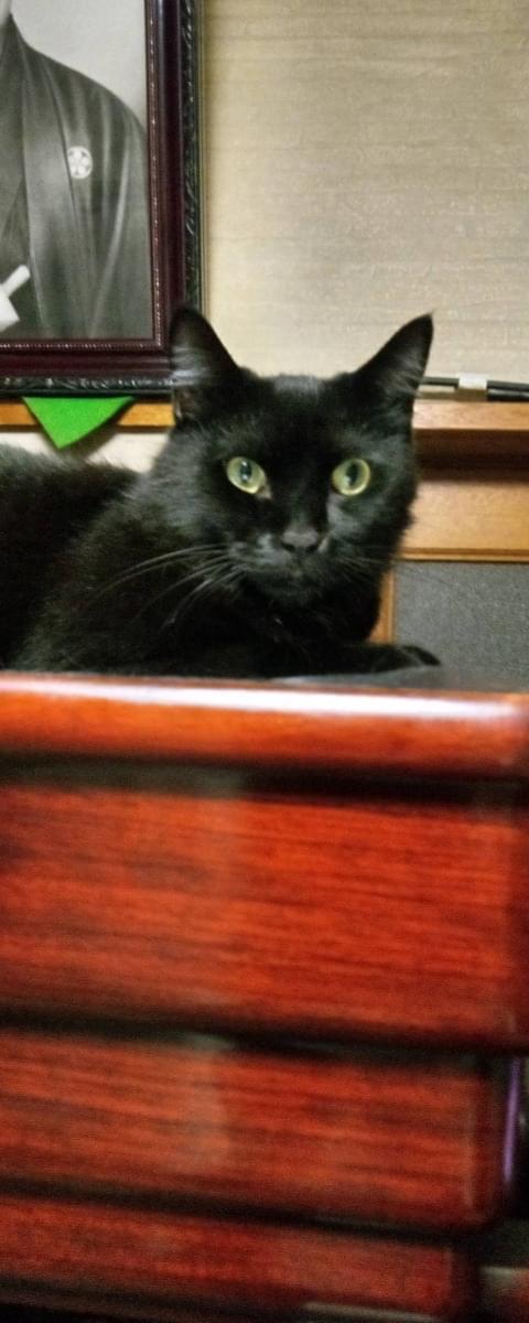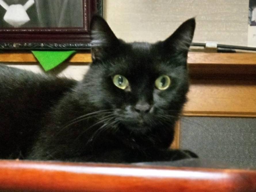 目の黄色い黒猫5歳(去勢済み)を探しています。体重5キロ、耳の毛が少し白い。尻尾は長く先っぽが折れています。首輪はしていません。