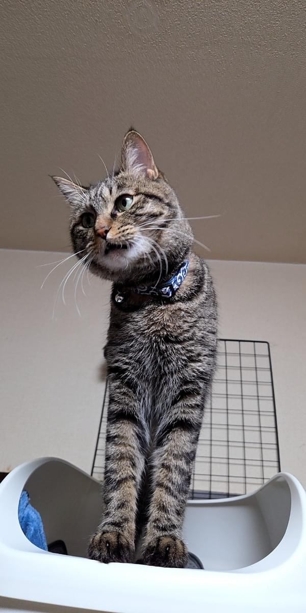 首輪の青くて鈴のないキジトラです。まぁまぁ人懐っこいやつです