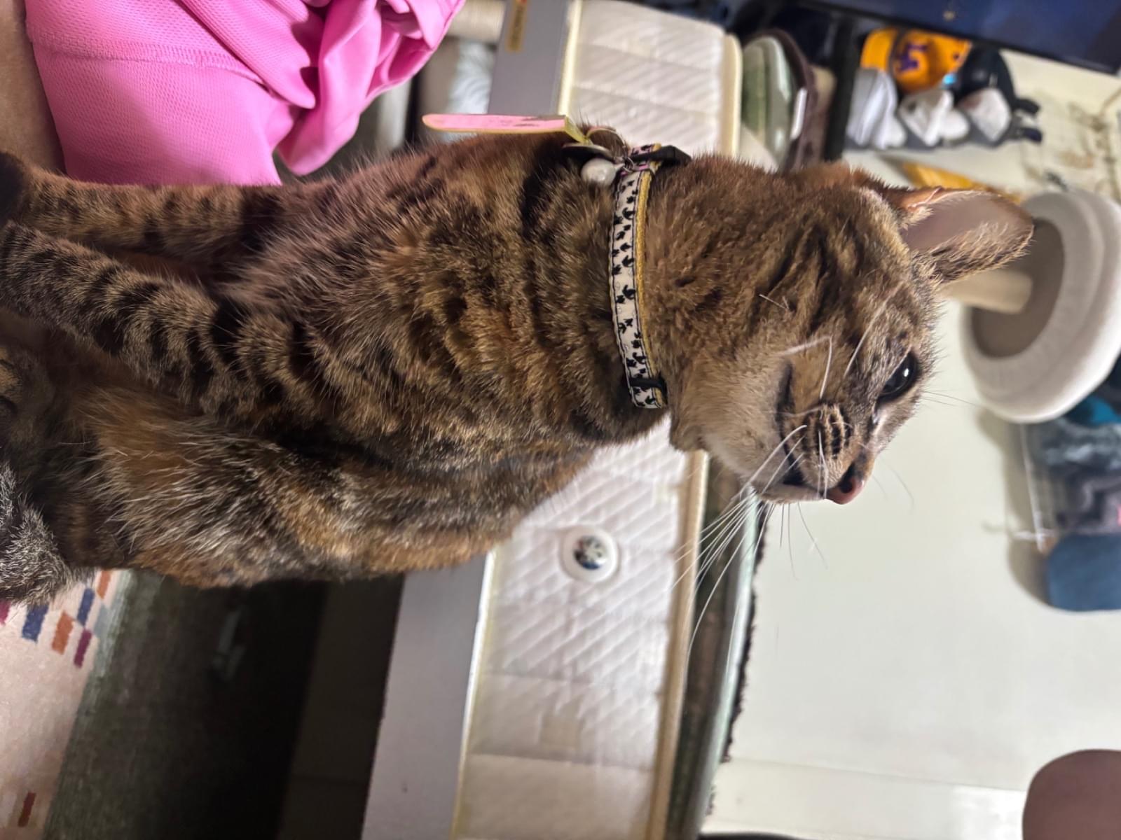 細身で好奇心旺盛ですが、すごくビビリな女の子です。ピンクの首輪に赤のスカーフみたいな三角のが付いて首輪をしてます!