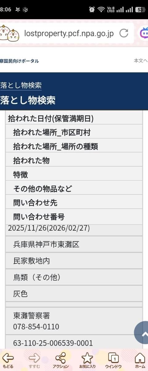 その他鳥類(つまりインコ類以外)で検索すると、灰色の鳥さんが民家敷地内で保護され、11/26東灘警察署に届けられています。