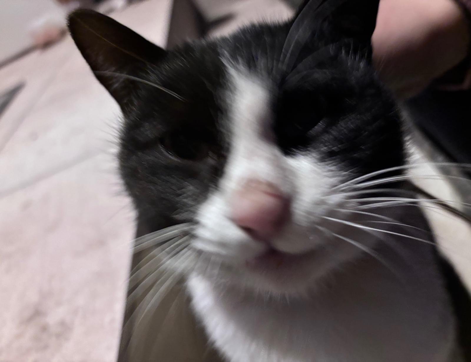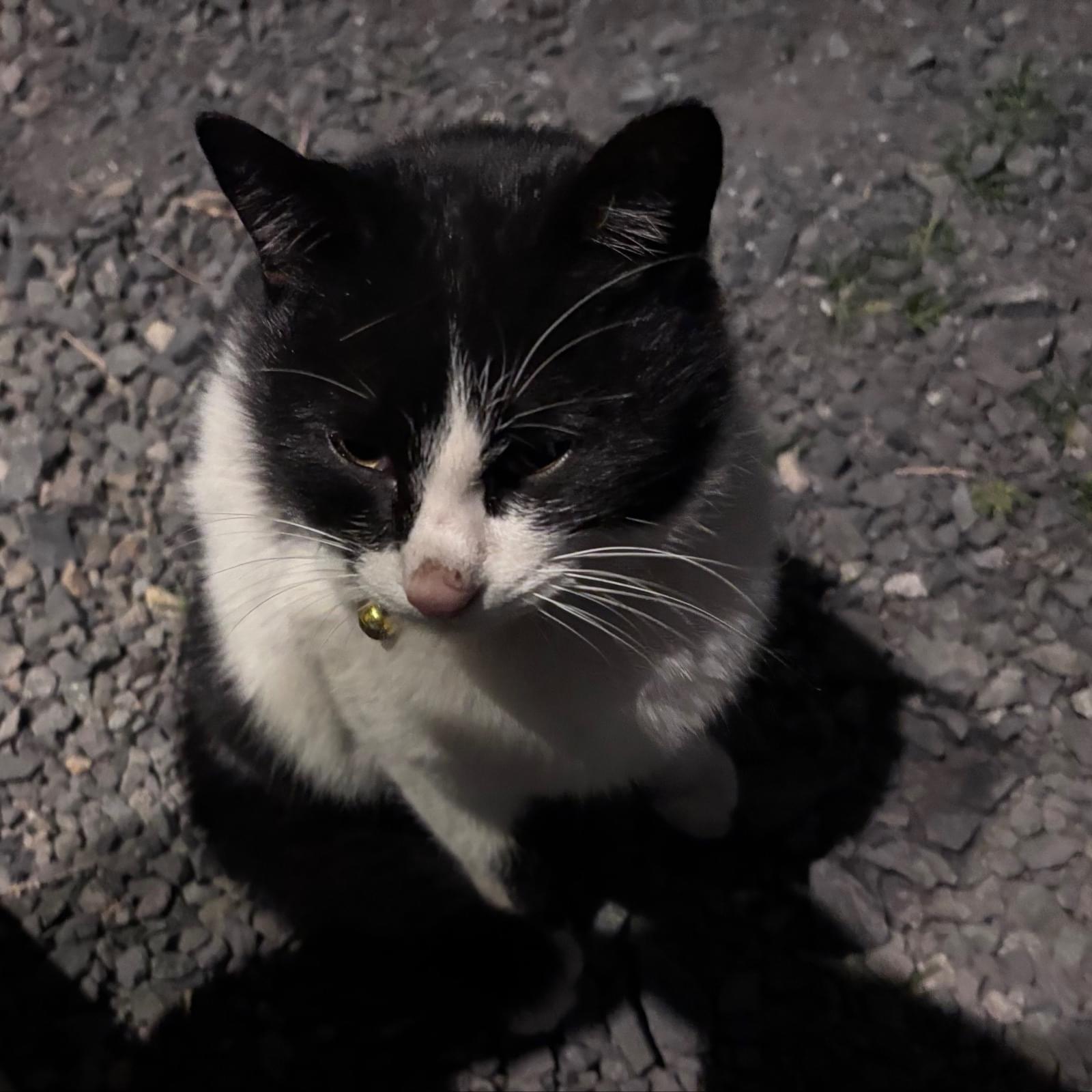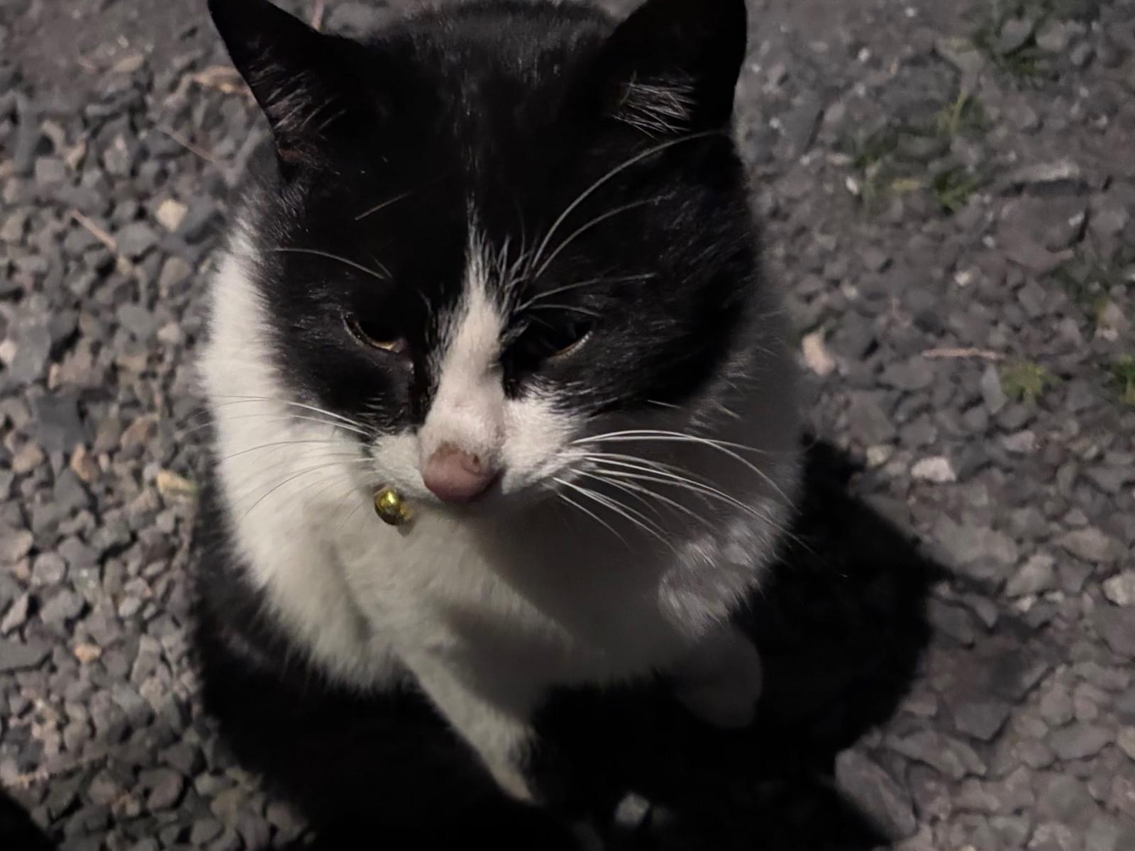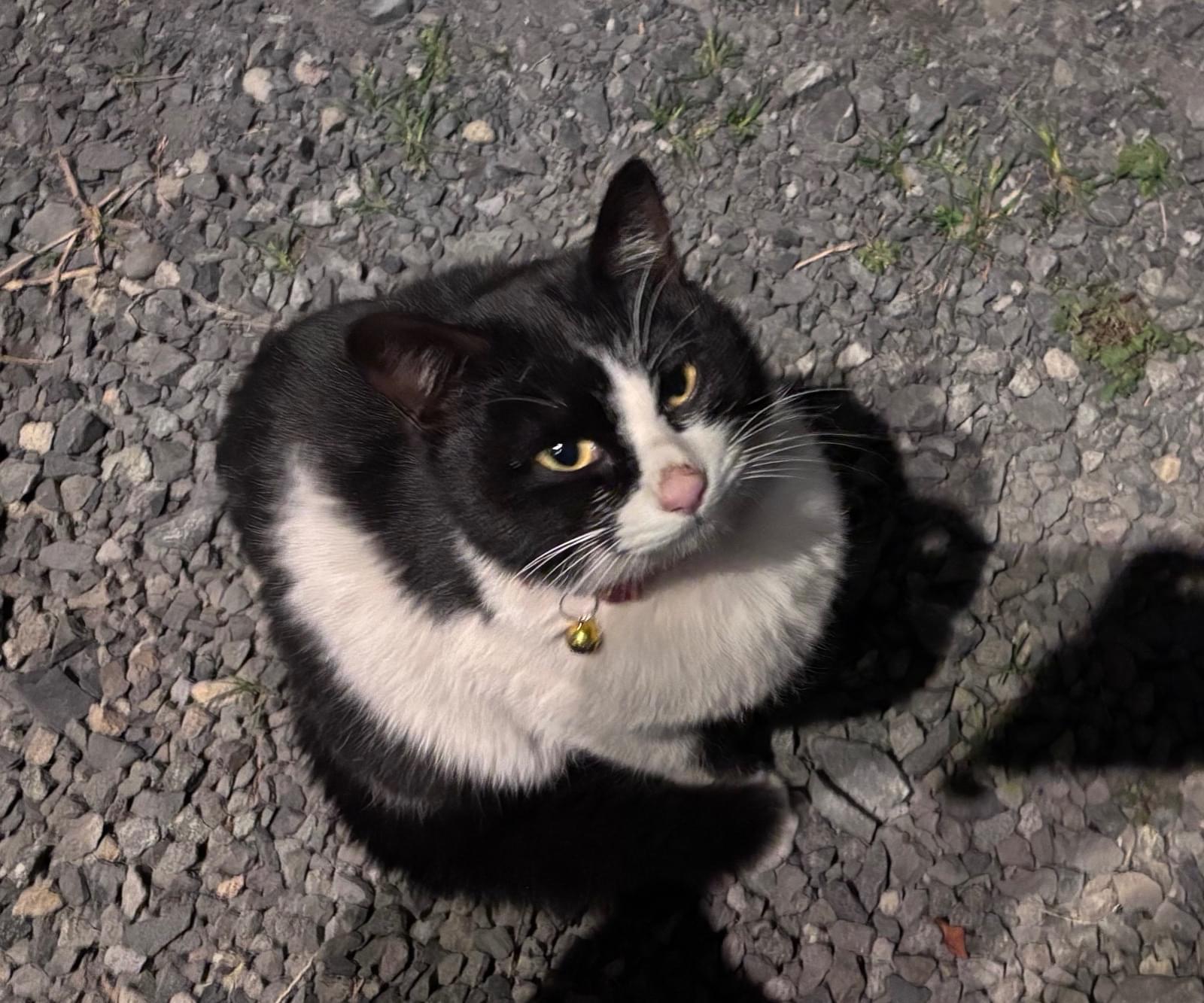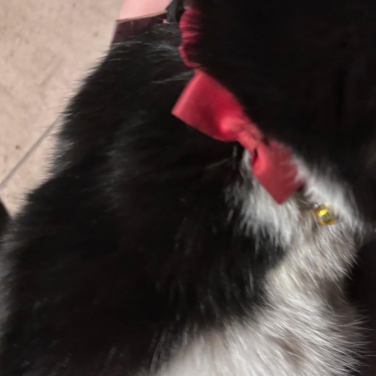 白黒ハチワレ模様の赤首輪猫ちゃん