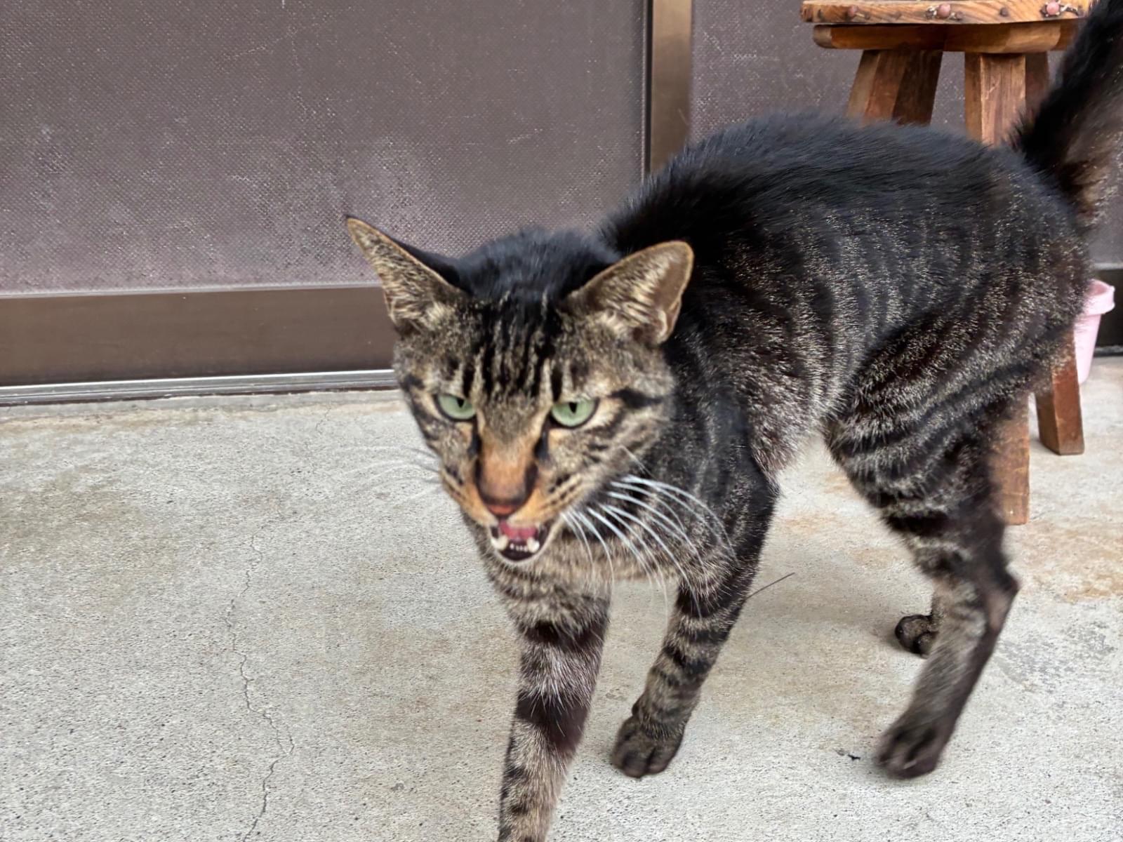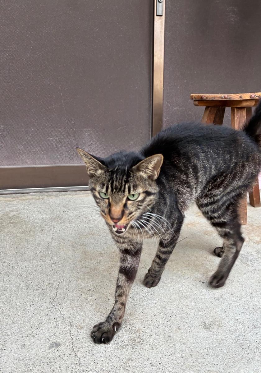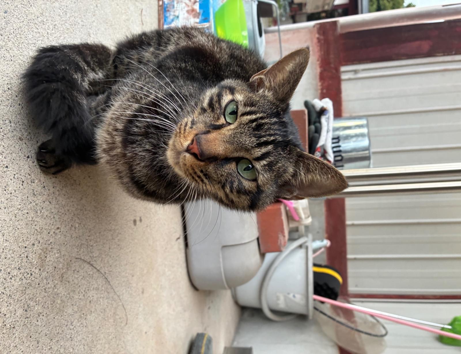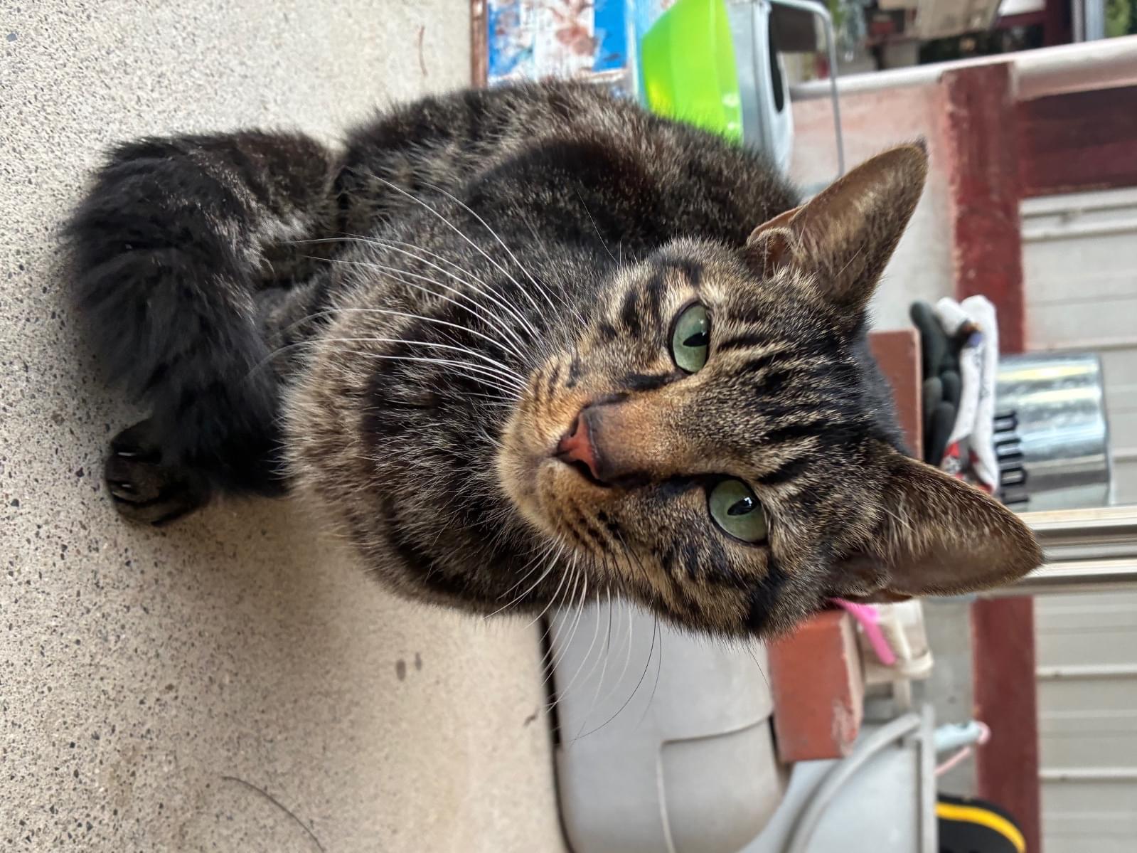 黒っぽいキジトラで、鼻筋がしゅっと印象的です。首はなど目印になるものは、ありません。