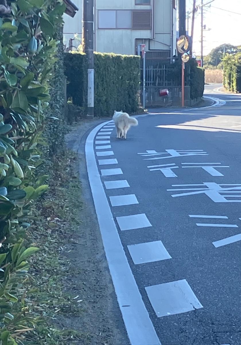 大きさは中〜大型、全身が白くて毛が長く、ふわふわとした犬を見かけました。毛で分かりにくかったのですが、よく見ると首輪ようなものをしていました。