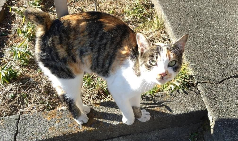 初対面で足にすり寄ってくるほど人懐っこい三毛猫です。