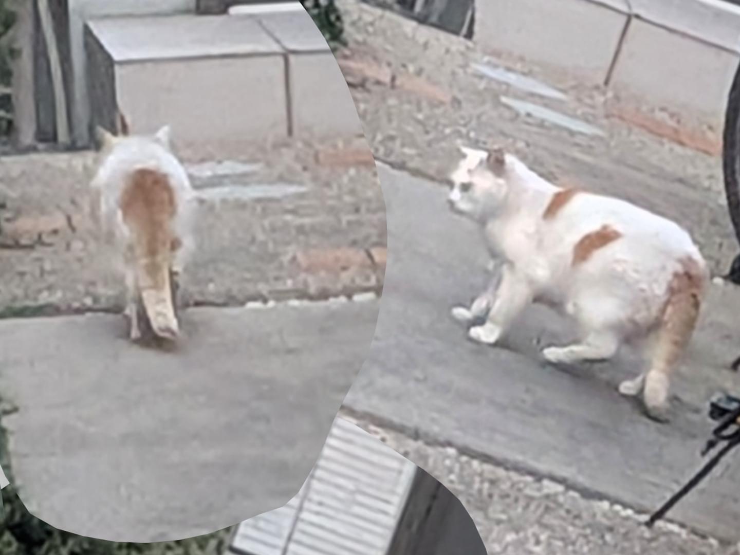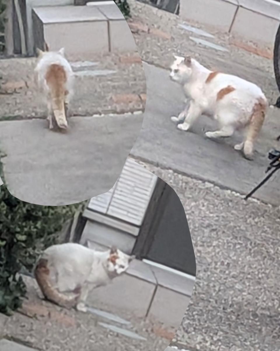 道路を渡って路地に入っていく所を話かけると、振り向き足を止めてこちらを見て掠れた声でふにゃ〜んと鳴きました。人の家の敷地内だったのでそれ以上立ち入れずそのまま去って行ってしまいました。