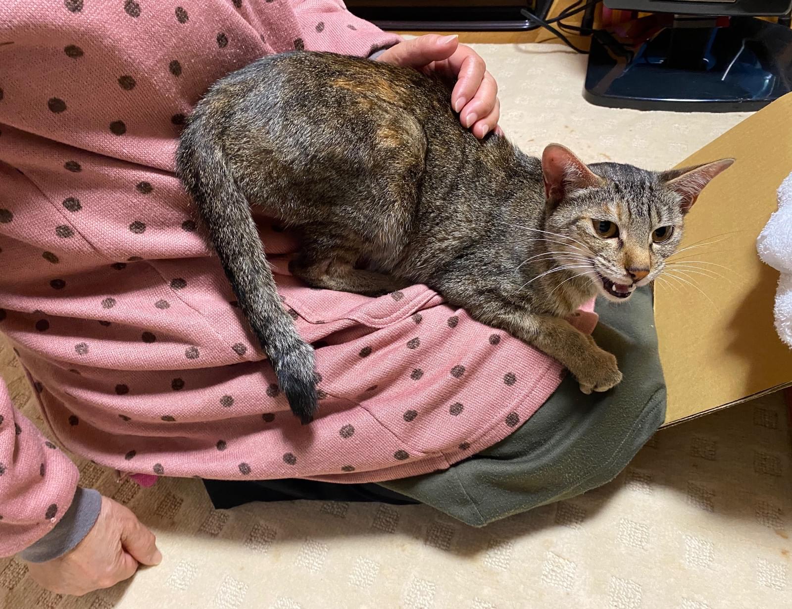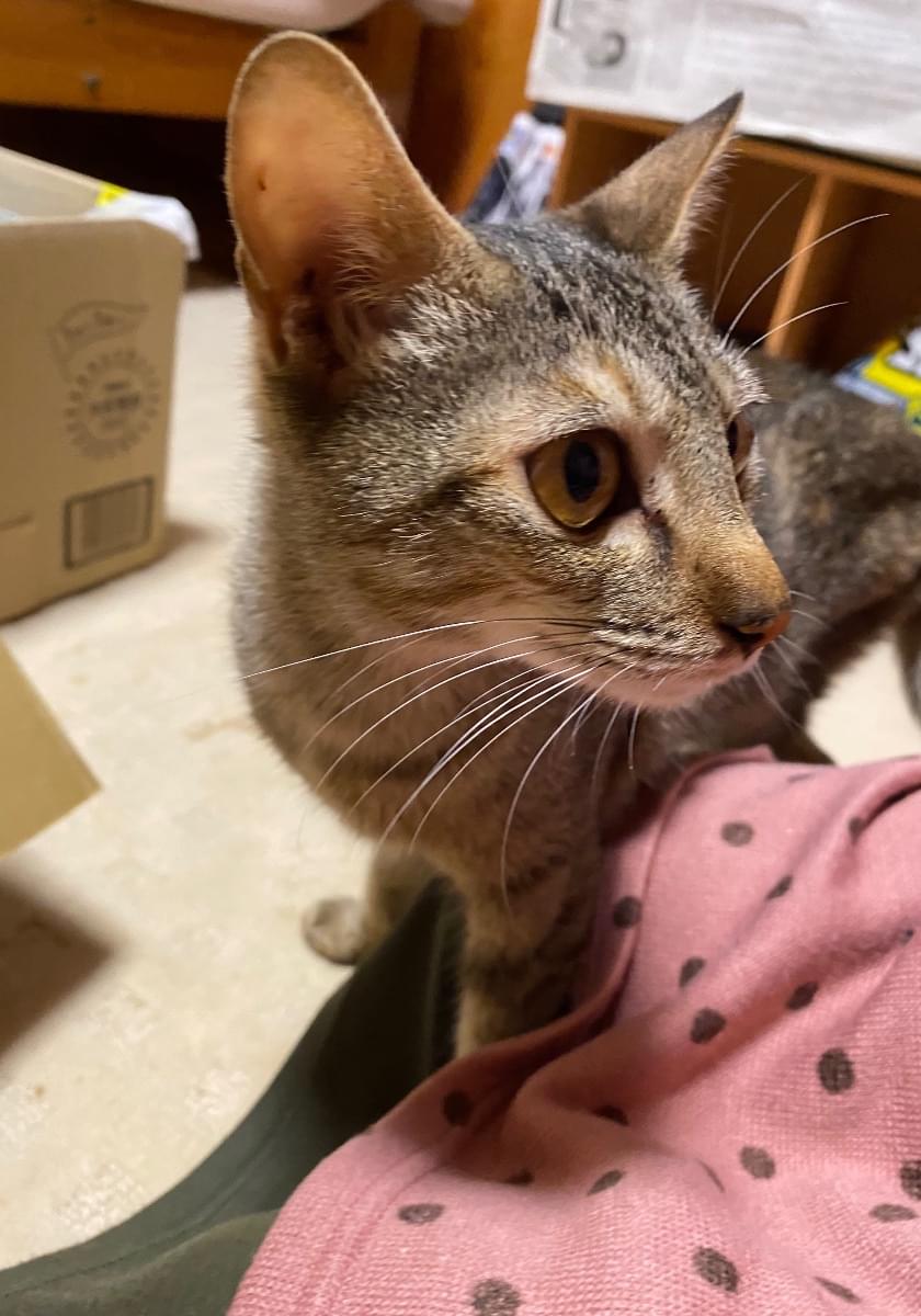 昨日、物置の上で泣き続け、動かなくなった猫を保護しました。病院に連れて行ったところ推定9ヶ月くらいのメスでした。栄養失調で左後ろ脚に怪我をしたようです。とても人馴れしているので迷い猫ではないかと思います。うちでは飼えないので、元の飼い主を探しています。このままでは保健所に連れて行く事になるので本当に困っています。