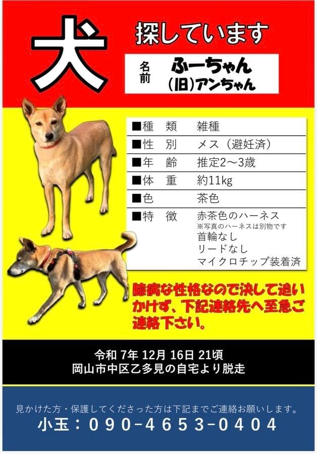2025年12月16日(火)21時頃、岡山市中区乙多見の自宅より脱走。目撃情報なし。お家へ来たばかりなので、土地勘もなく広範囲に渡って逃げている可能性が考えられます。どんな些細な情報でもかまいません。ご協力よろしくお願いします🙇♀️