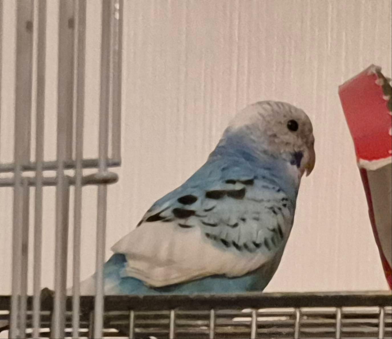 頭は白で、全体が水色、若干羽に黒が入っています。見つけたら連絡いただけると助かります。