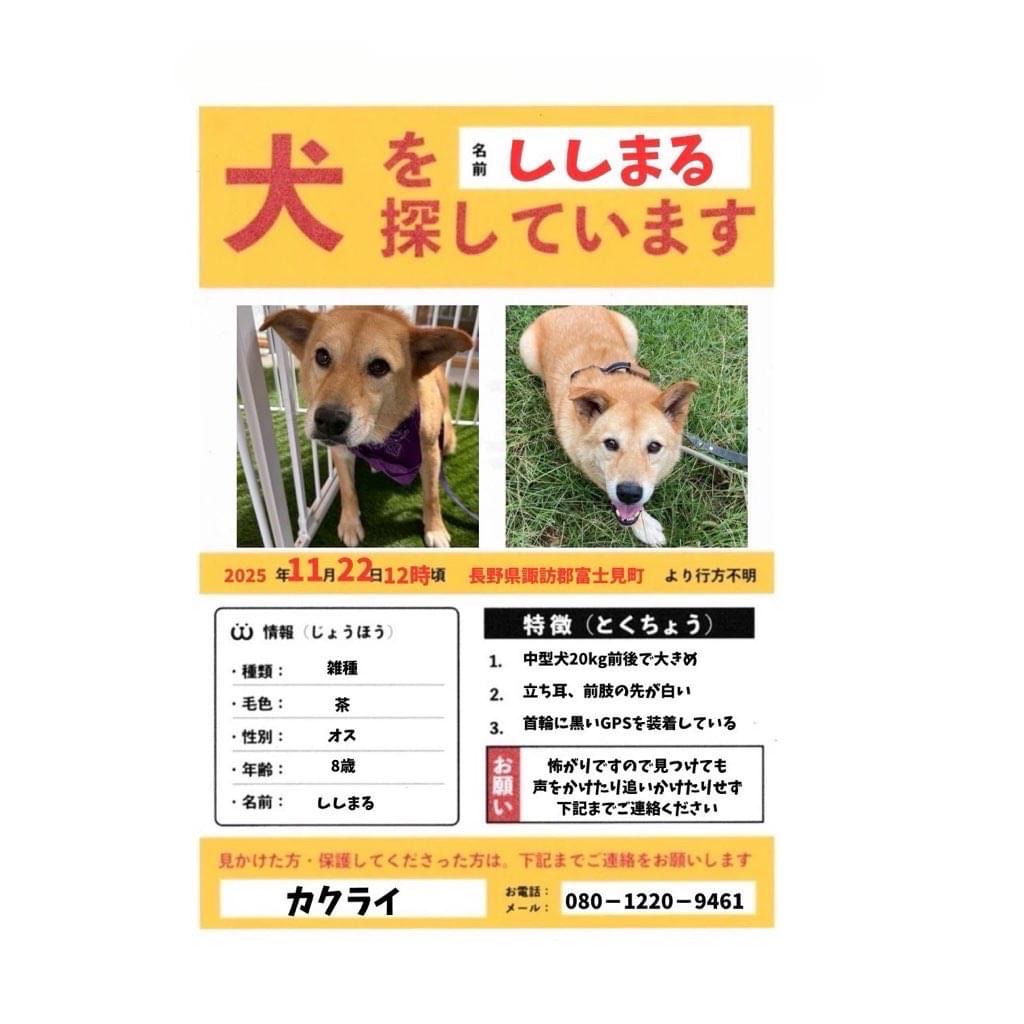 ホーム迷子犬長野県茶色の中型犬、雑種、…茶色の中型犬、雑種、オス、赤い首輪管理編集するポスター掲載終了最終更新日時:2025/12/22 23:14写真情報用件迷子名前ししまる性別オス年齢推定9歳弱場所長野県 諏訪郡富士見町落合発生日時2025年11月22日(土)飼い主KAKU説明赤い首輪に黒いGPS、雑種、茶色、推定9歳弱、足の先が白い、立ち耳連絡先URL未設定掲示板情報交換のための掲示板です。ユーザーからの情報提供、オーナーからの連絡などにご利用下さいませ。書き込んだ情報は、オーナーのメールに通知されます。まだコメントはありません。トピックを作成する