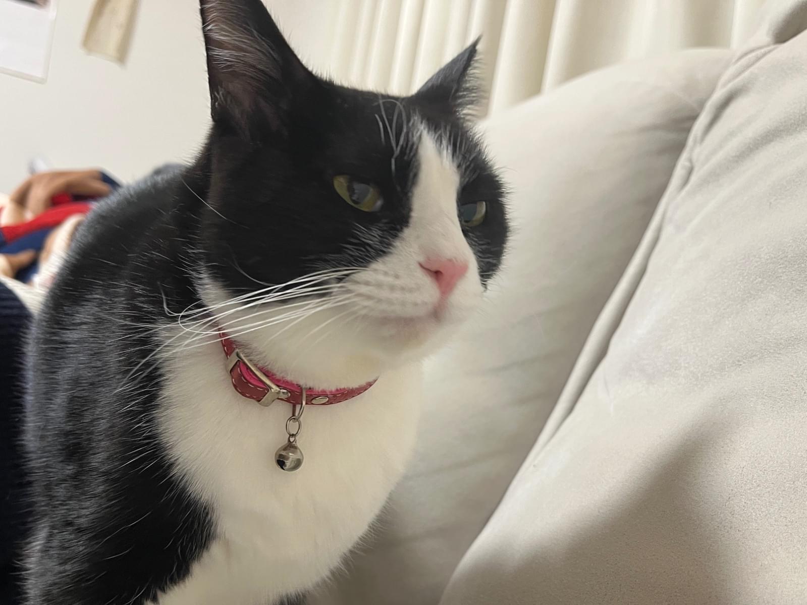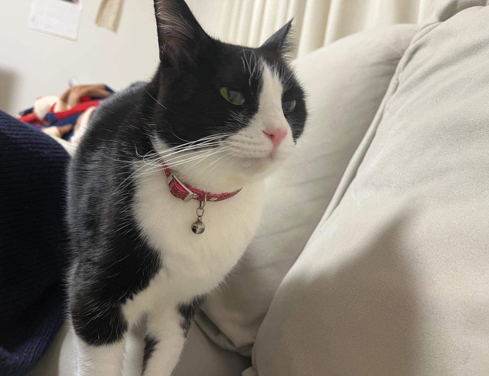 白黒のハチワレ、鼻先はピンクで足は白毛の猫、ひなを探しています。