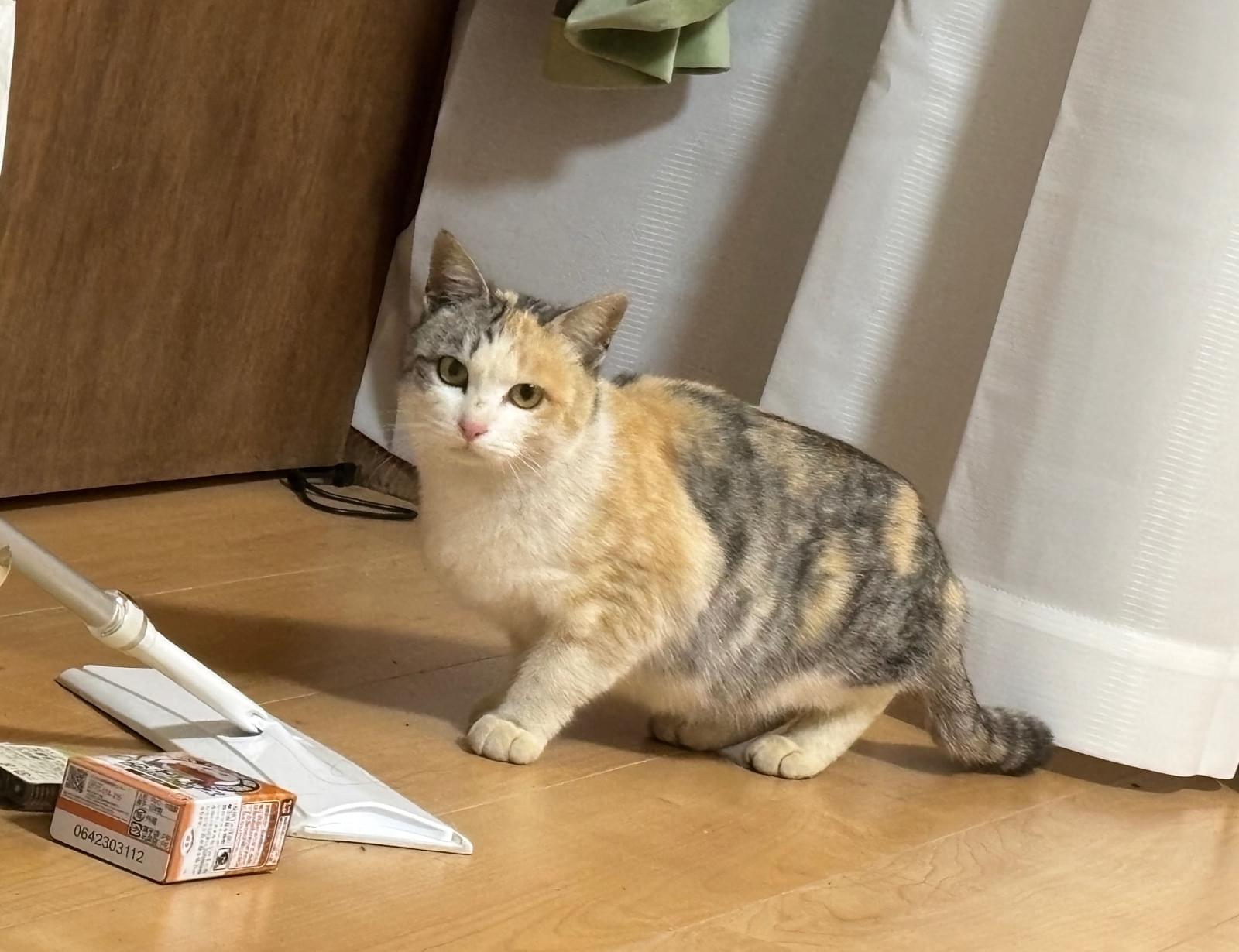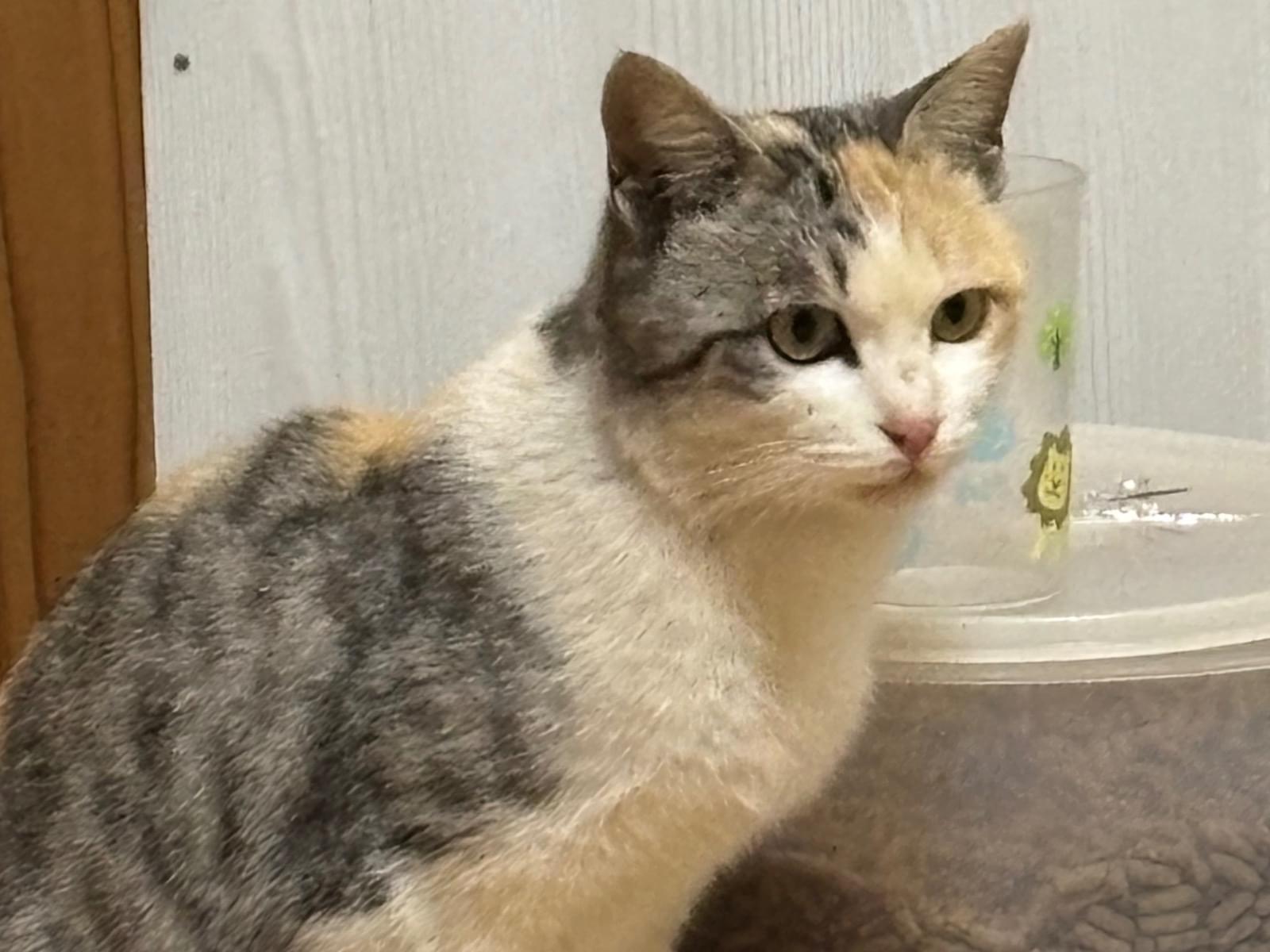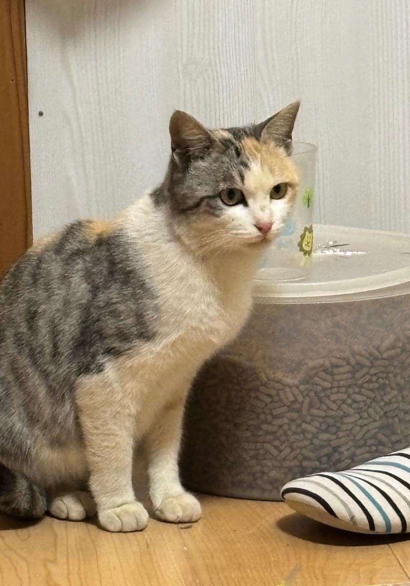 小柄で若そうなパステル三毛の子です。首輪なし、雌雄はわかりませんが多分メスかなと思います。