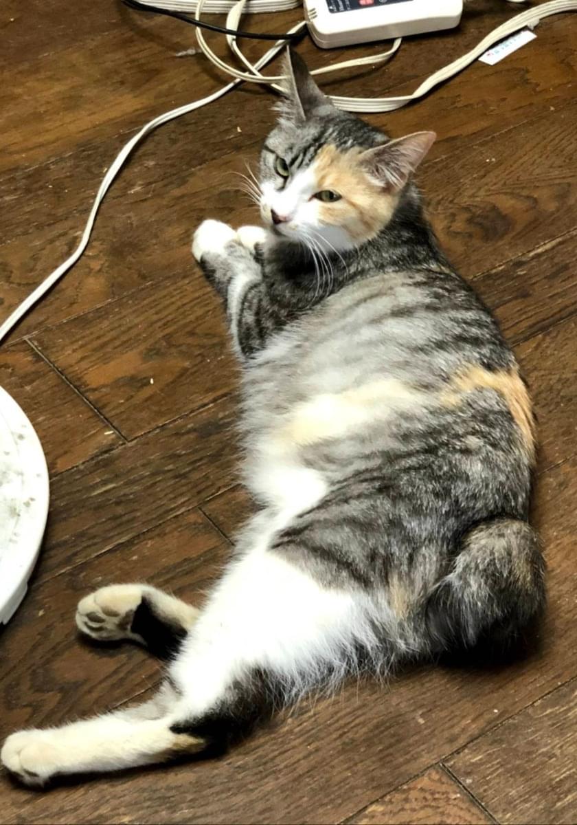 首輪つけてません、三毛猫、尻尾が短い。女の子。性格は臆病ですが懐くとデレデレです。