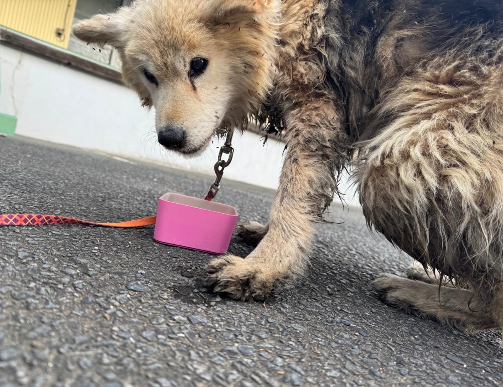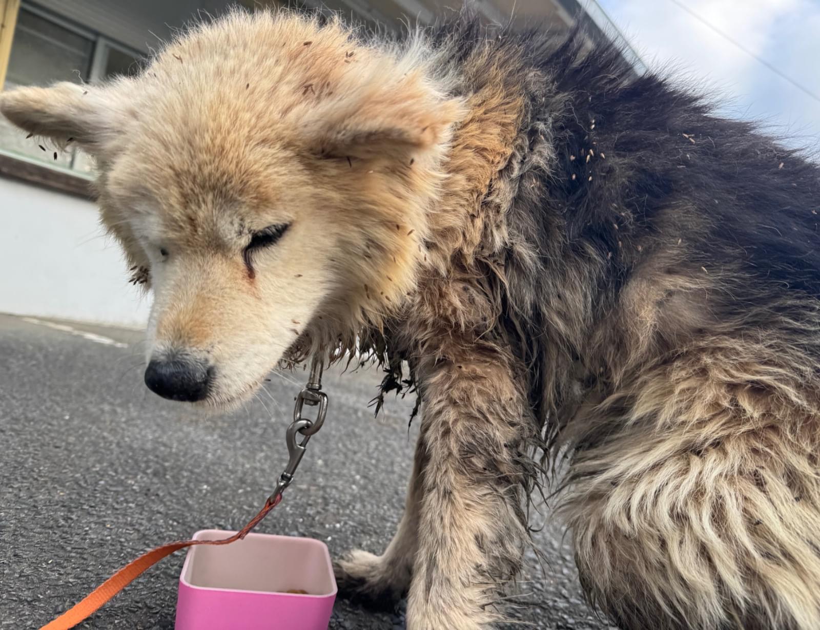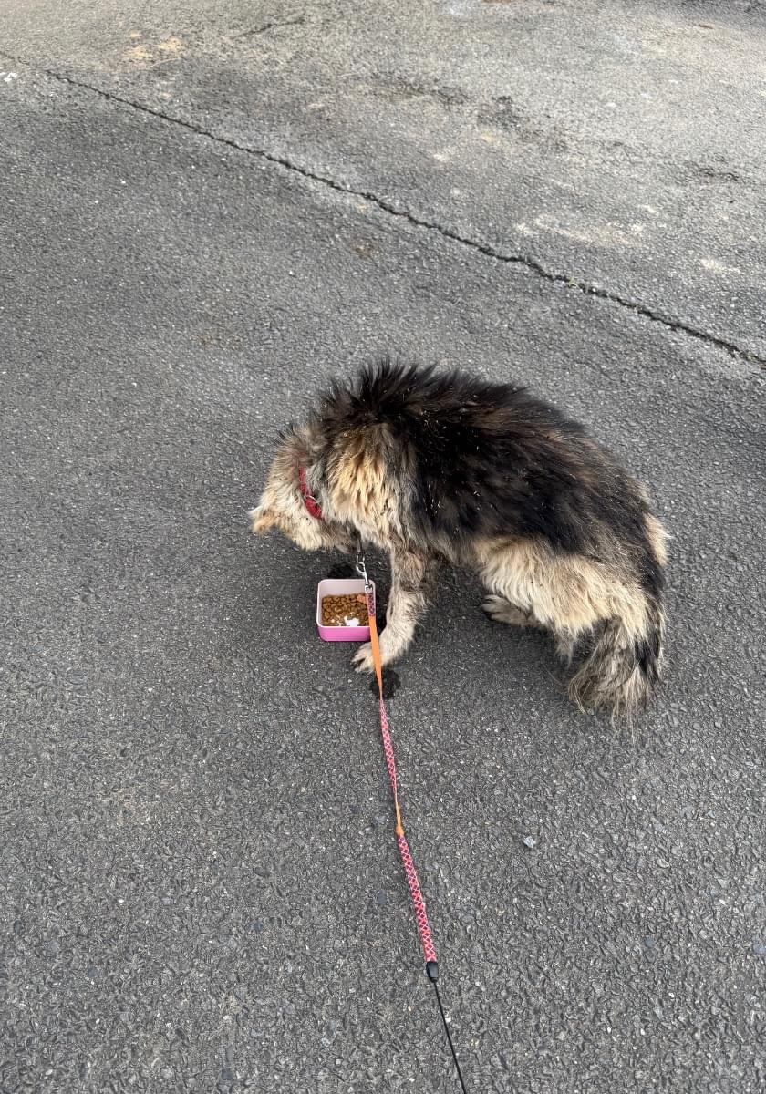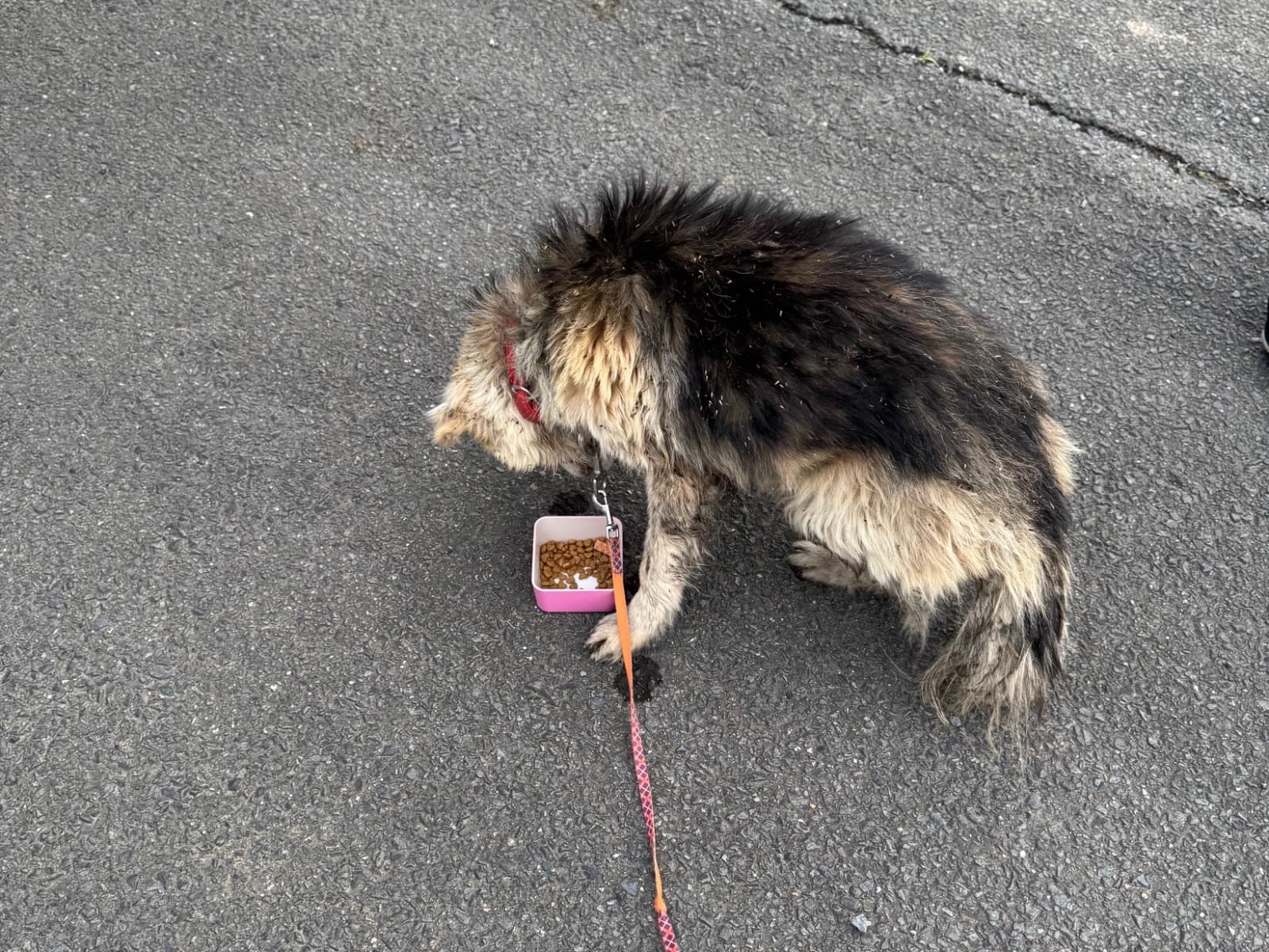 家にもわんちゃん猫ちゃんがいるのでお家でそのまま保護することは難しかった為、動物保護センターの方に連絡させて頂きました。お水は飲みませんでしたが、餌やおやつは食べてくれました。毛もボロボロになってしまっていて、ドロボー(ひっつき虫)がたくさん着いてました。止まると鳴きながらクルクル回ったりしていたので老犬だと思います。寒くて震えていたので結構な時間飼い主様と会えない時間を過ごしていたと思います。それと首輪に鎖が付いていて多分リードなどがちぎれてしまっていたのかと思われます。