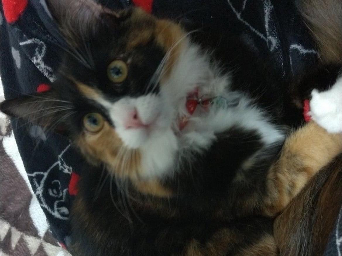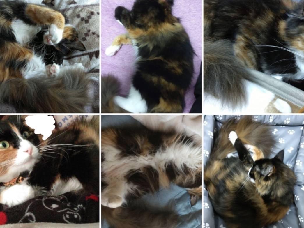 メインクーンで通常の猫よりは大きめ、胴体100cm程で毛柄は三毛で、特徴は黒い仮面を目にかけているような柄の子です。鼻と口周りは白く鼻はピンク色です。尻尾は長めです。
