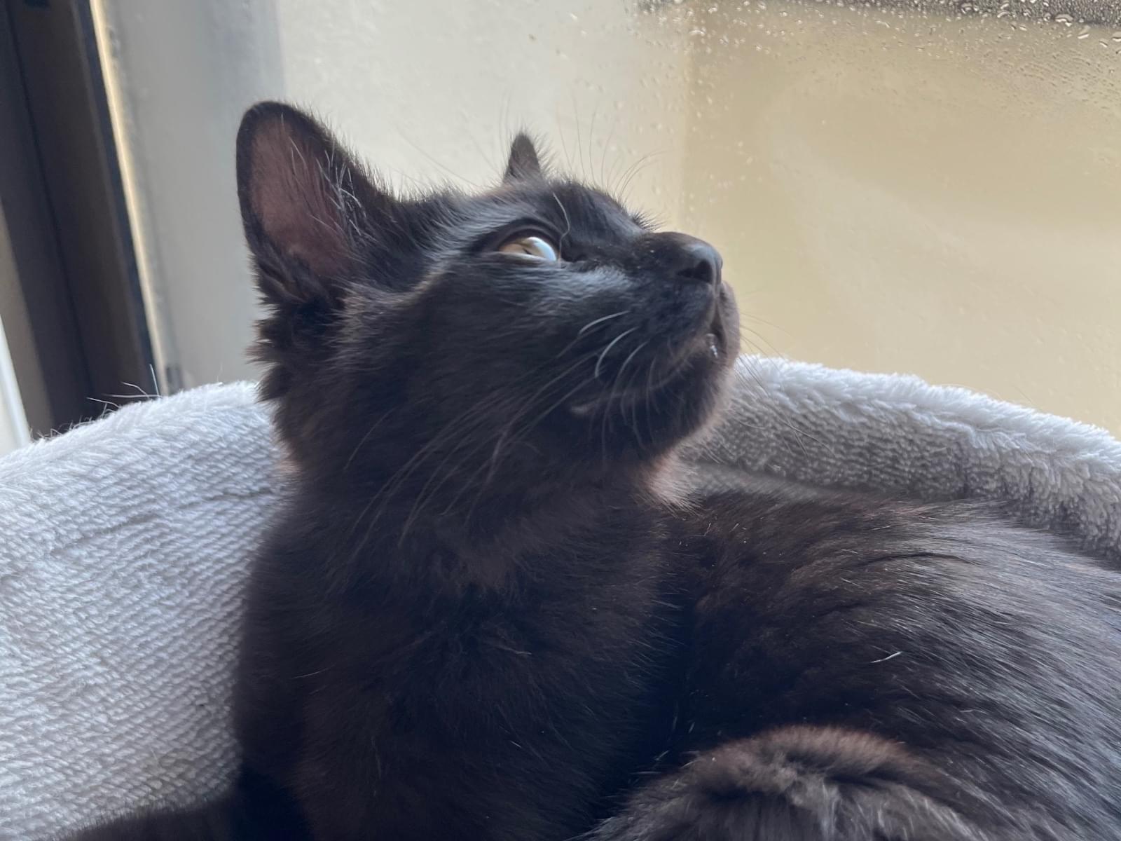 手足と胴も長くスリムです。とてもビビりですが、自宅では人慣れしており甘えん坊です。ごはんが大好きです。左の口髭が1本だけ白色です。ニャーではなく、少し調子外れのアーというような声で鳴きます。