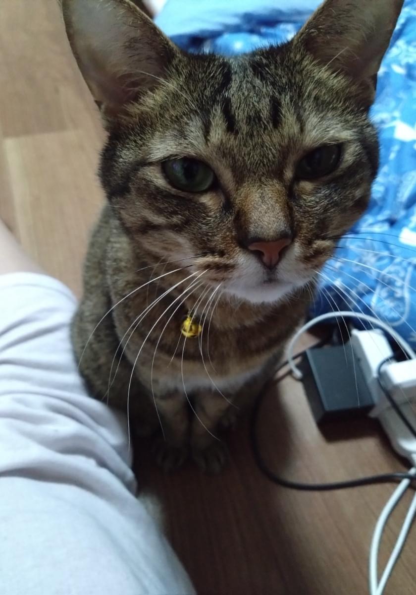 濃いオレンジの唐草模様の首輪をつけた猫を探しています。