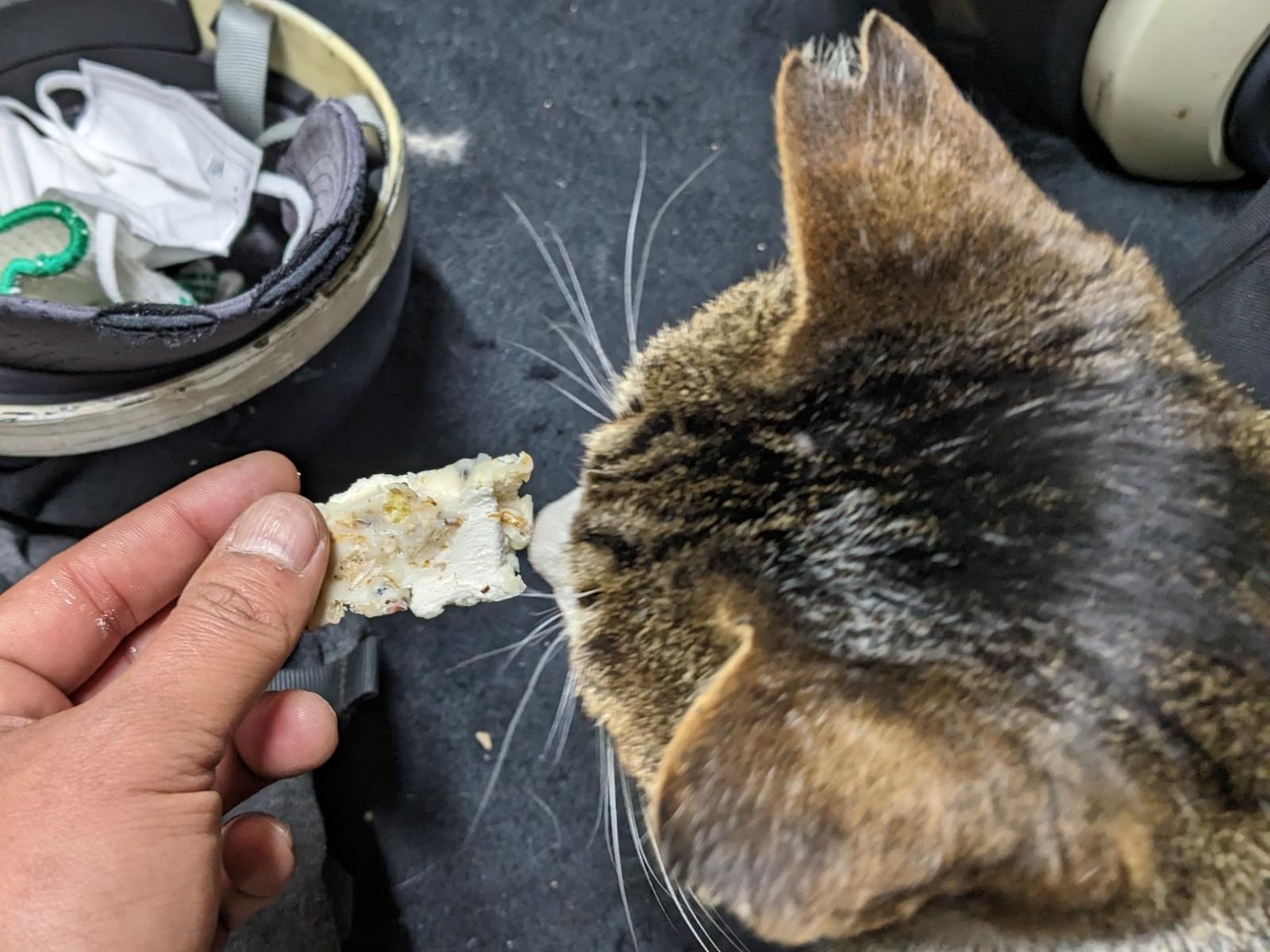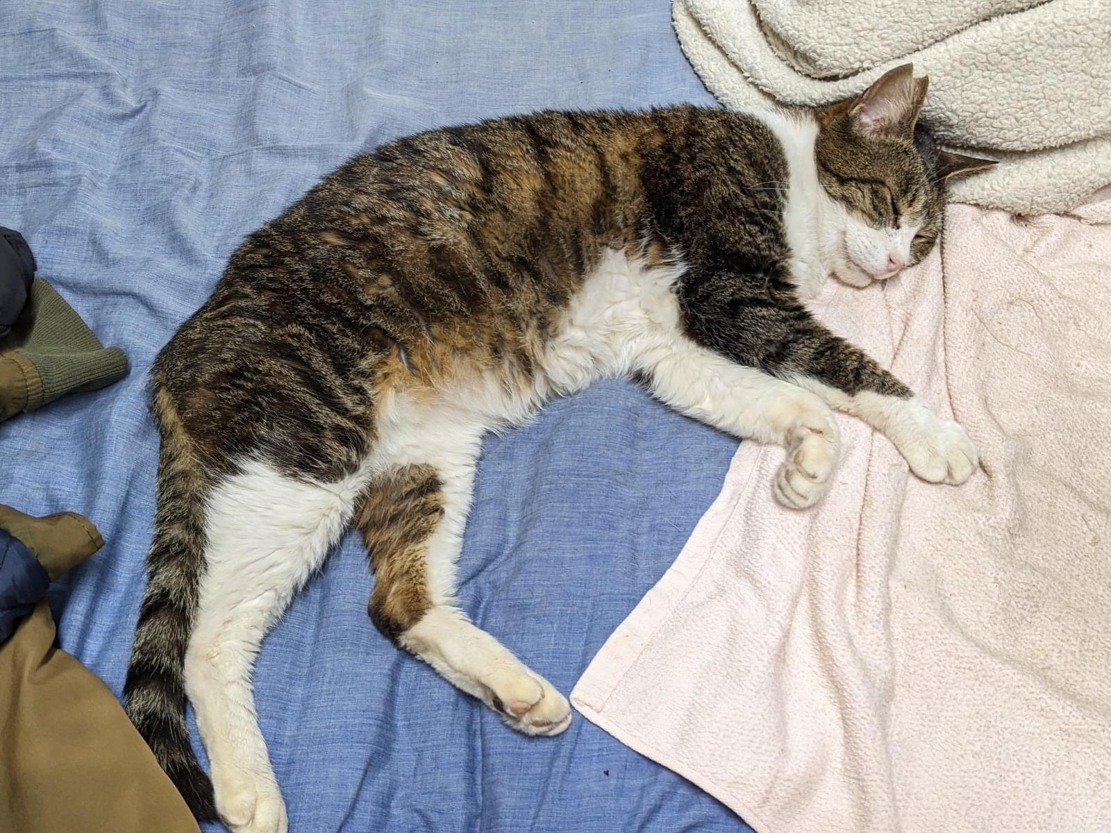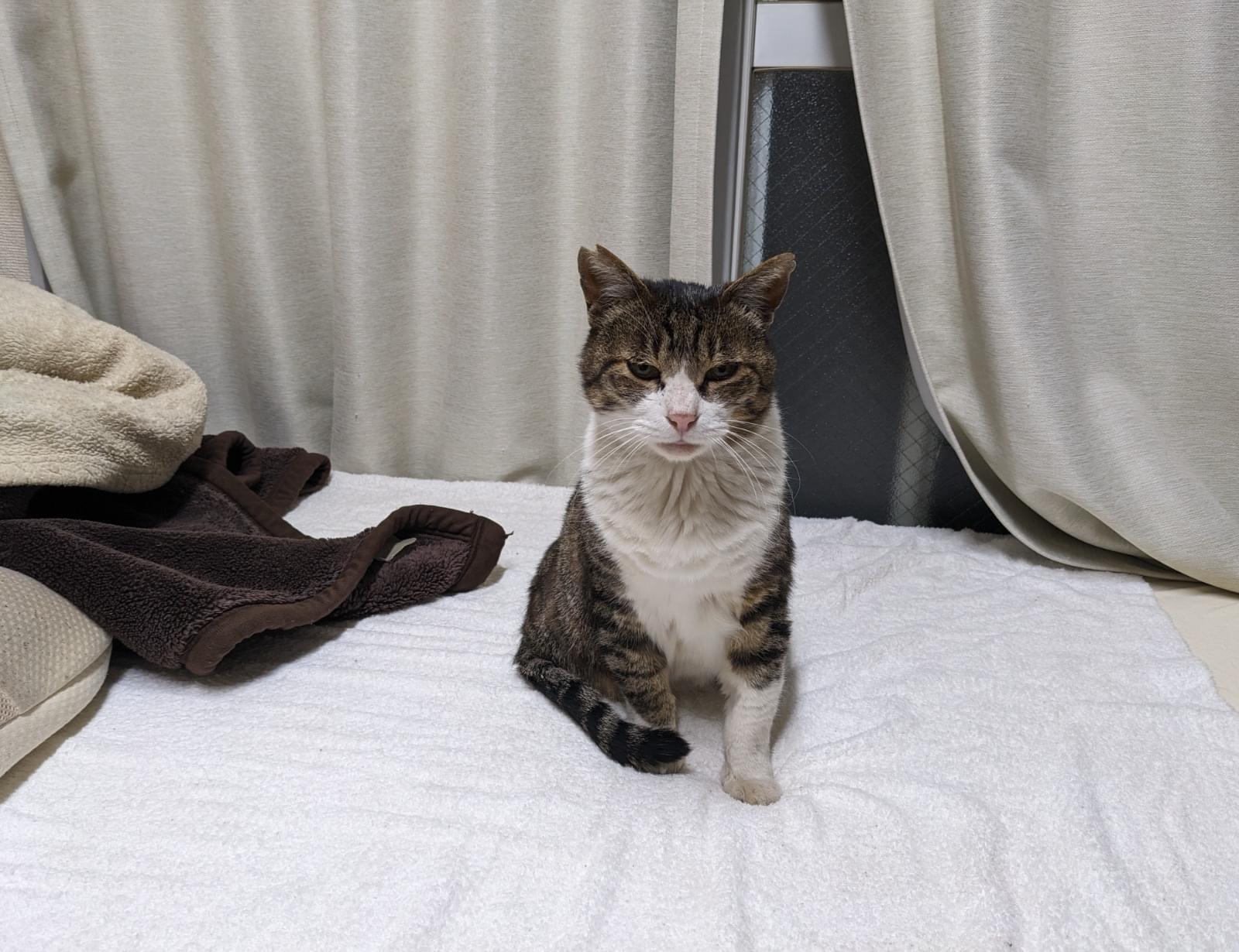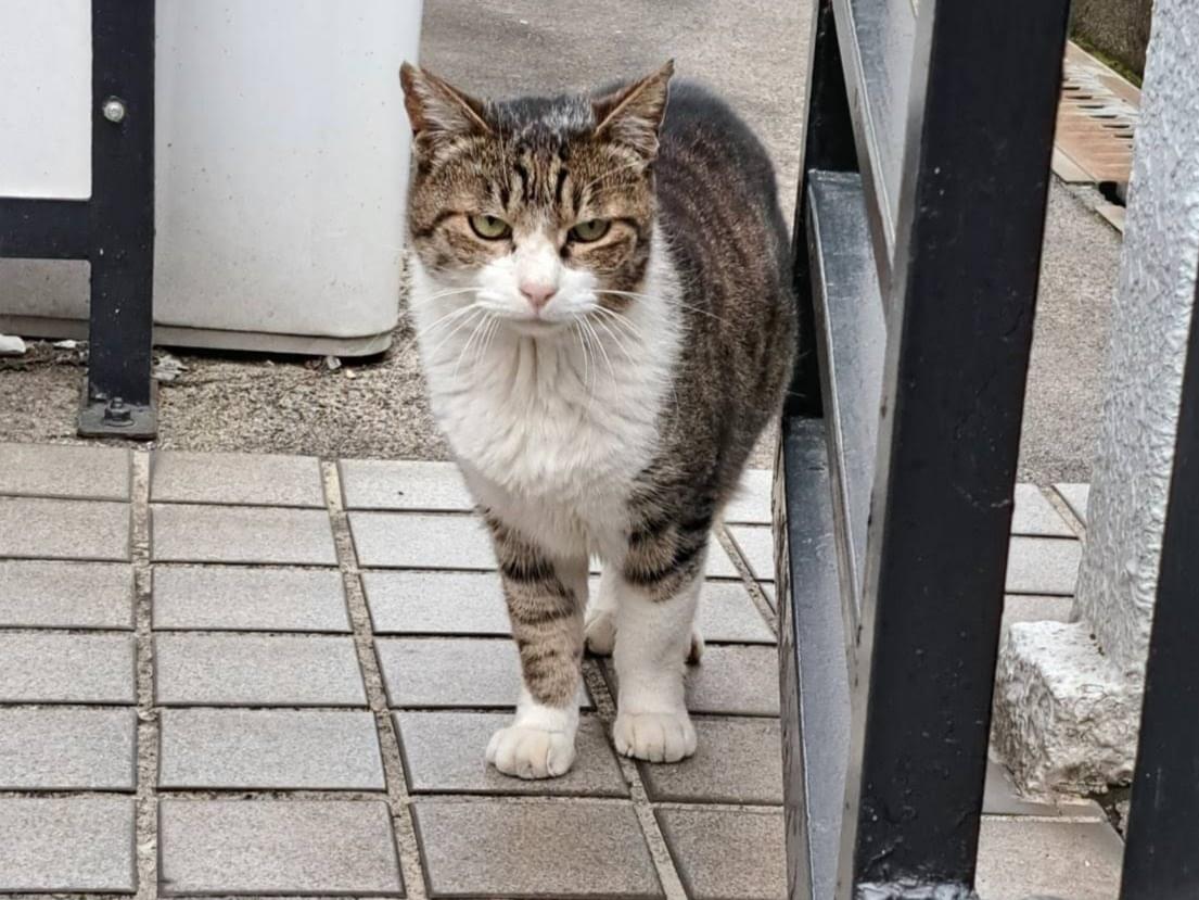 右耳カット、頭のてっぺんに丸い白髪、右後足がケガで2本爪が出ています。
