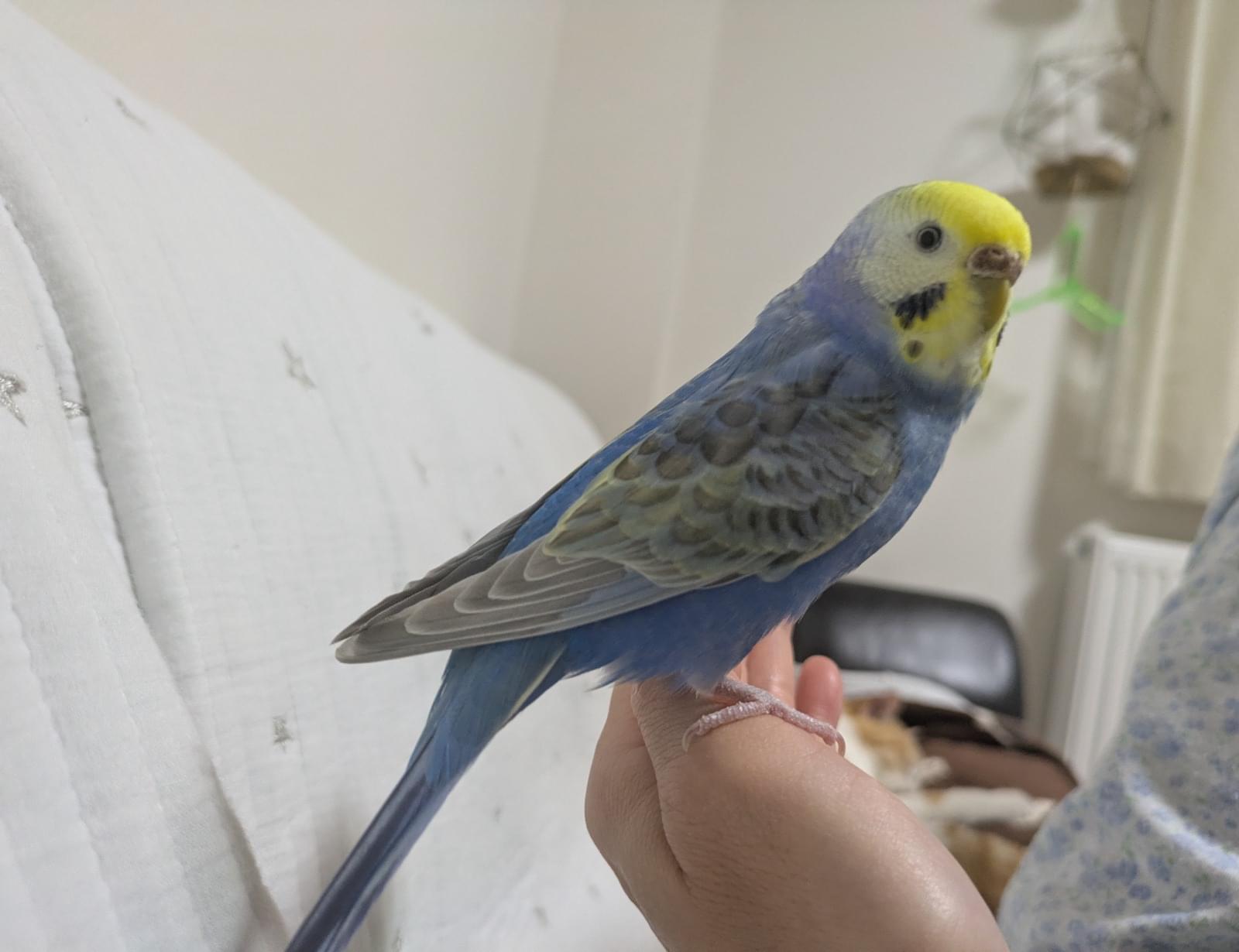 頭黄色、体は淡いブルーです。手や肩には乗りますが、手ではつかめません、、、。