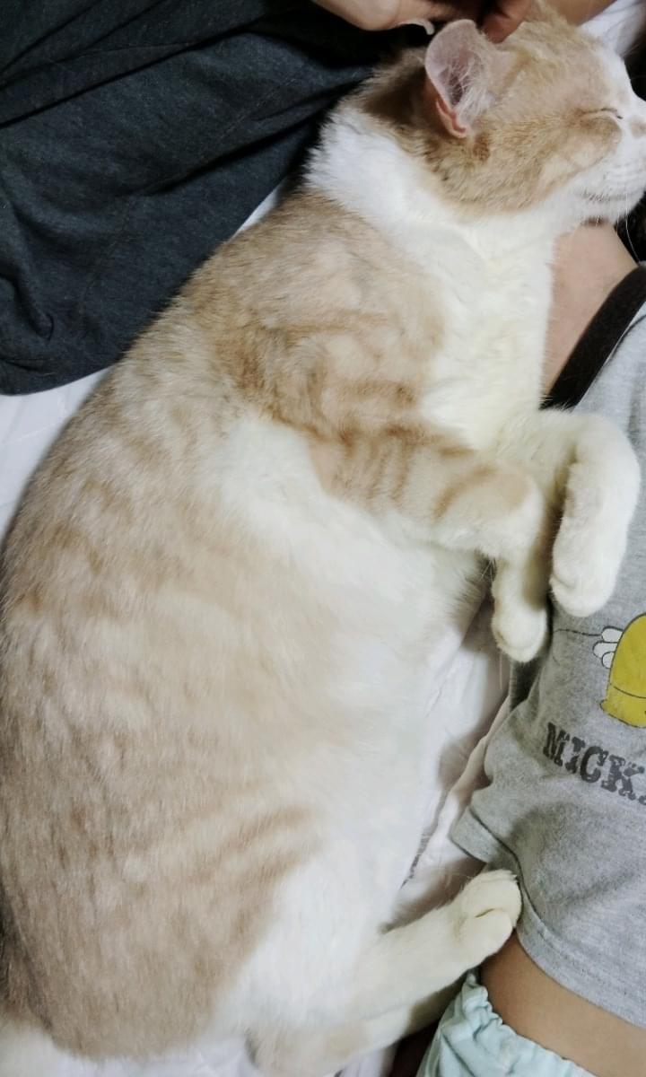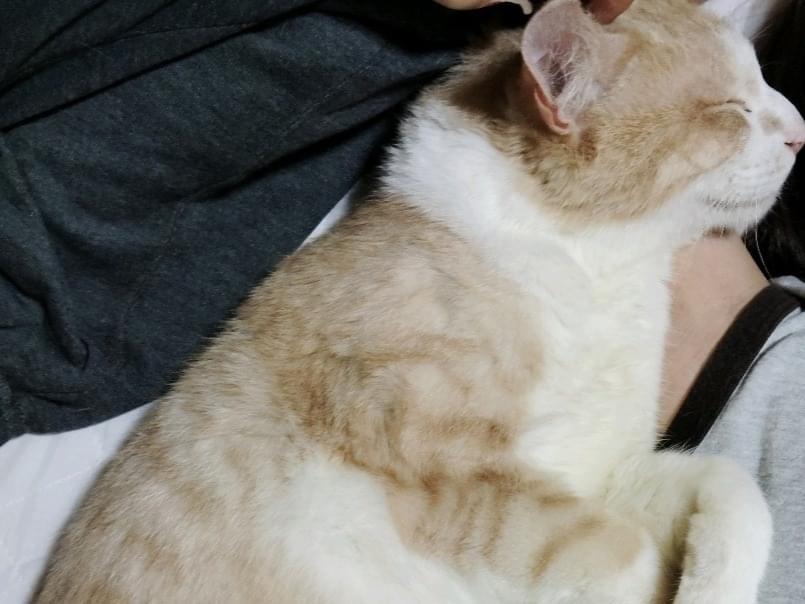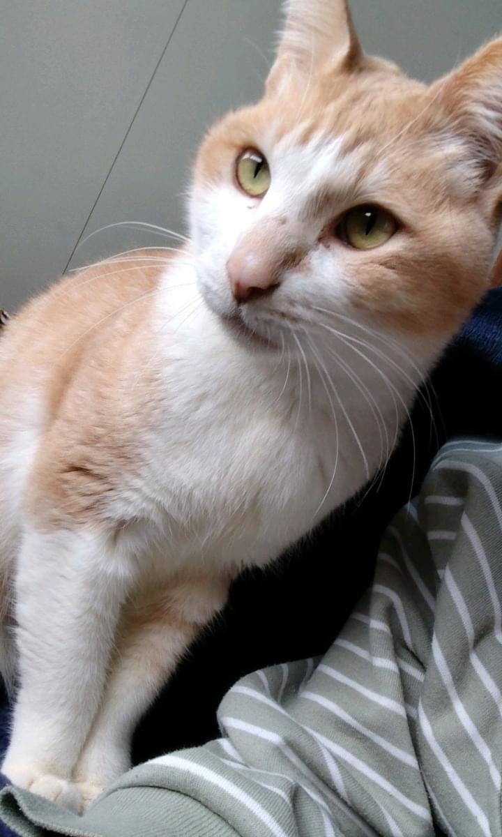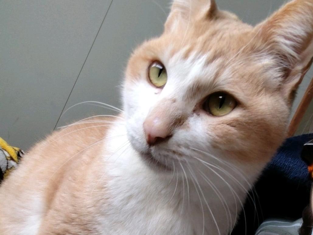 クリーム色と白の猫で、手術で尻尾がみじかいです。少し顎に怪我してます。