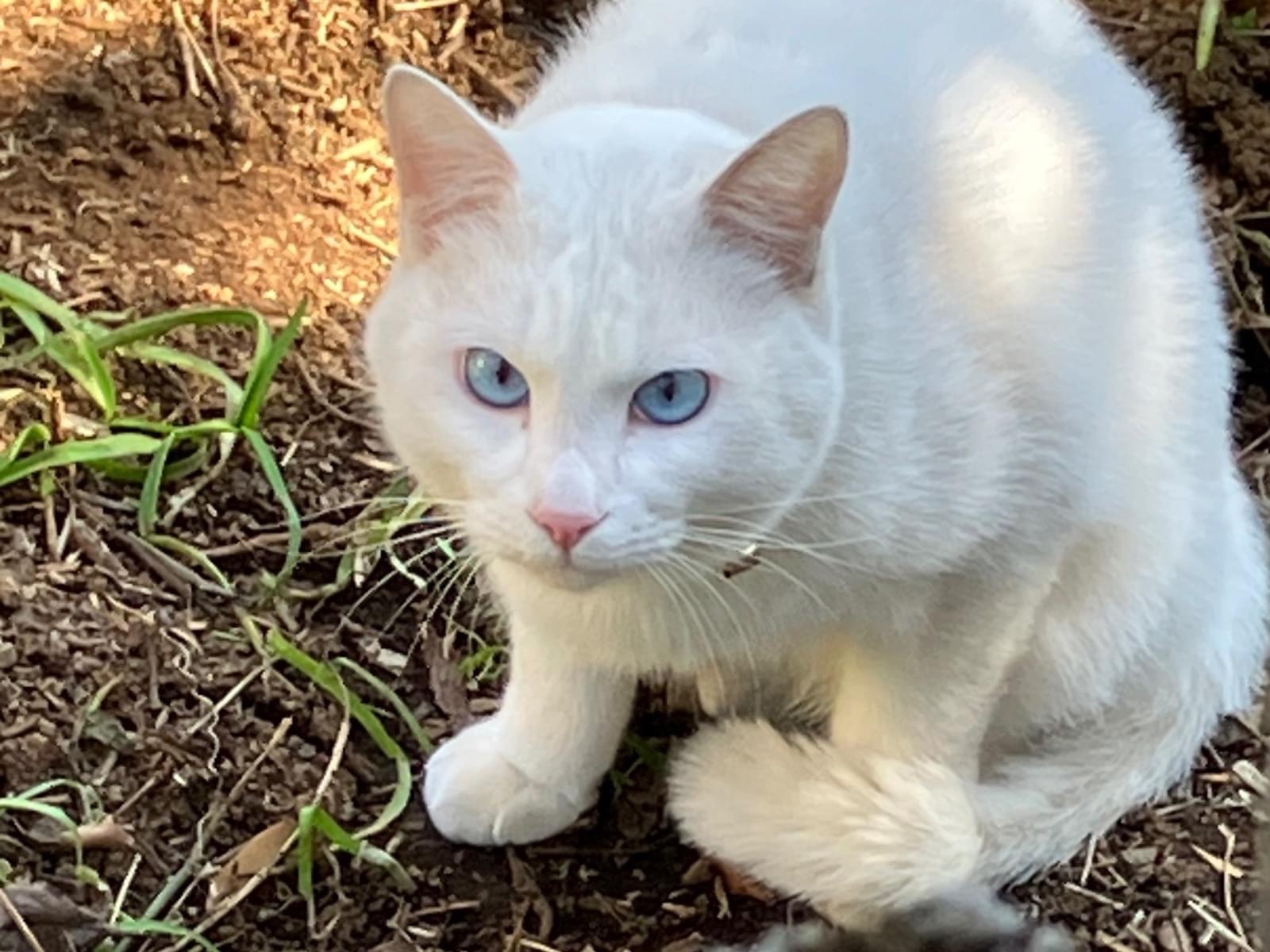鈴のついた白っぽい首輪にブルーアイの白猫です。人間に対して警戒心はさほどありませんが、近づくと逃げてしまいます。どなたか探していませんでしょうか?