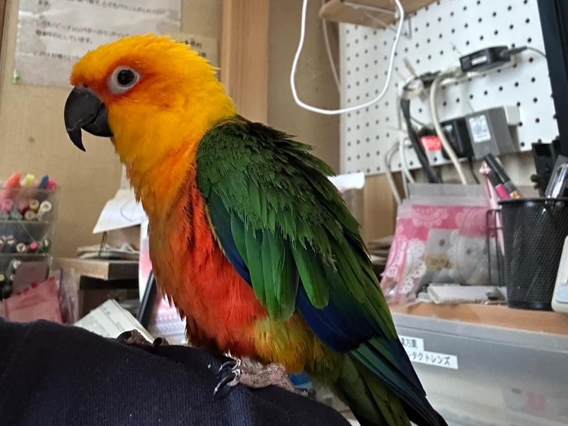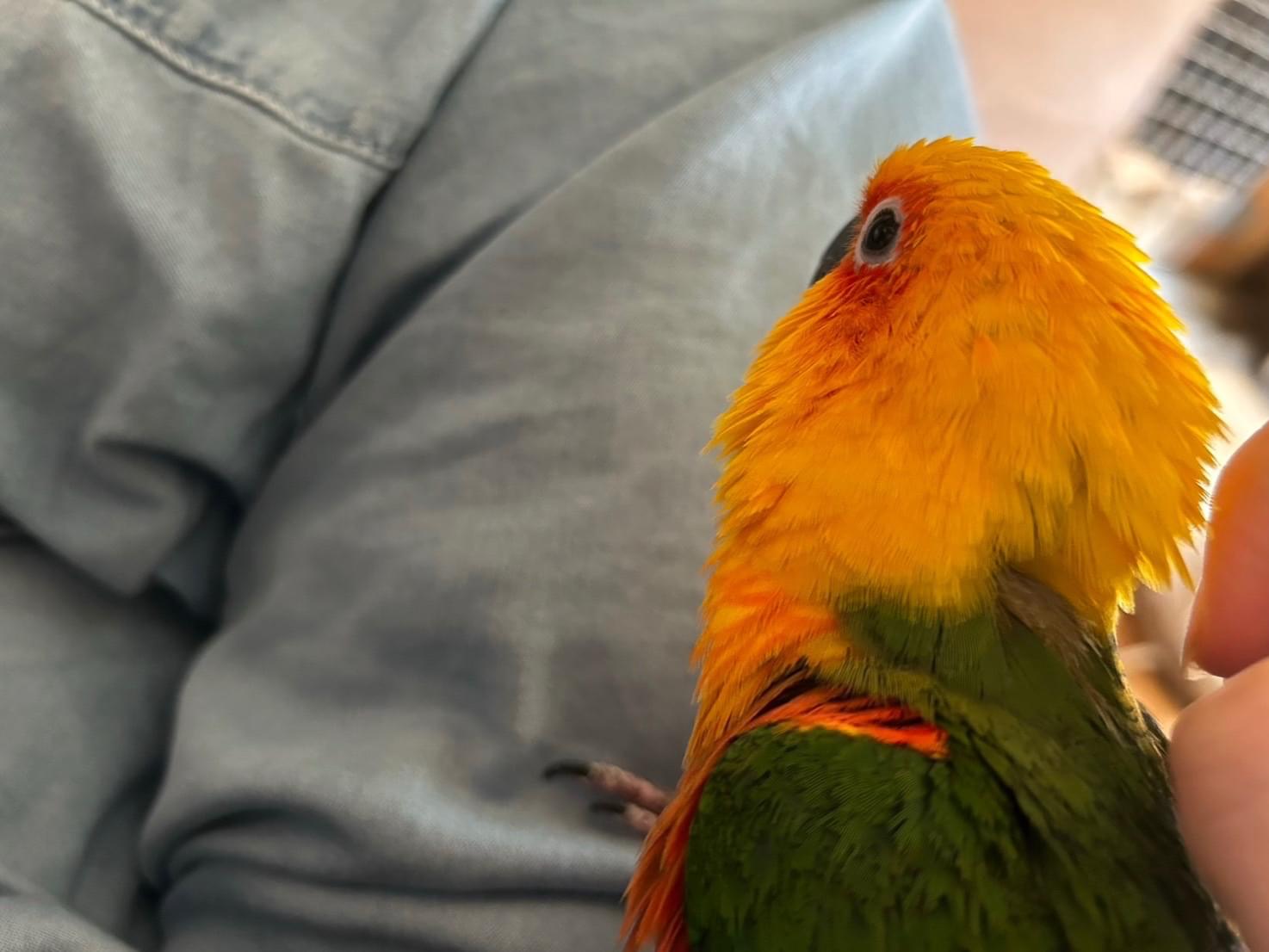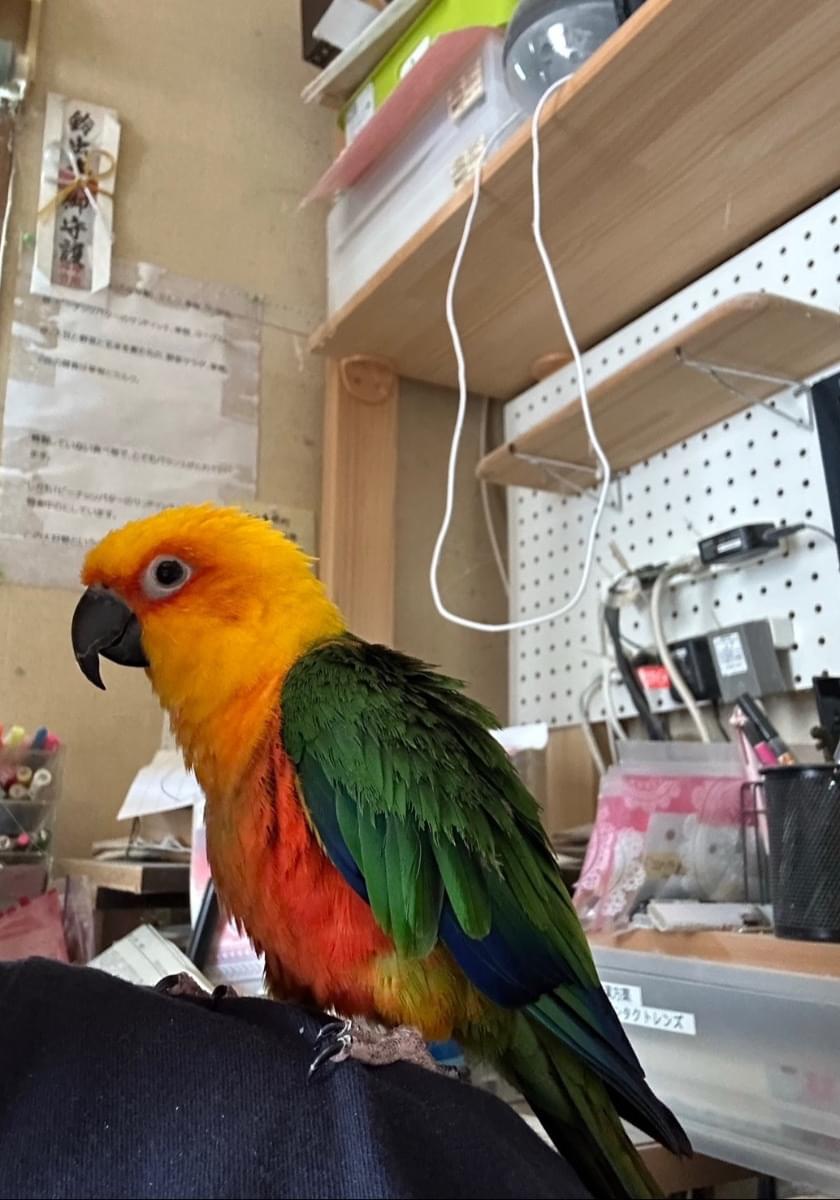 見た目: 自分の羽を噛む癖があり、肩の辺りの羽がボサボサ