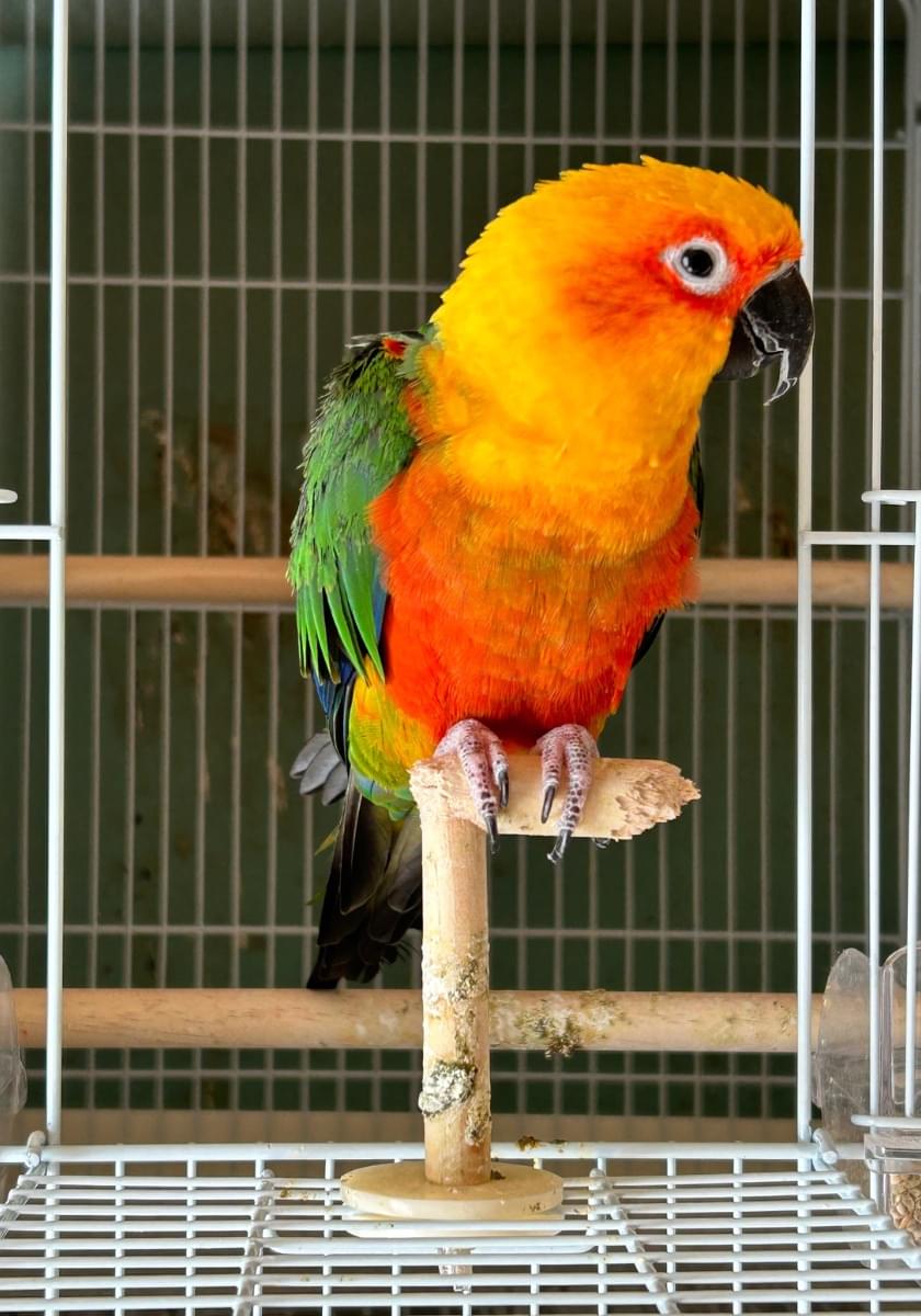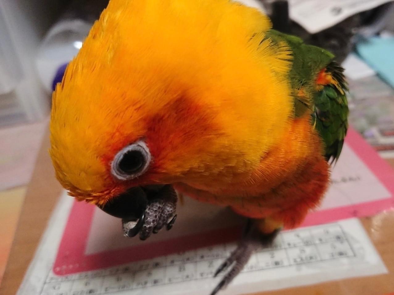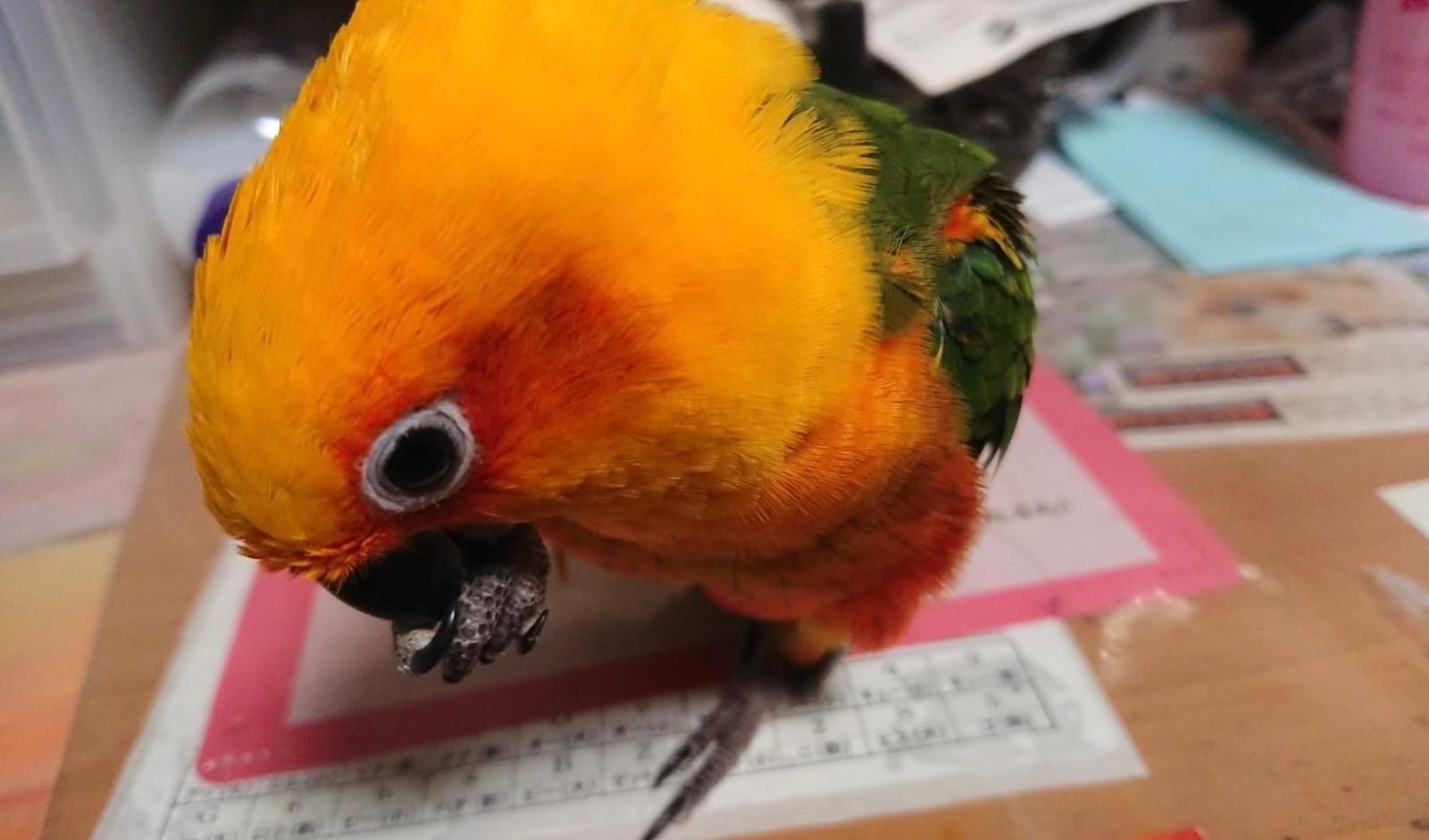 見た目: 自分の羽を噛む癖があり、肩の辺りの羽がボサボサ
