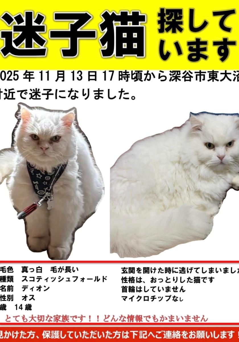 とても大切な家族なので見かけた方、保護していただいてる方がいらっしゃいましたら、どんな情報でもかまいませんのでご連絡下さい。