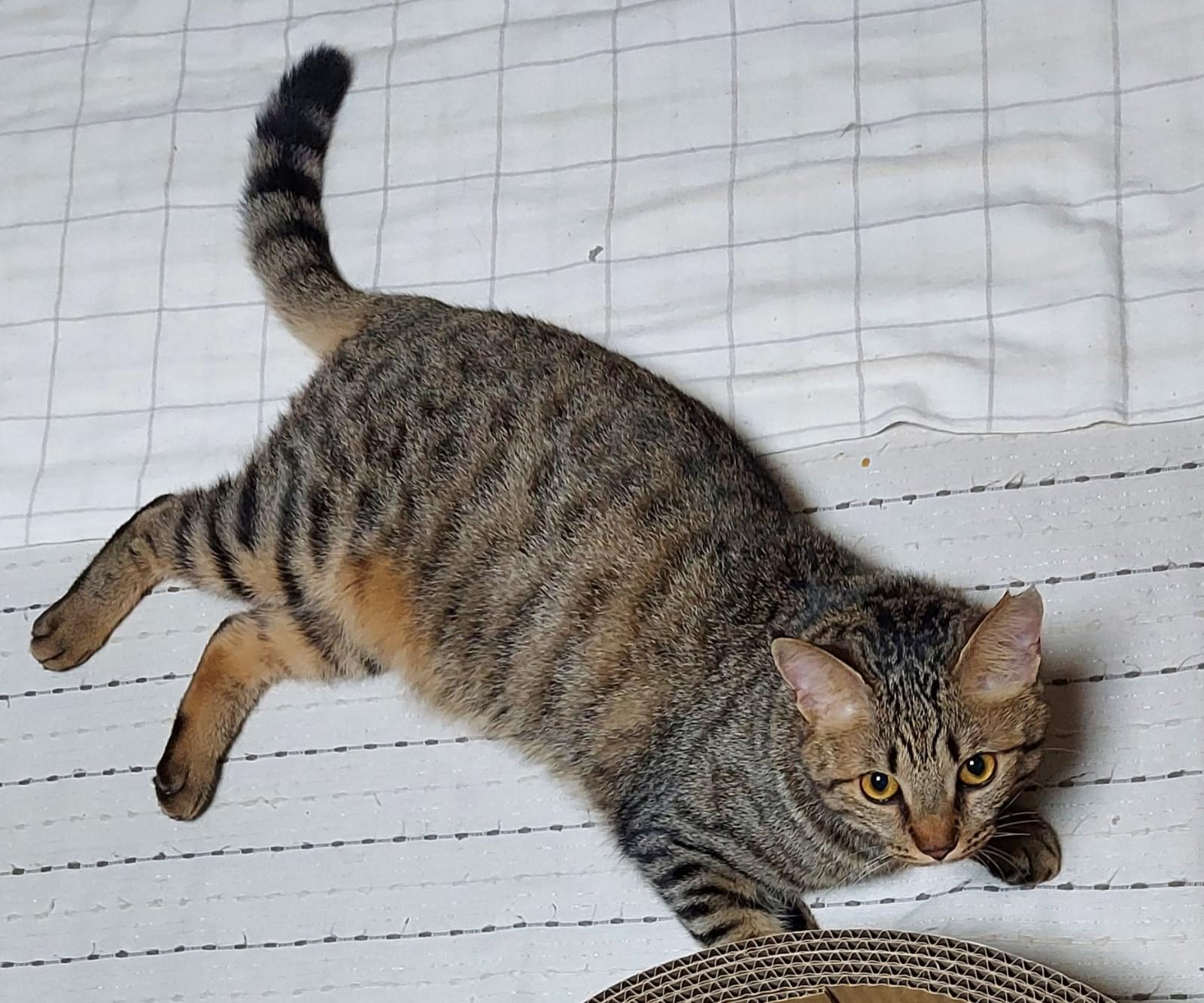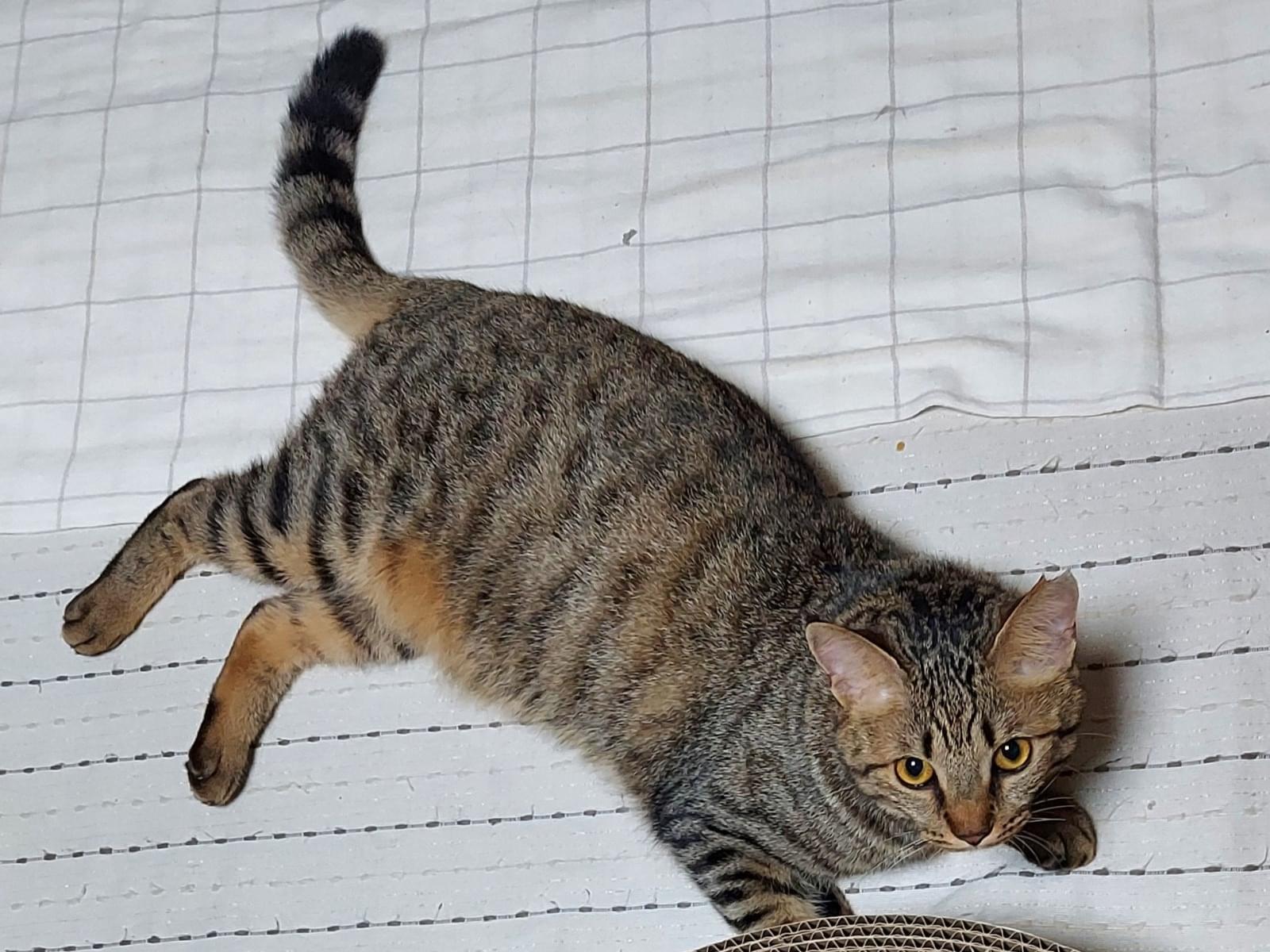 キジトラで胴からお尻にかけて斑点柄になっており、長尾、6㎏のメスです。