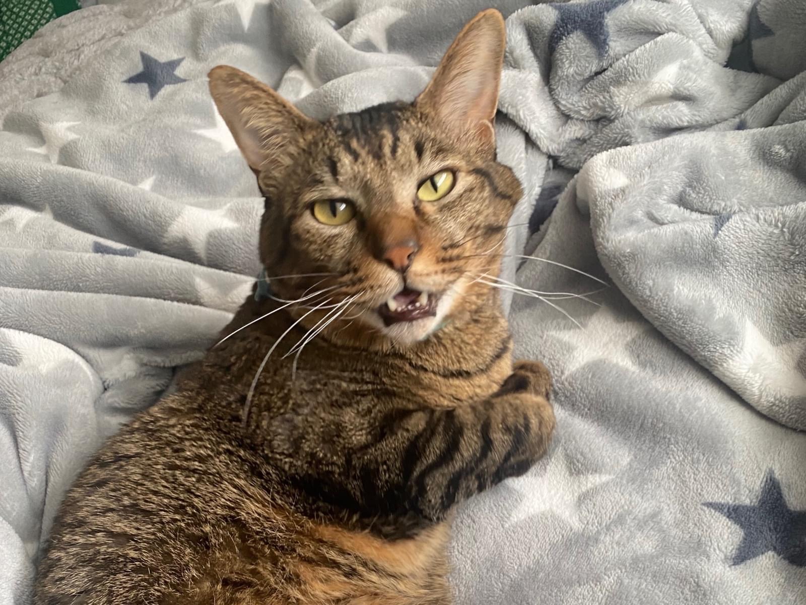首輪をしており青い生地に斜め四角のデザインが並んだものを着用しています。オス、去勢済みです。手足は大きめです。