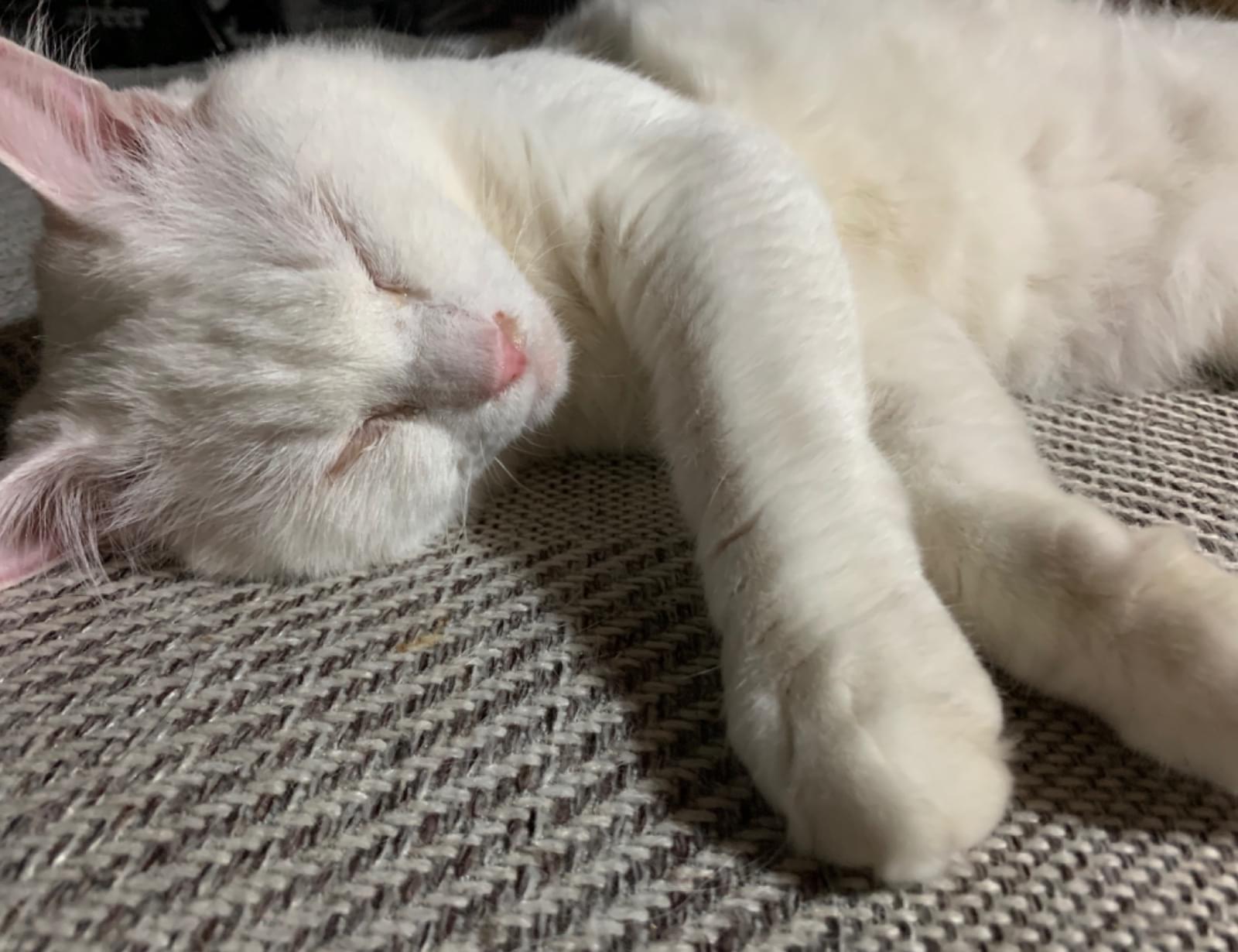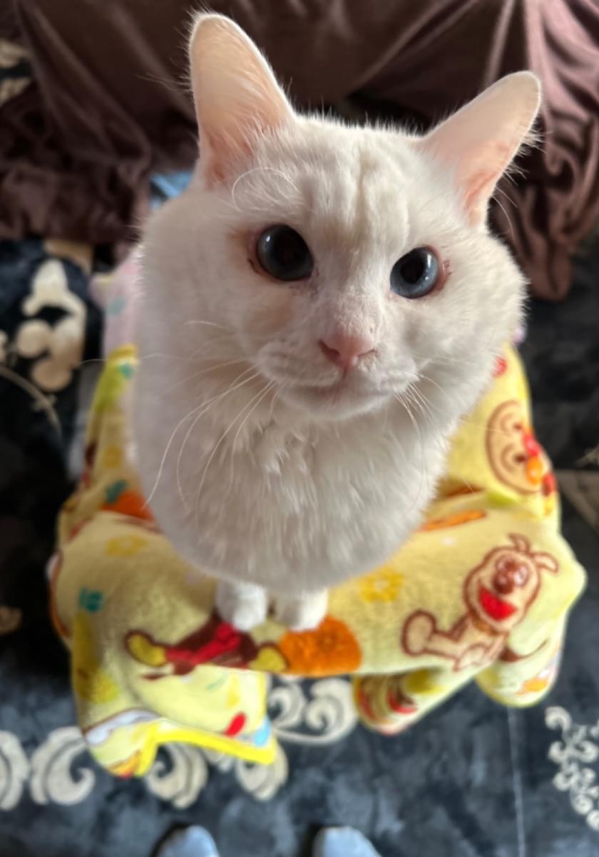 白猫、目は青色、右耳辺りの毛が少し立ってます。首輪は付けていません。野良経験があり、人懐こい性格です。名前を呼ぶと返事をする事があります。大切な家族です。見かけた方はご連絡をお願いします。