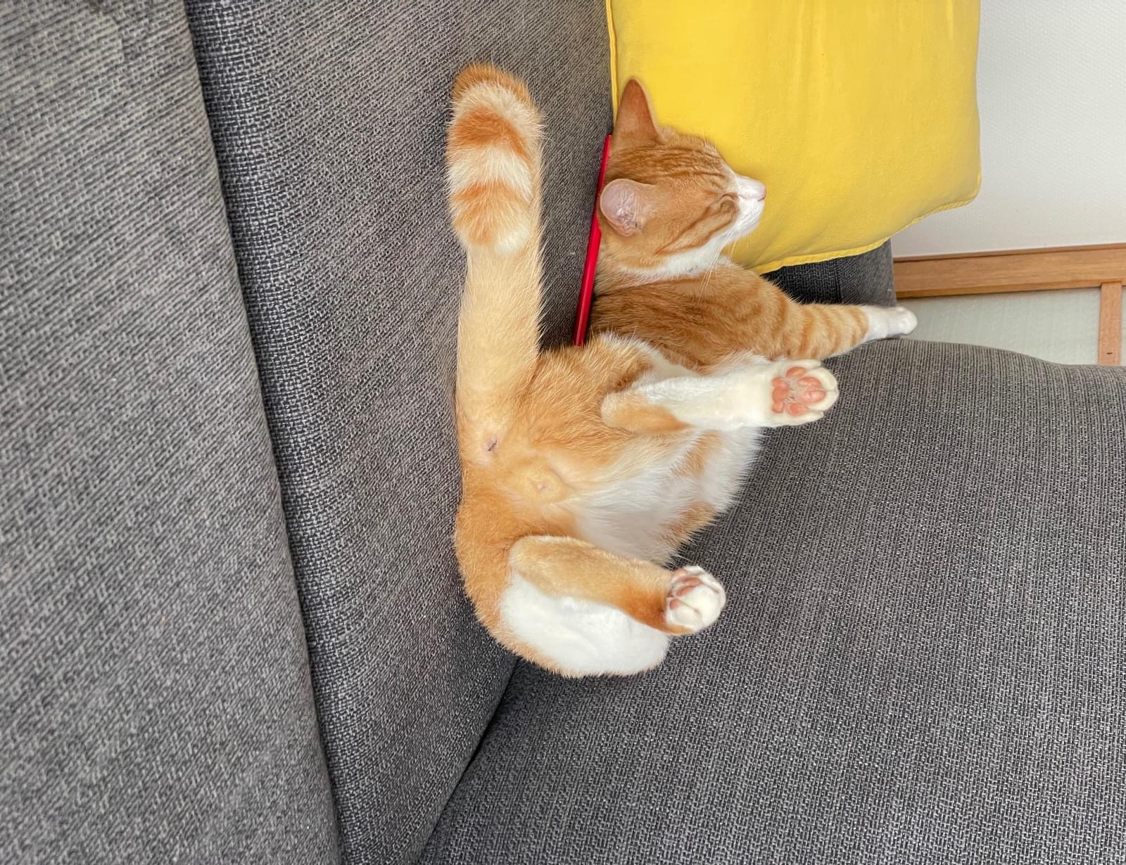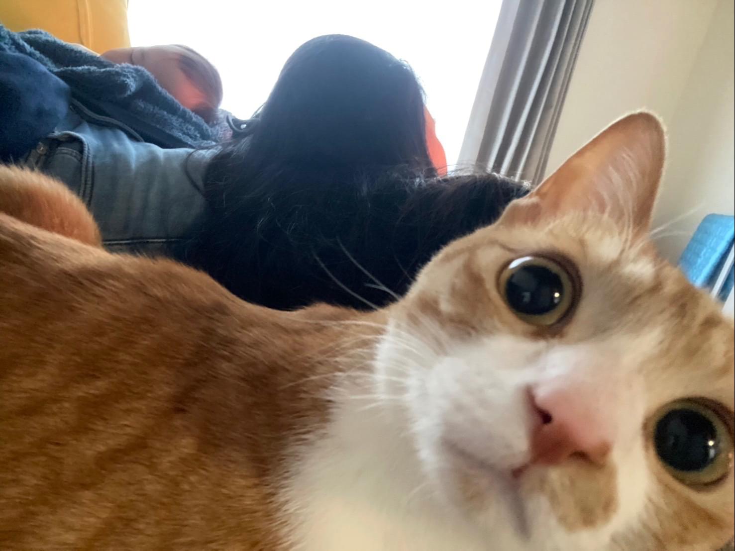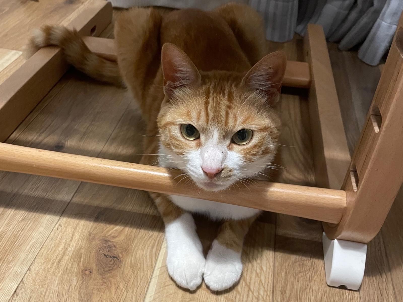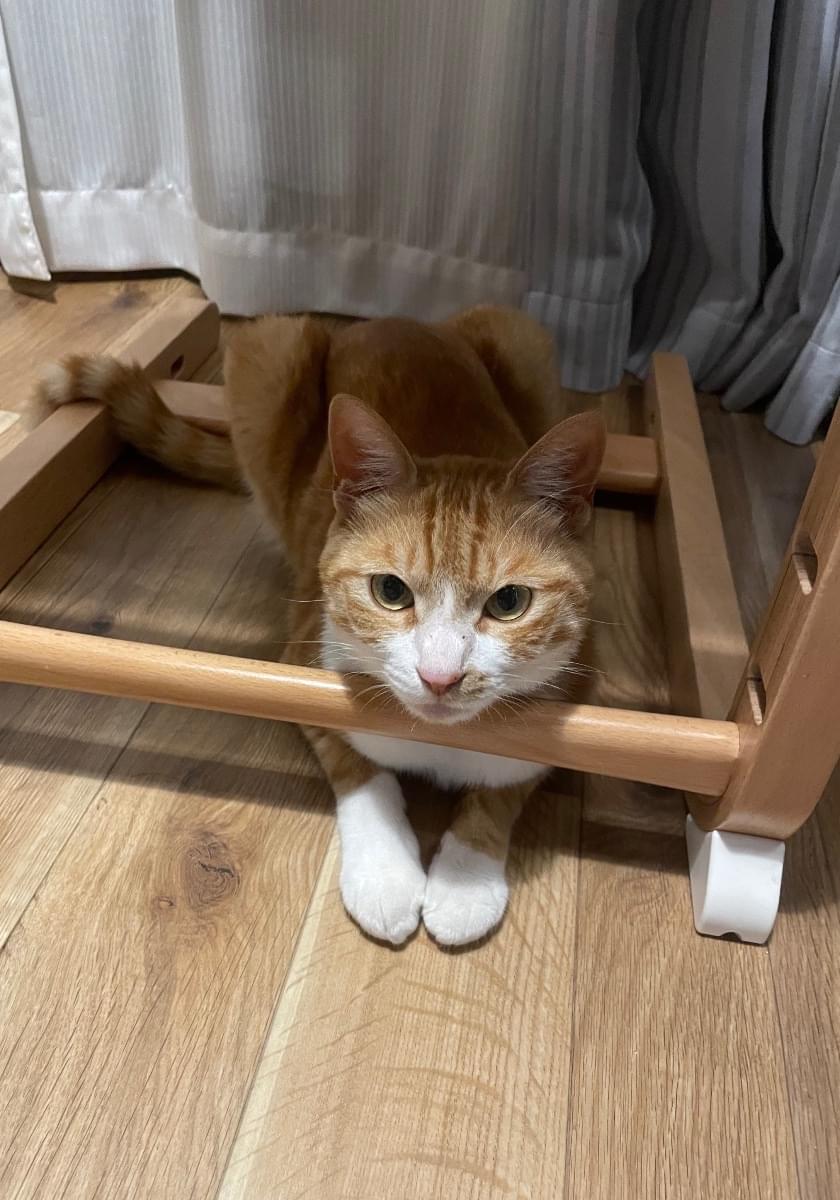 お腹が白い茶トラで青色の鈴のついた首輪をしています。