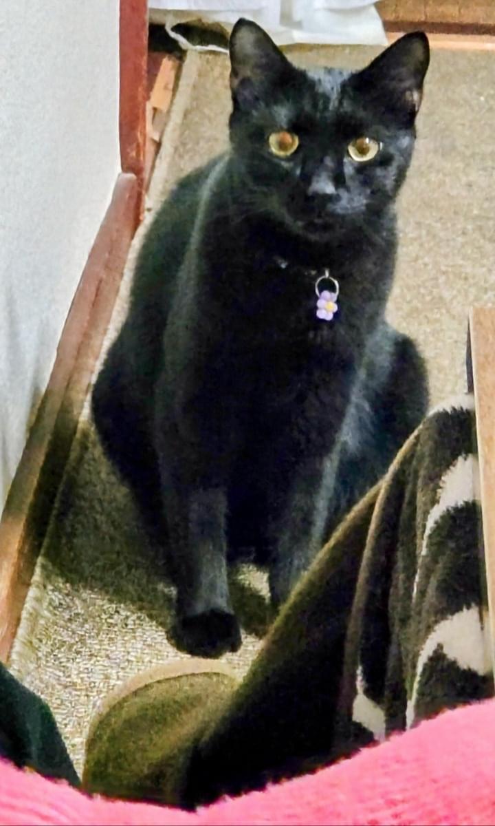 目が黄色くて大きくシッポと足が長い黒猫を探しています