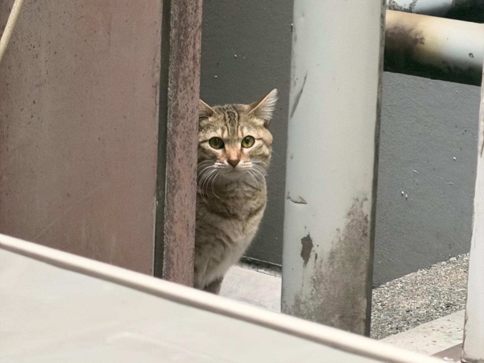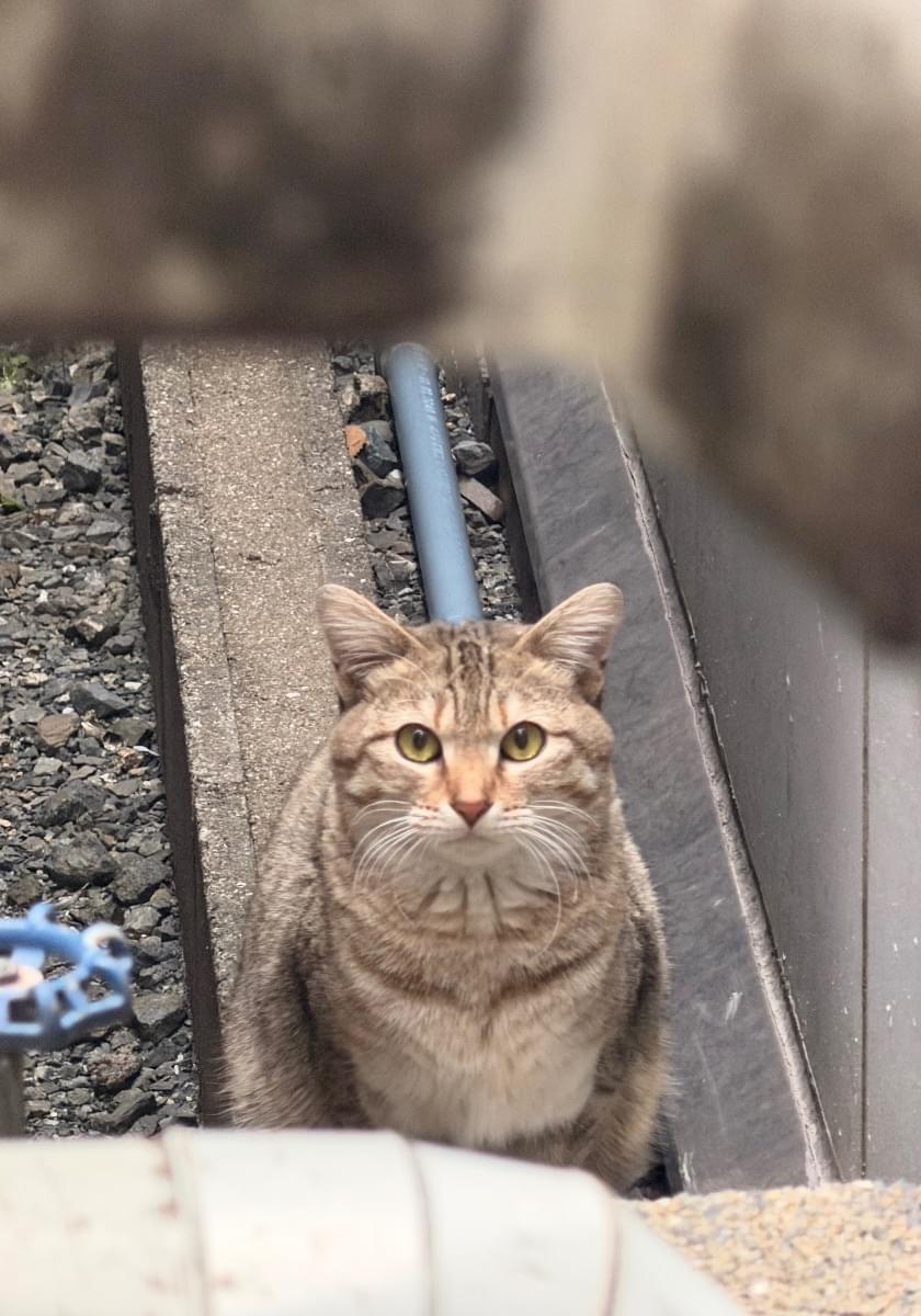 さくらカットされていない迷い猫と思われる茶、グレーのねこ