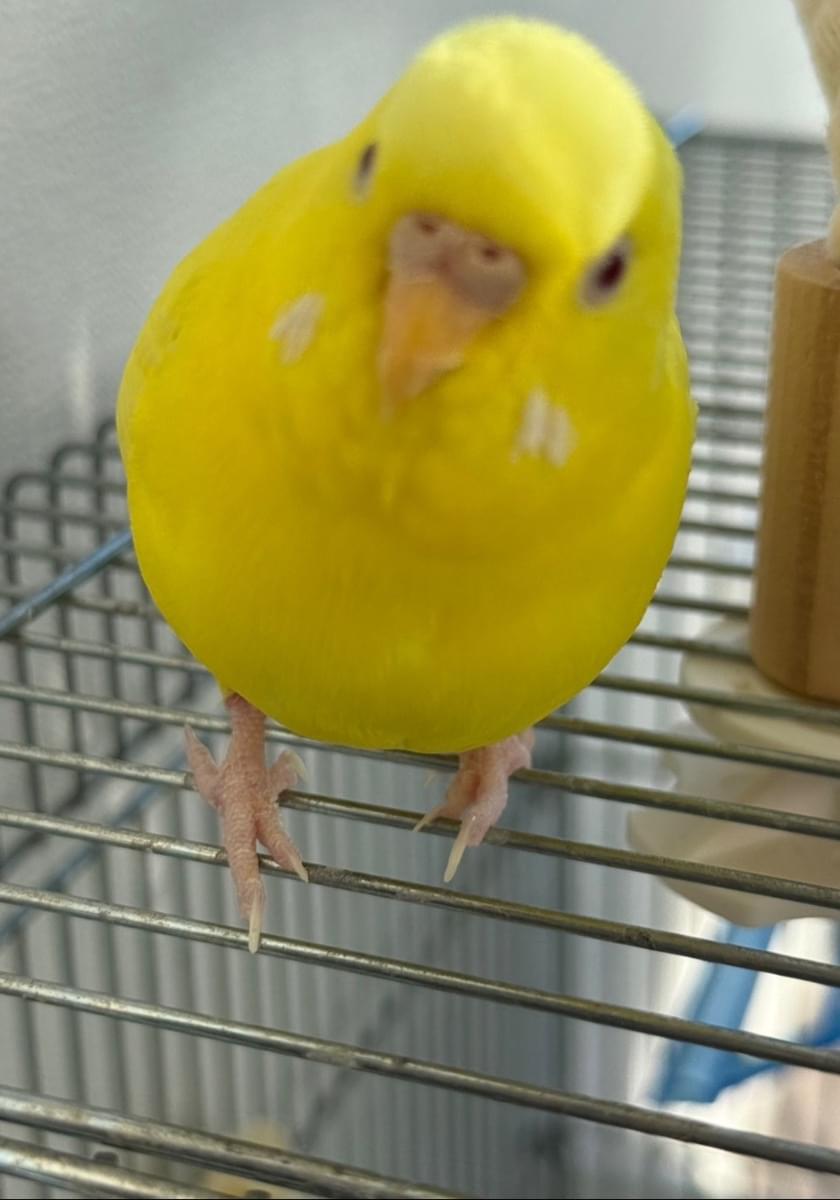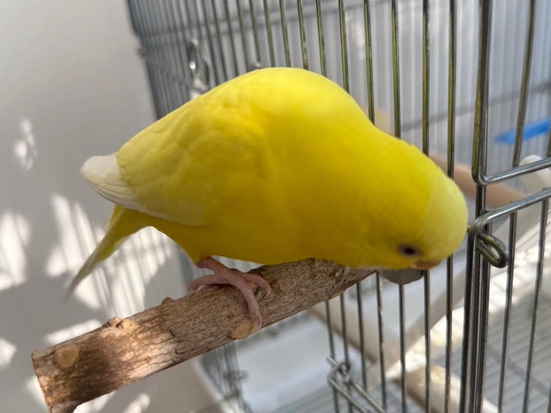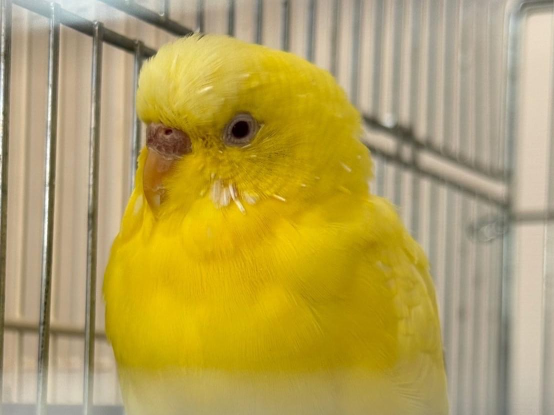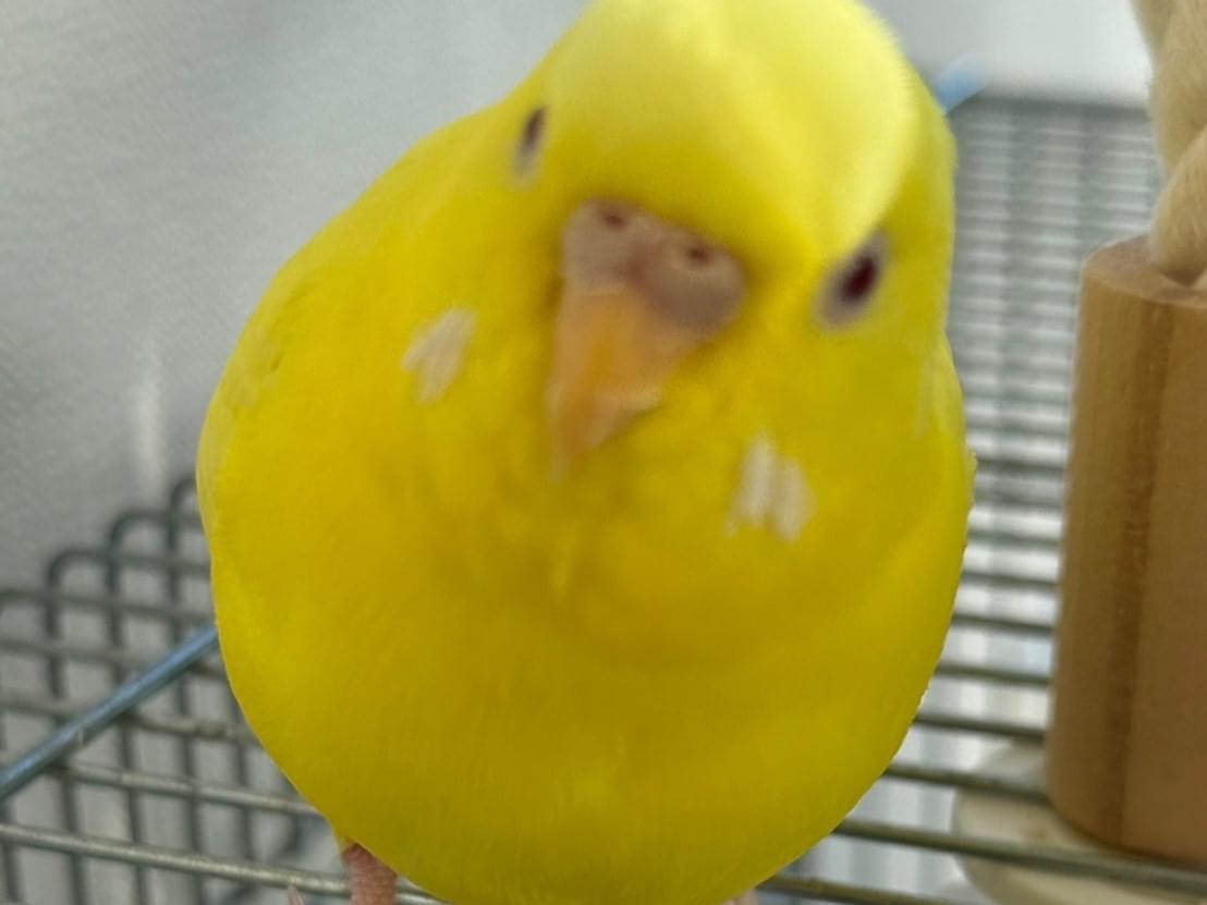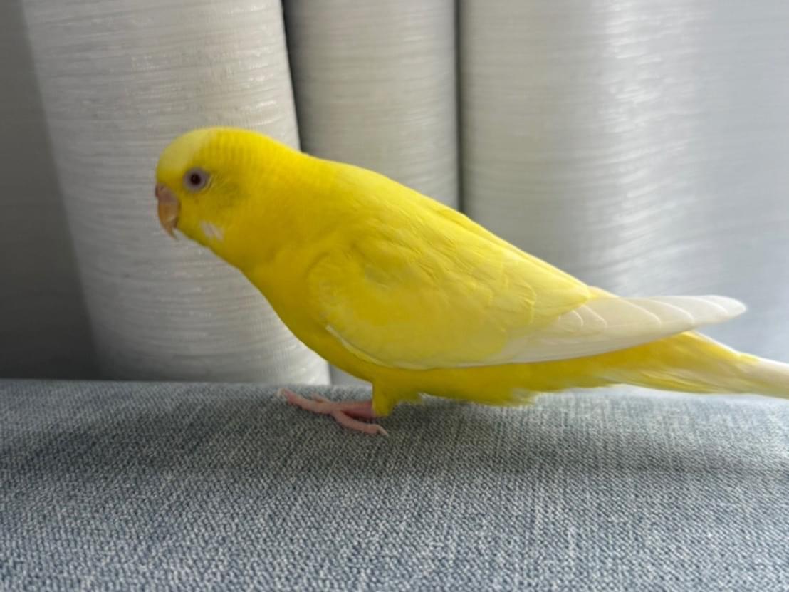 色は黄色です。目が少し暗い赤、比較的おとなしい方だと思います。口で「っぱ」と音を鳴らしてあげると、少し反応してくれます。少し発情期気味です。