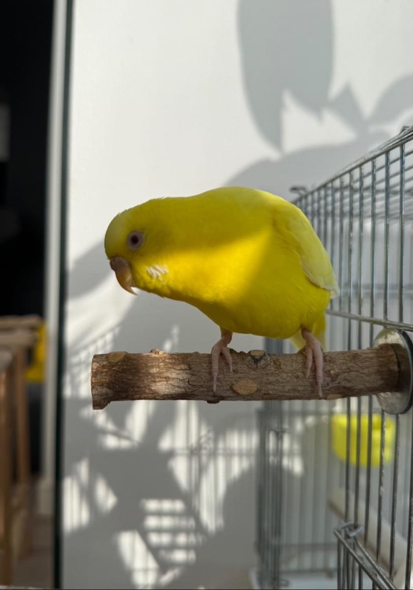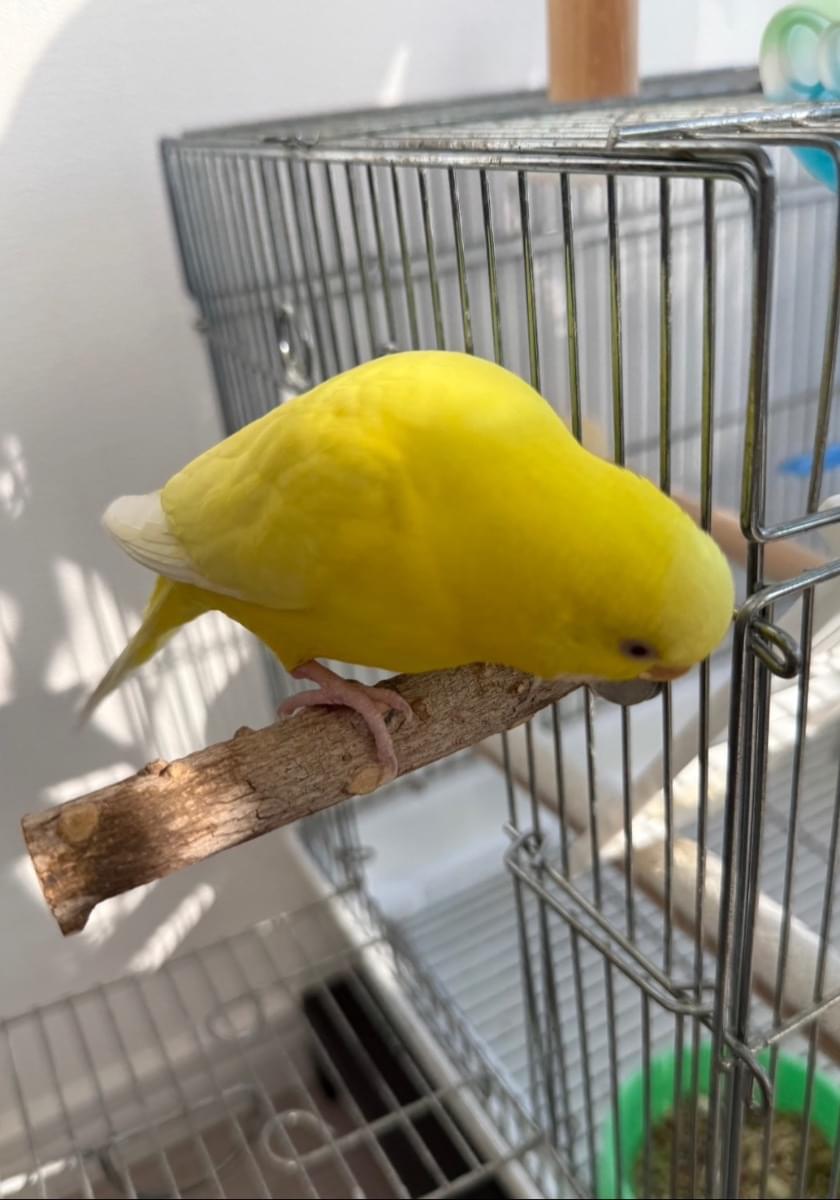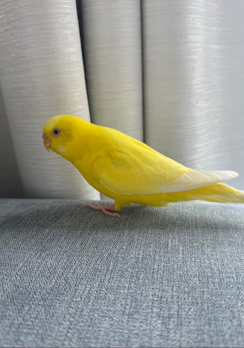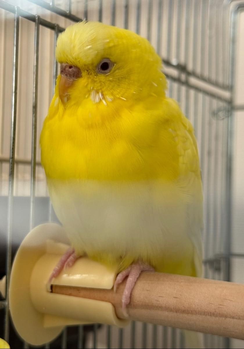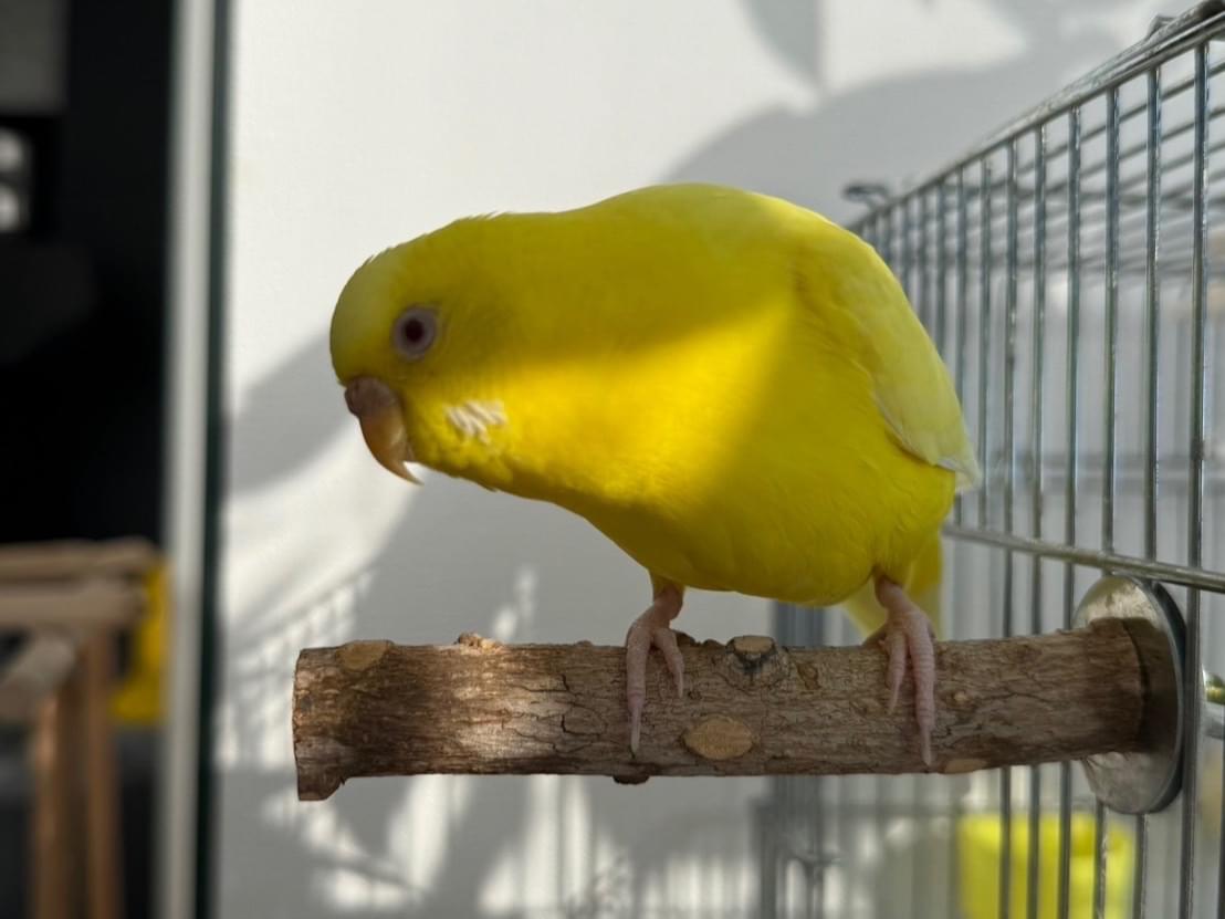 色は黄色です。目が少し暗い赤、比較的おとなしい方だと思います。口で「っぱ」と音を鳴らしてあげると、少し反応してくれます。少し発情期気味です。