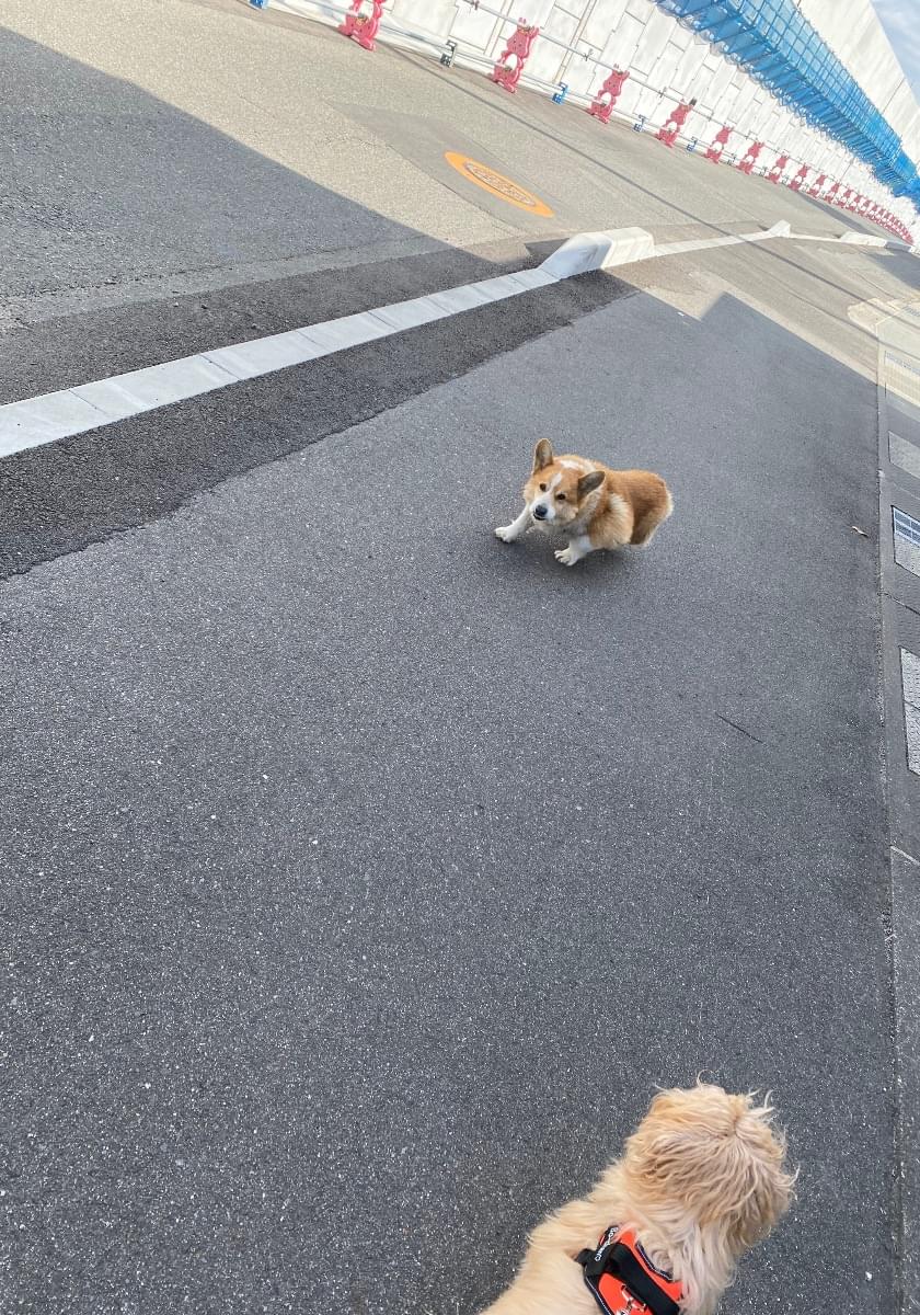 ピンク色の首輪 コーギー おそらくオス