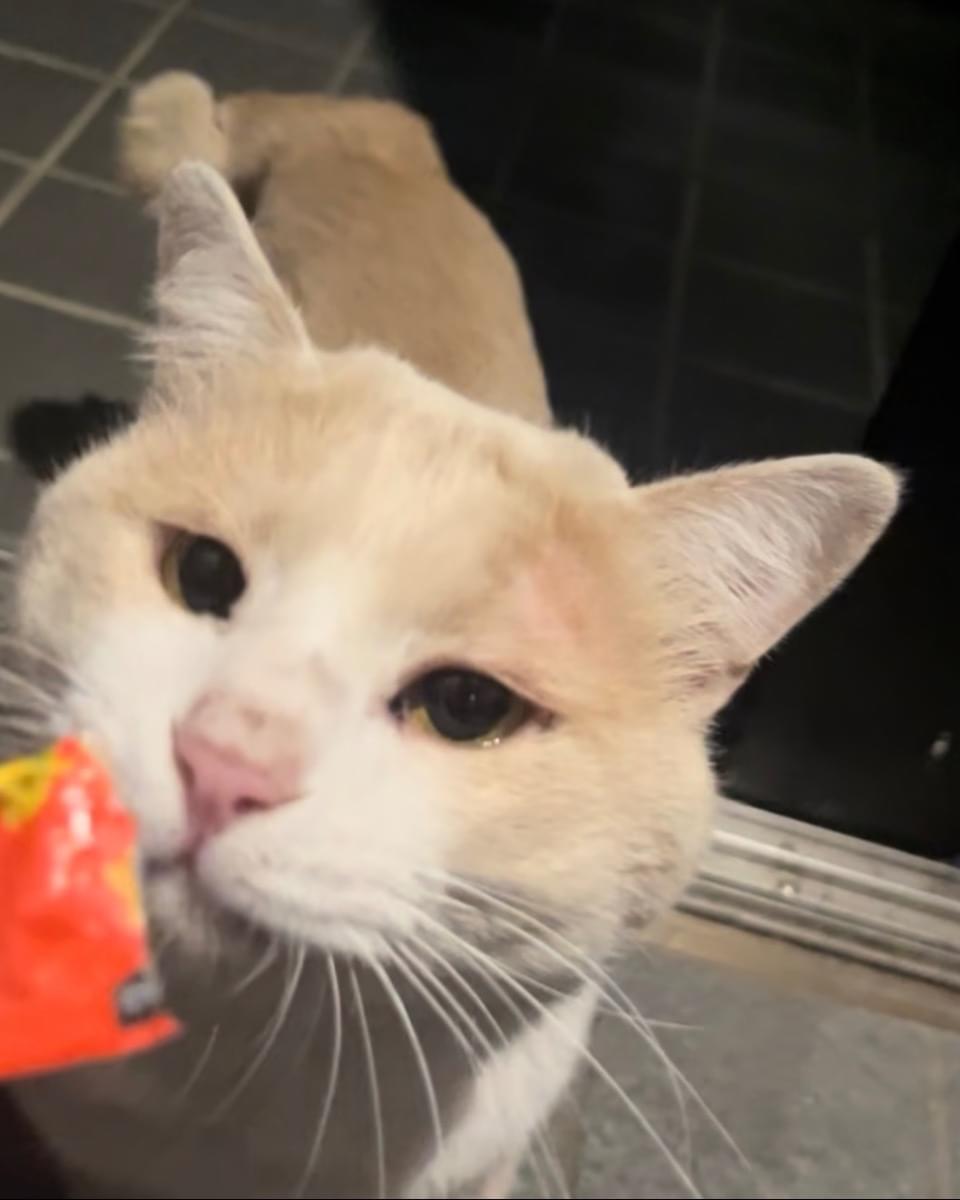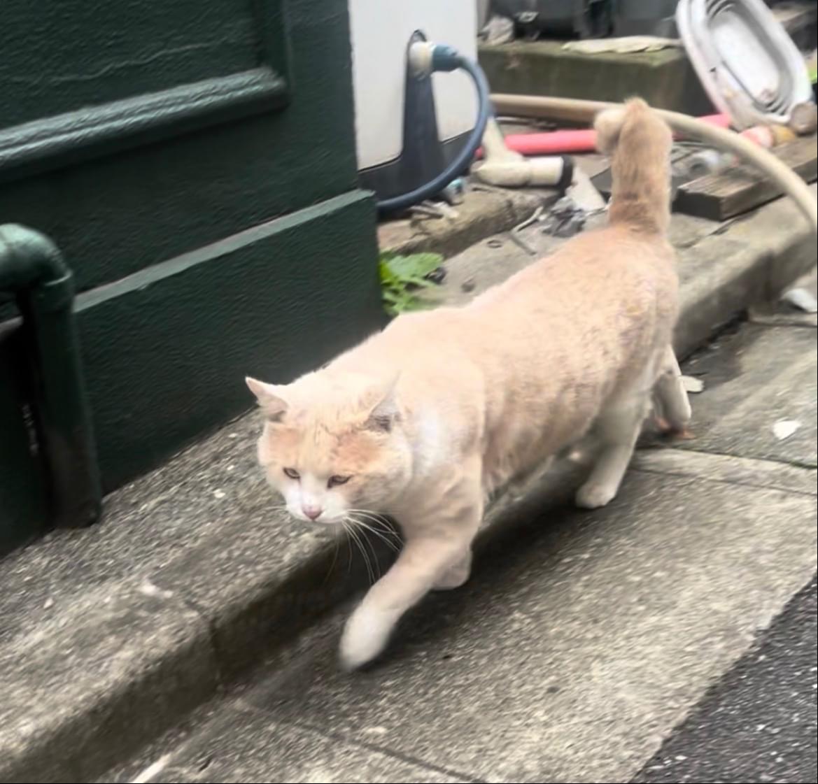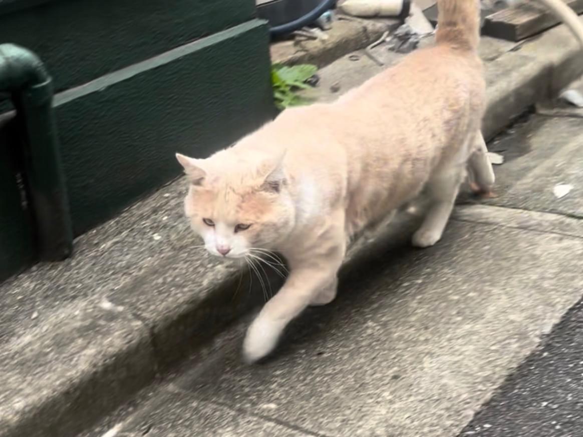 野良猫には珍しいクリーム色の猫です。体も大きく顔も大きいです。声は低いです。顔も声も特徴的で印象に残ります。