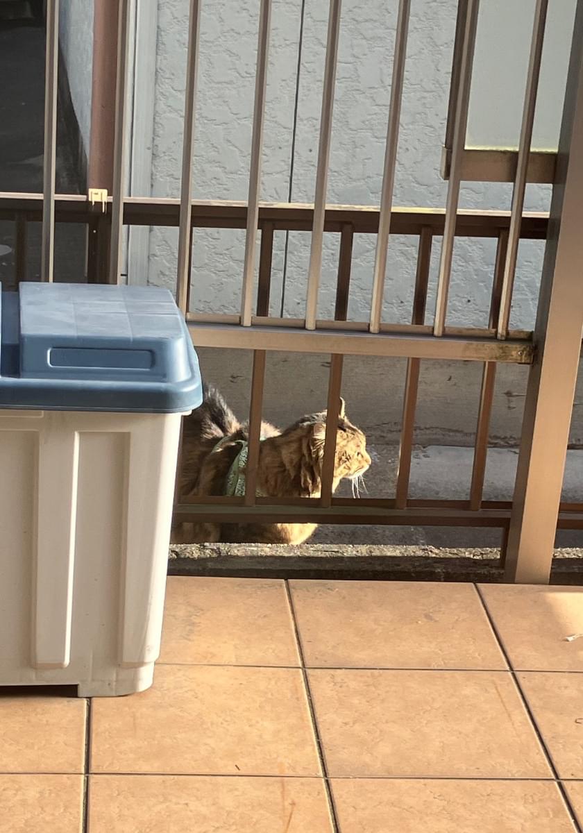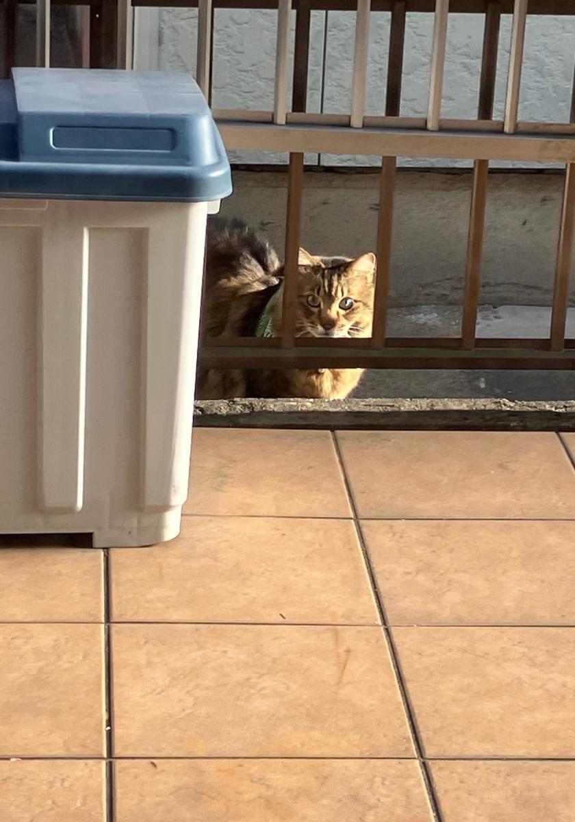 緑の唐草模様の首輪(ハーネス型)をした、大きめの長毛の猫さんです。15時頃、お庭に現れたあと、リードを引きずって歩き去ってしまいました。