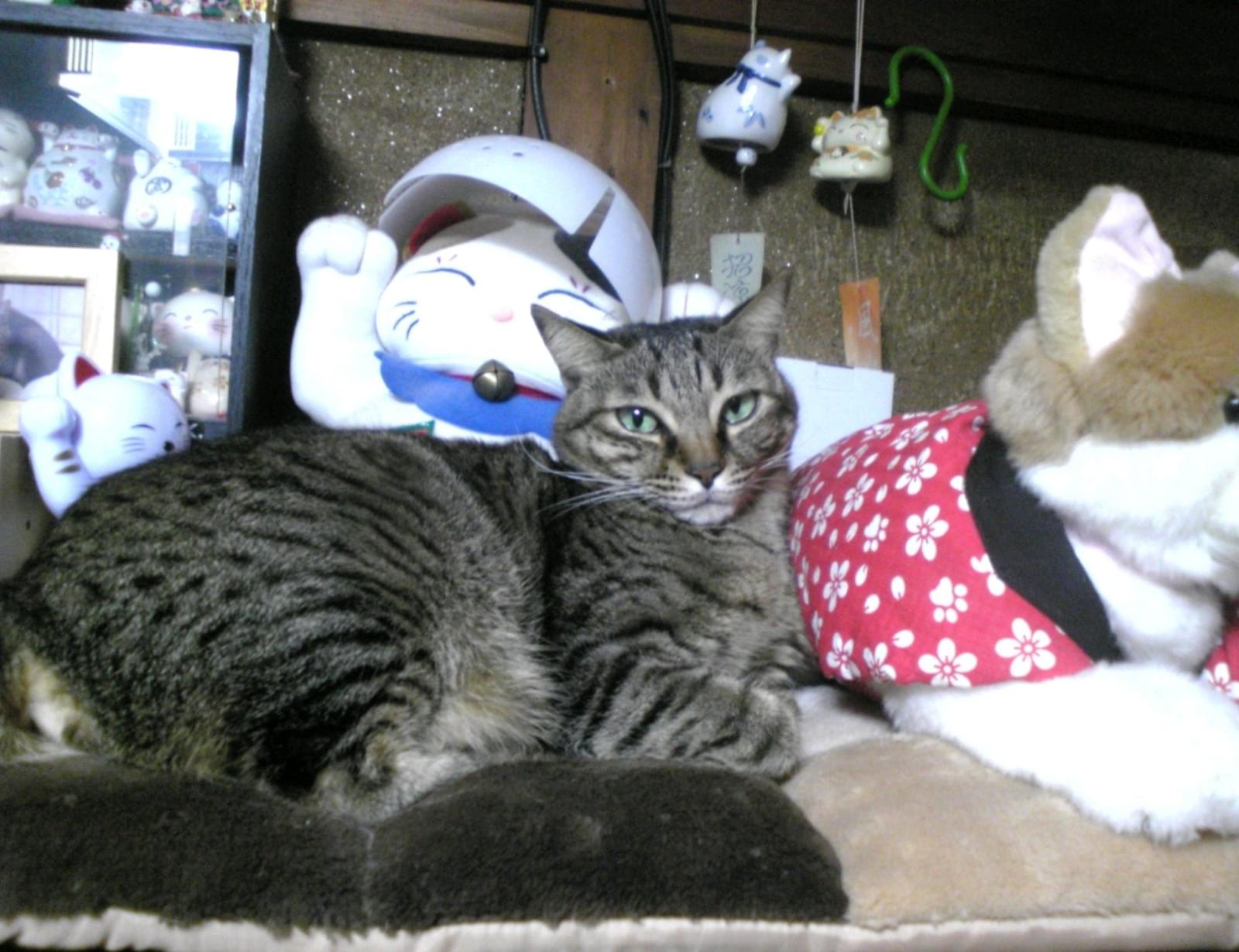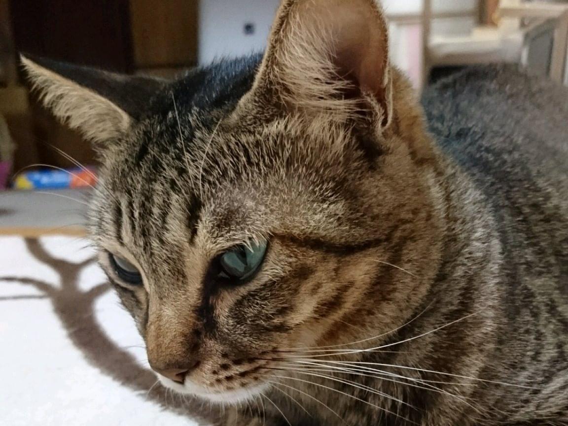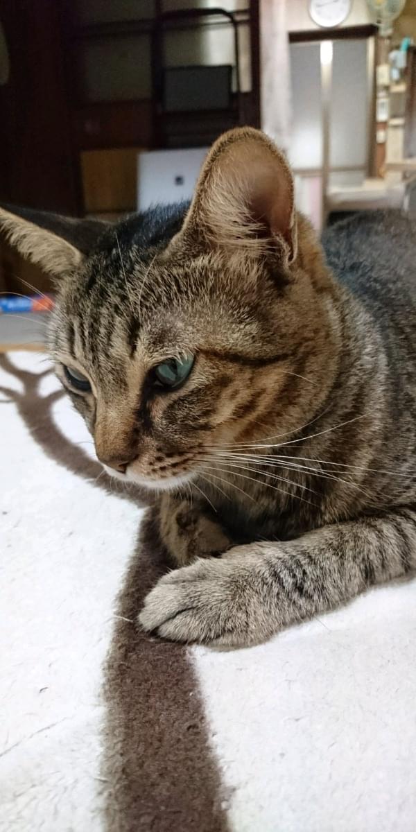 色は濃い目のキジトラ。角度によっては黒っぽくも見えます