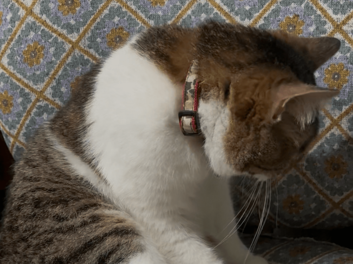 首輪に鈴と金属プレートあり(電話番号が記載)