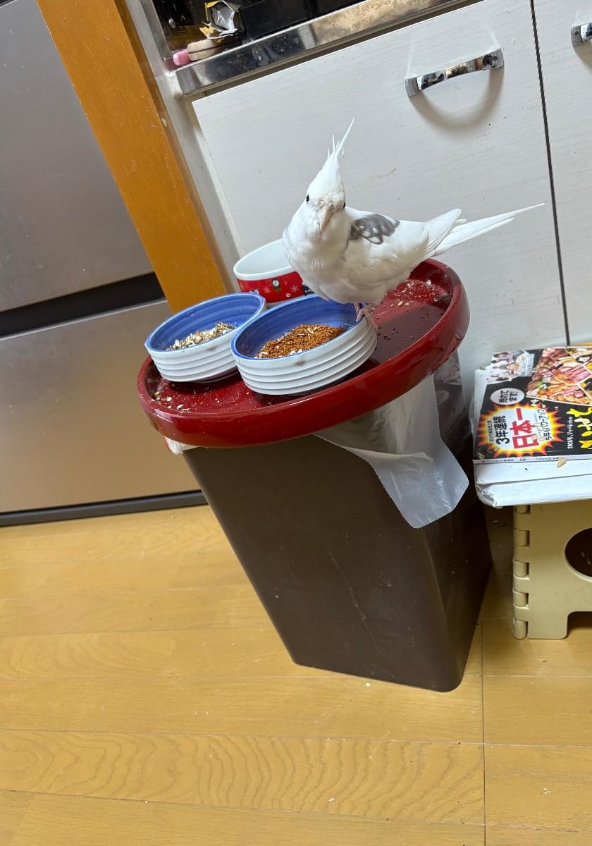 白いオカメインコです。名前を呼ぶと鳴きます。口笛が大好きで人懐っこい性格です。