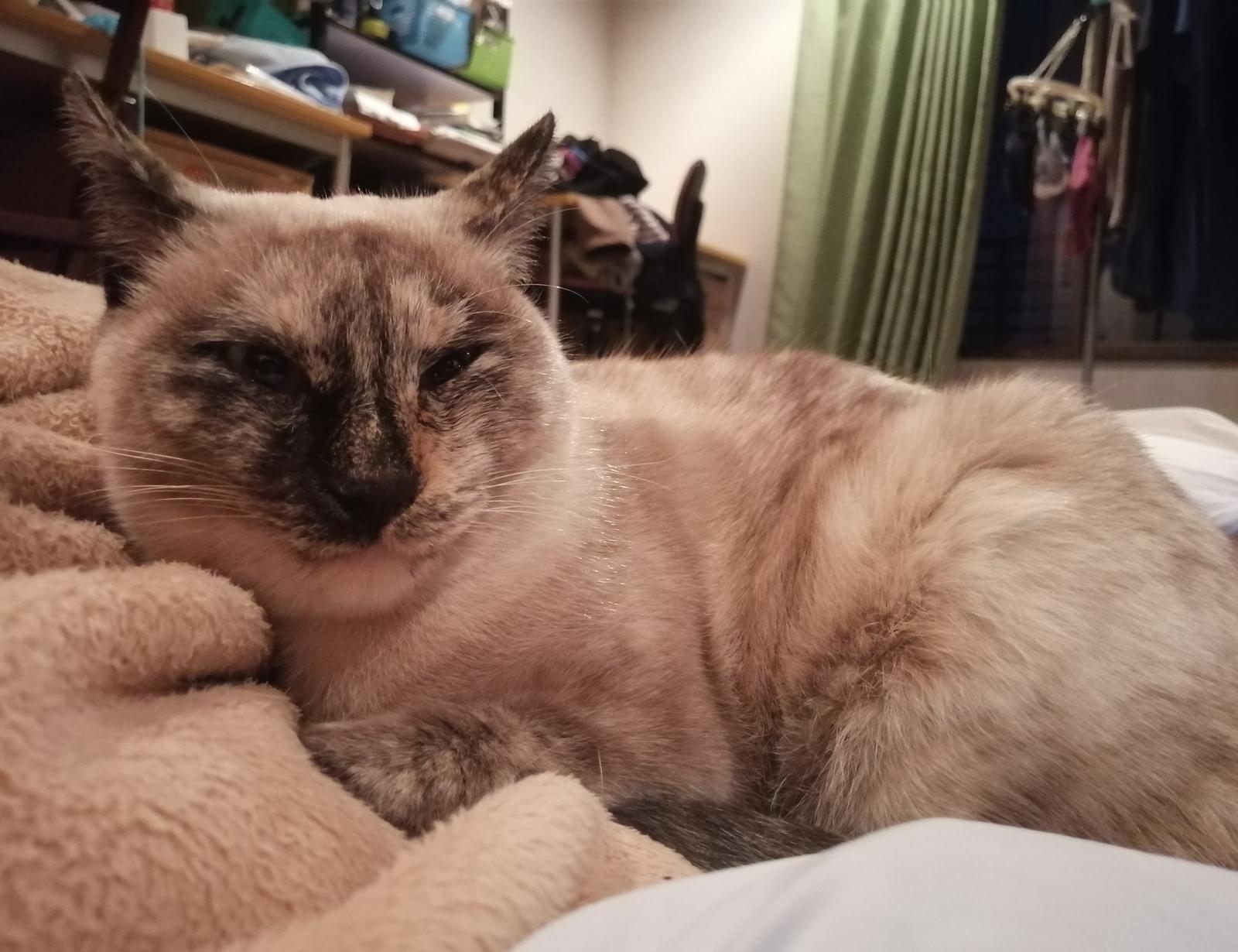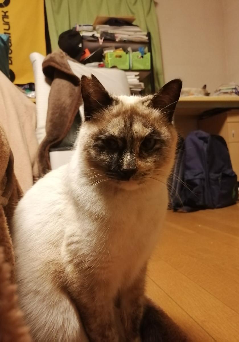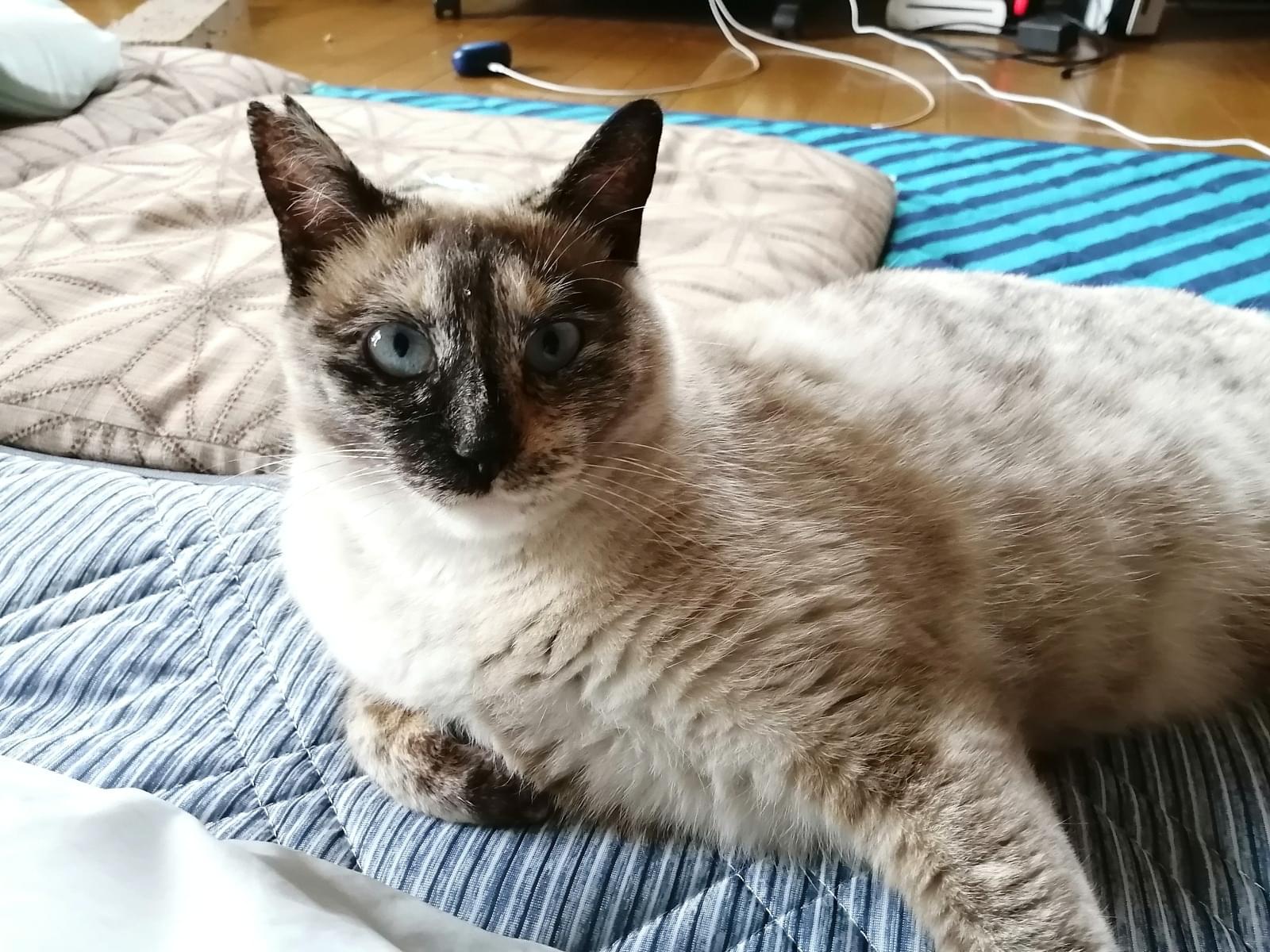 雑種の元野良猫で、外見はサビシャム。サクラカットあり。避妊手術済み。