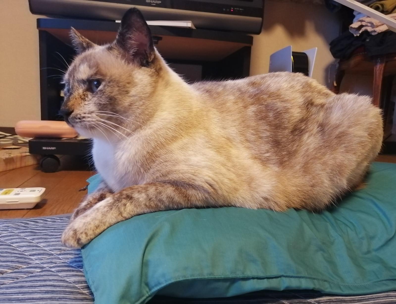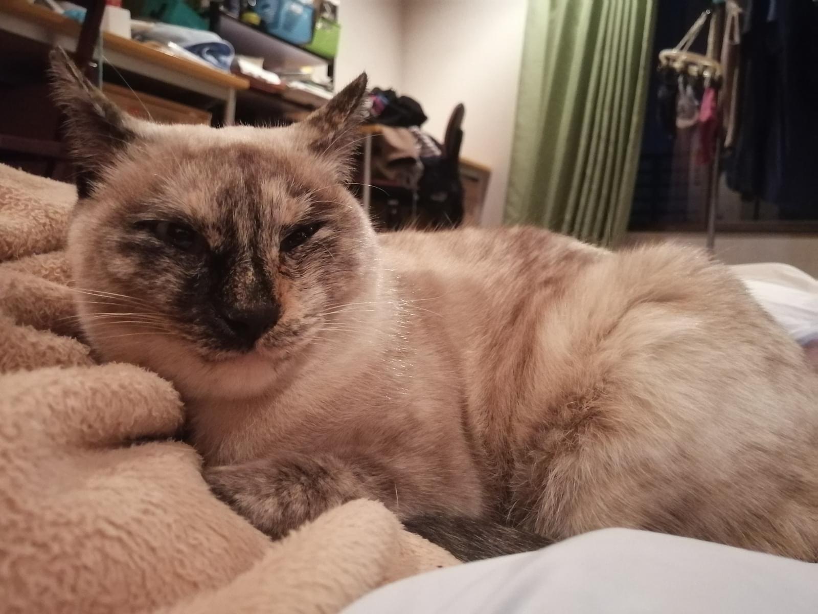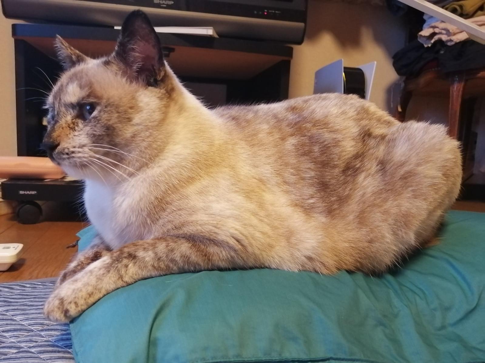 雑種の元野良猫で、外見はサビシャム。サクラカットあり。避妊手術済み。