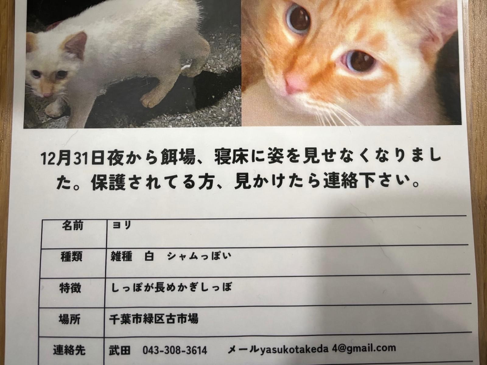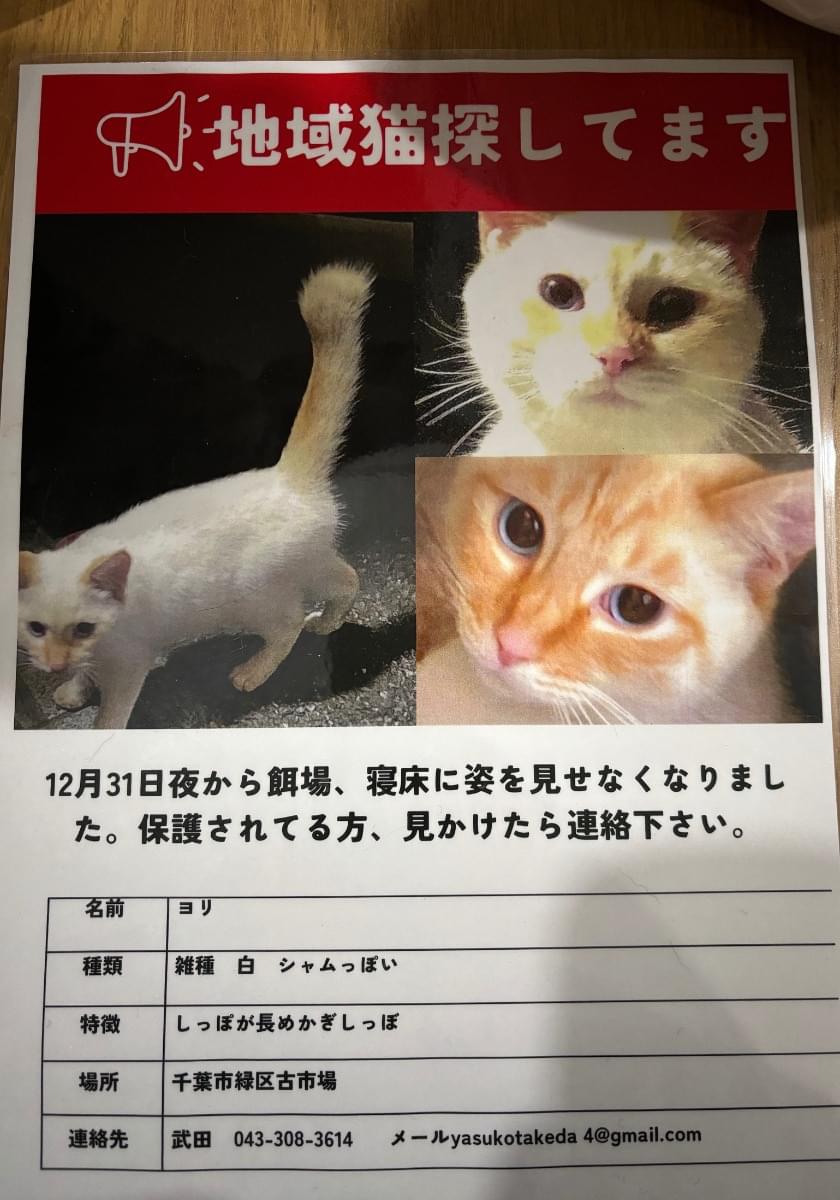 ホーム迷子猫千葉県地域猫探してます地域猫探してます管理編集するポスター掲載終了最終更新日時:2026/01/13 23:08写真情報用件迷子名前ヨリ性別オス年齢2~3歳場所千葉県 千葉市緑区古市場町発生日時2025年12月31日(水)飼い主タケダ説明しっぽが長めでかぎしっぽで目が青くて顔・耳・手足・しっぽがやや茶色のシャム猫系です。 右耳カットしています。 名前を呼んだら反応はしますが触れません。連絡先URL未設定掲示板情報交換のための掲示板です。ユーザーからの情報提供、オーナーからの連絡などにご利用下さいませ。まだコメントはありません。トピックを作成する