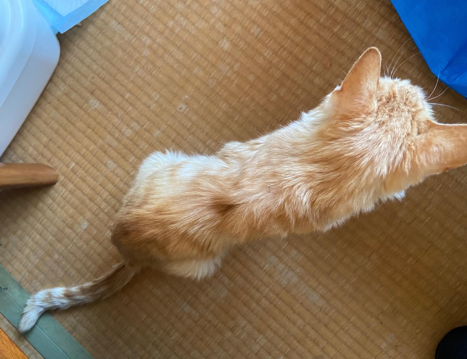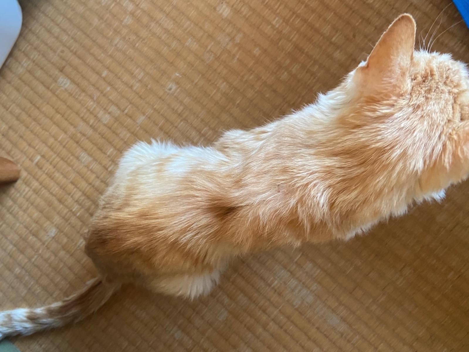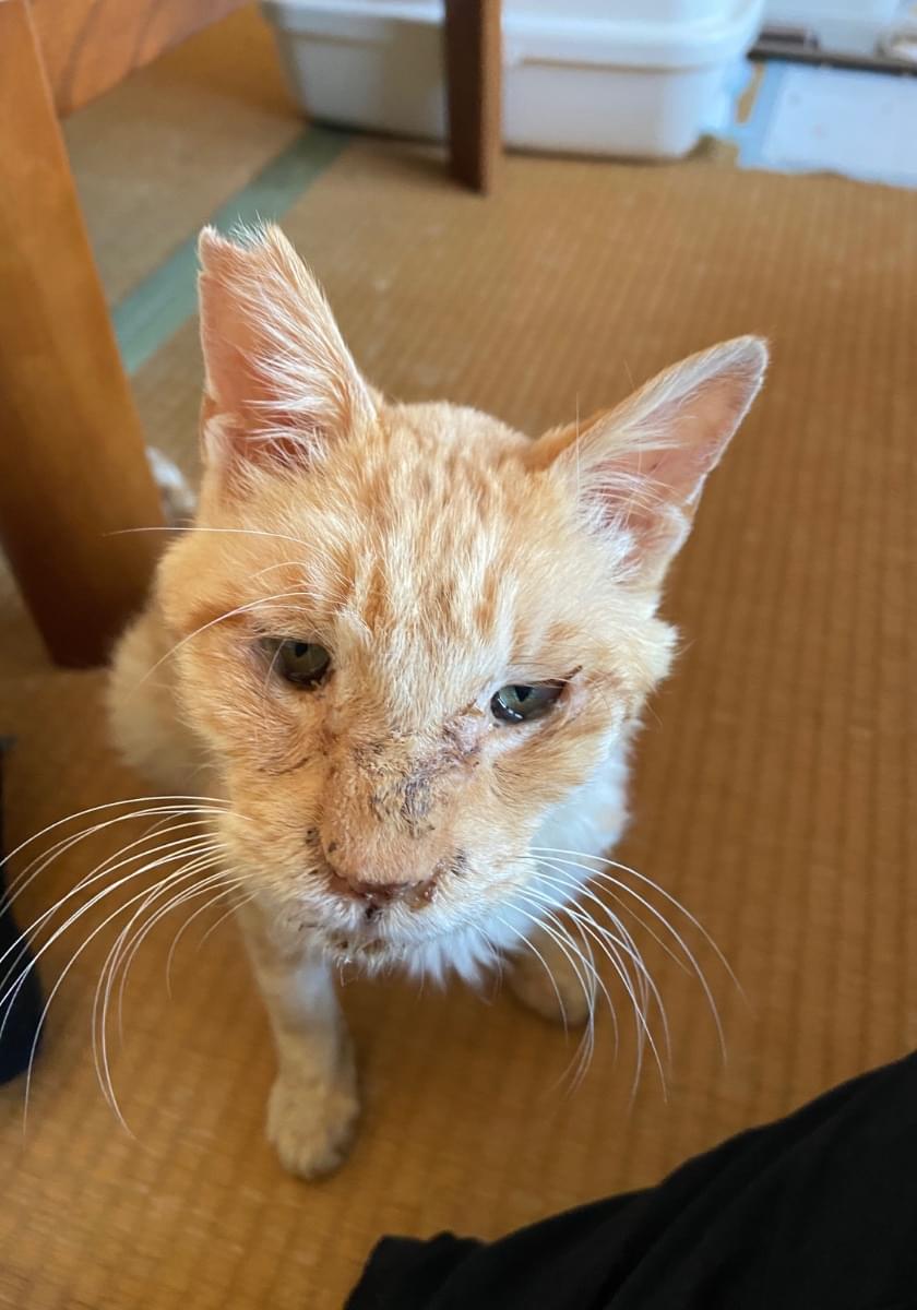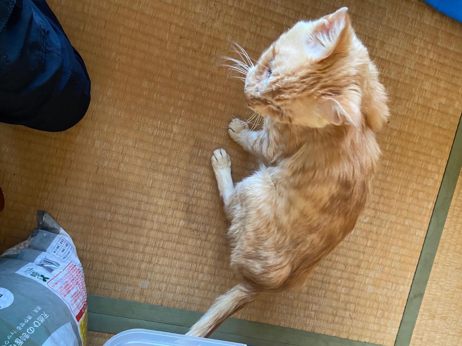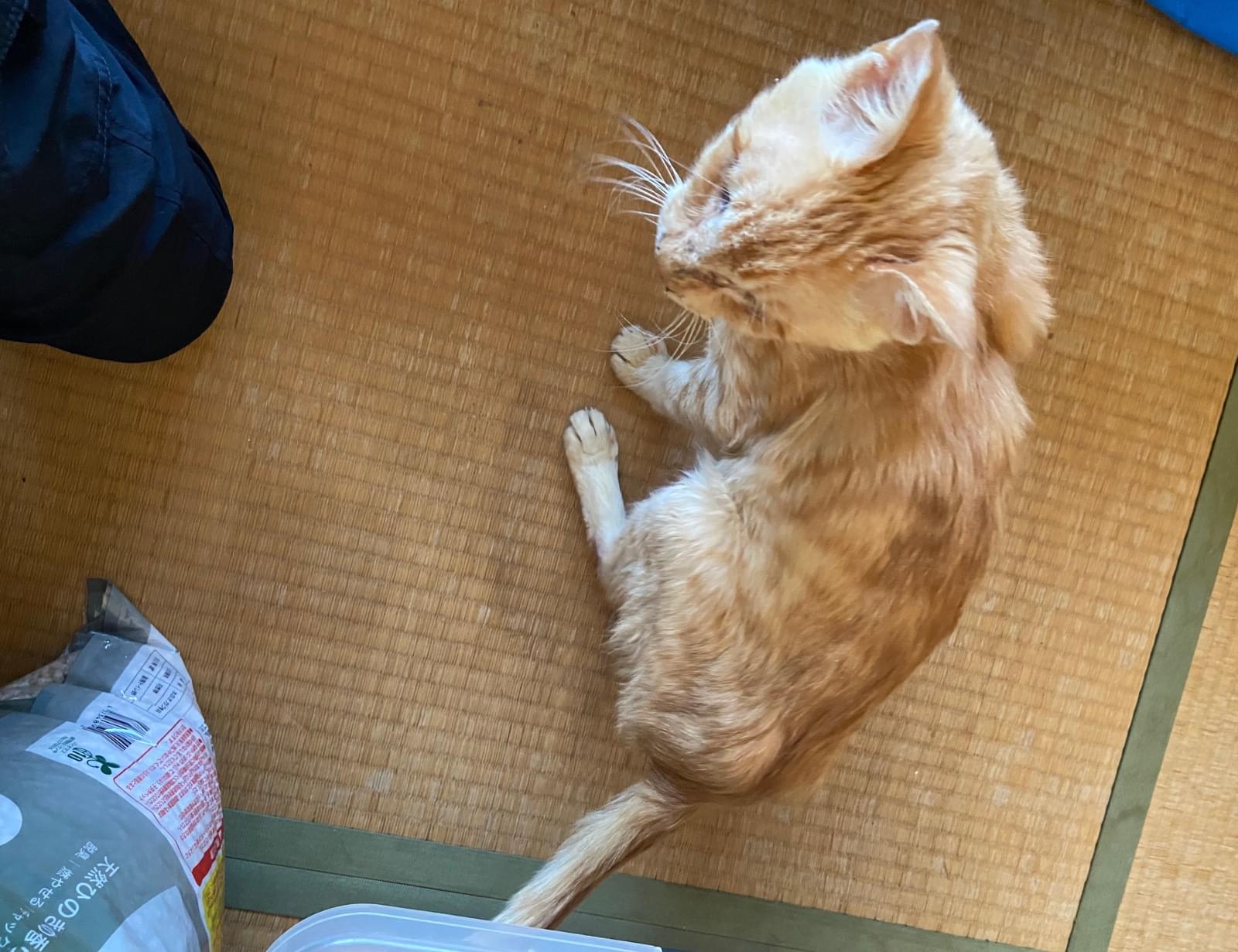 保護してから餌はたくさん食べ、お腹は張ってきましたが、背中等にはまだ肉がついていません。