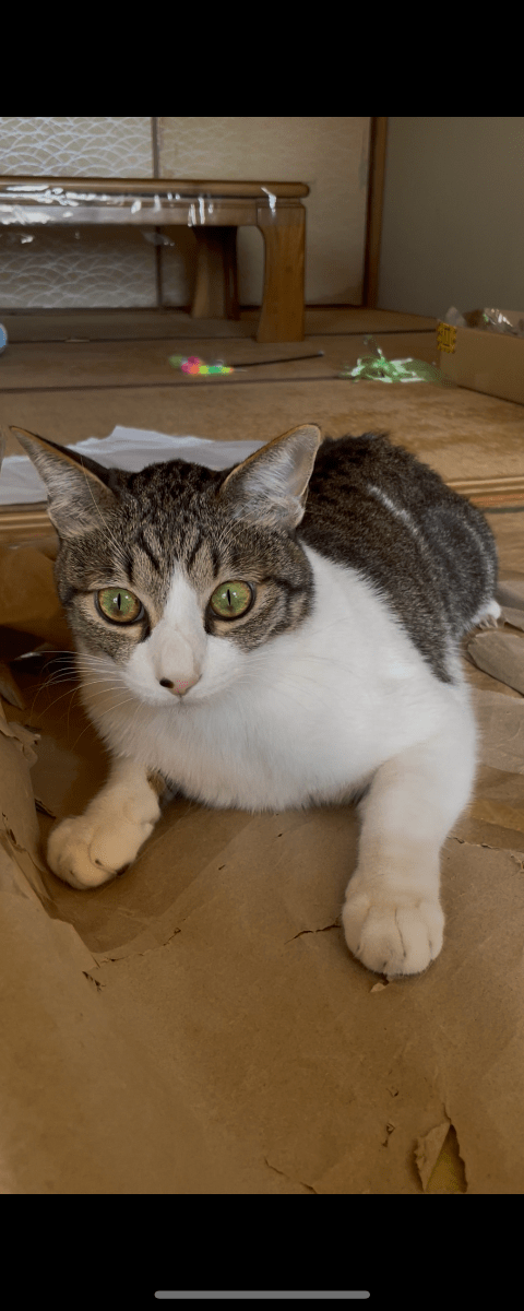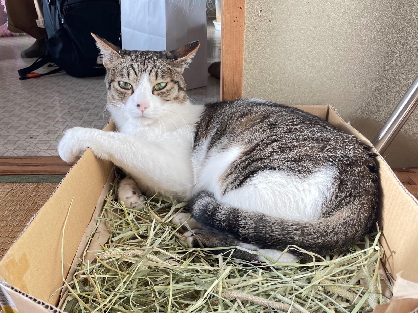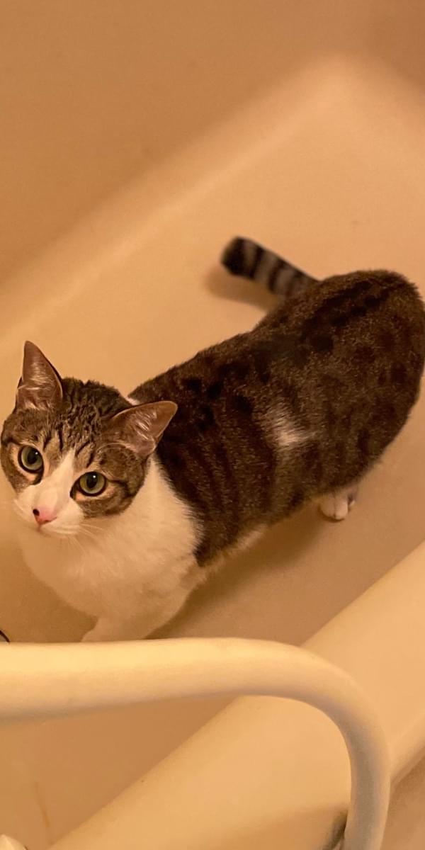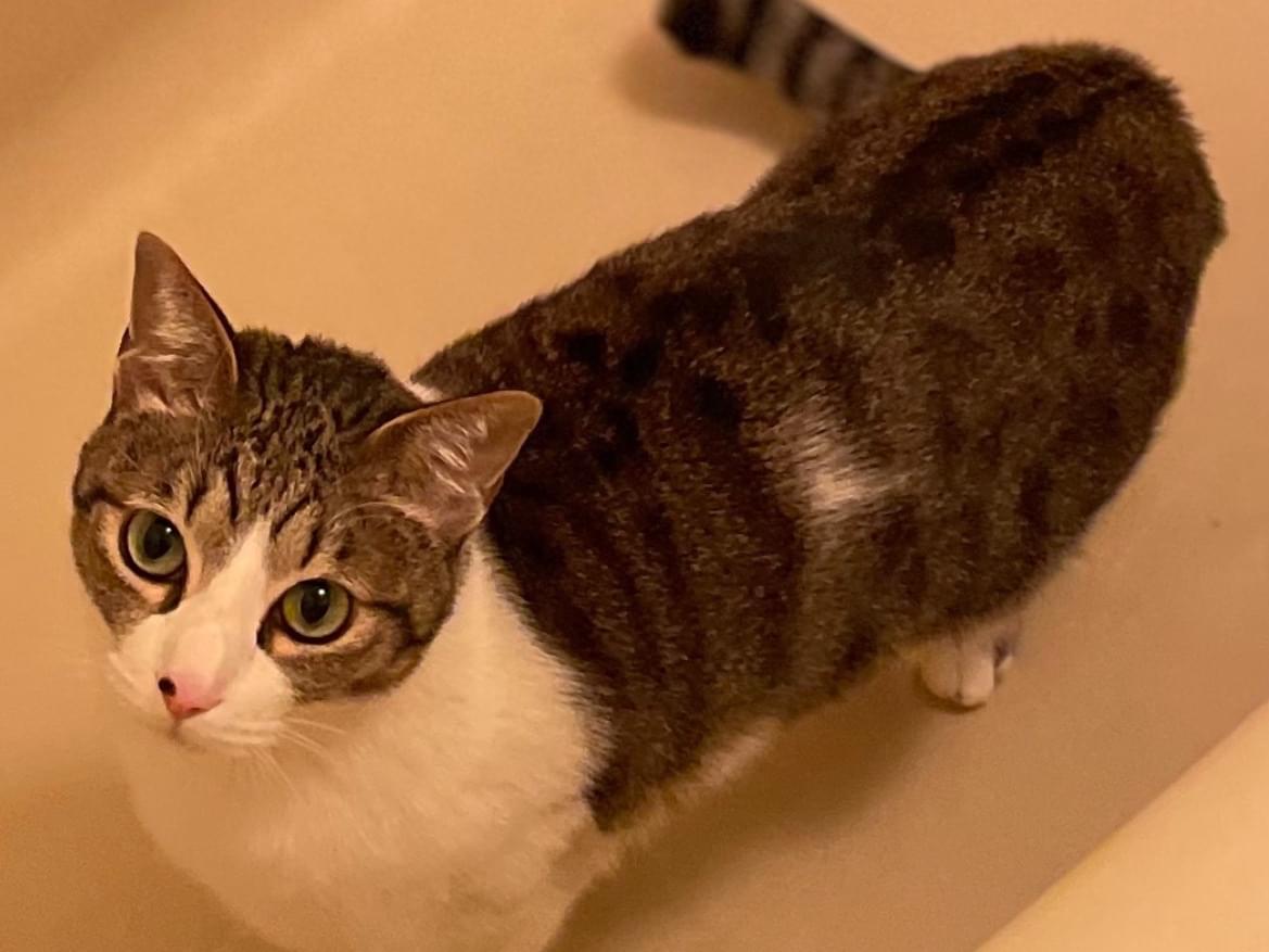 鯖白の男の子で、鼻に黒い点模様、腕には点滴のためのハゲが残ってます。