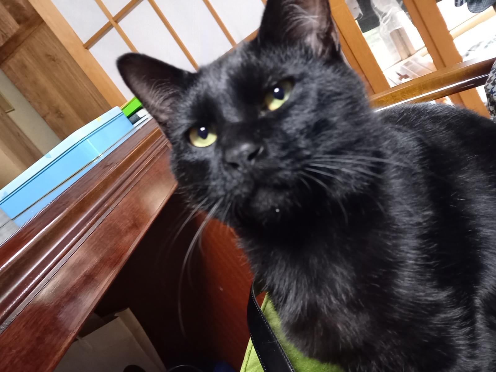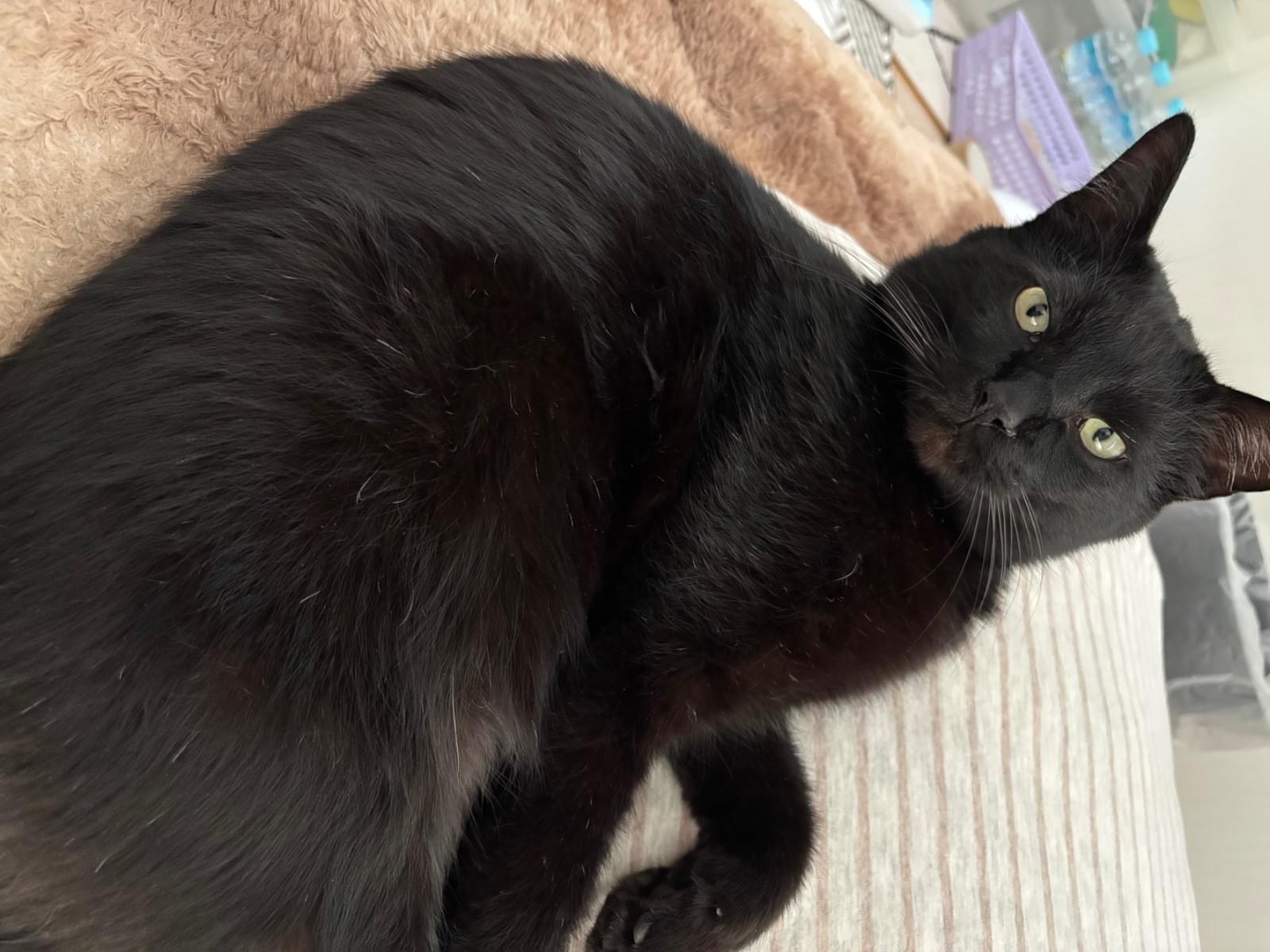 真っ黒の猫、所々白い毛が生えている