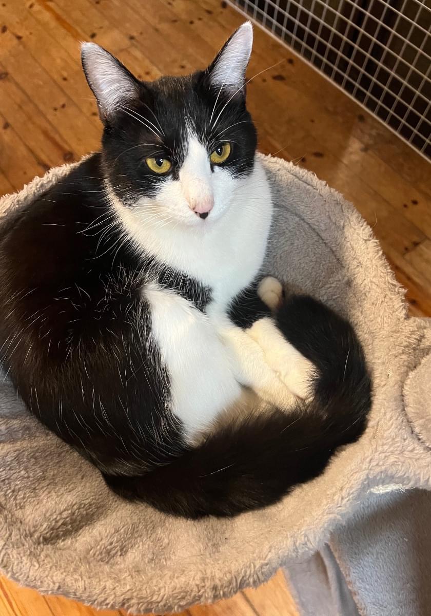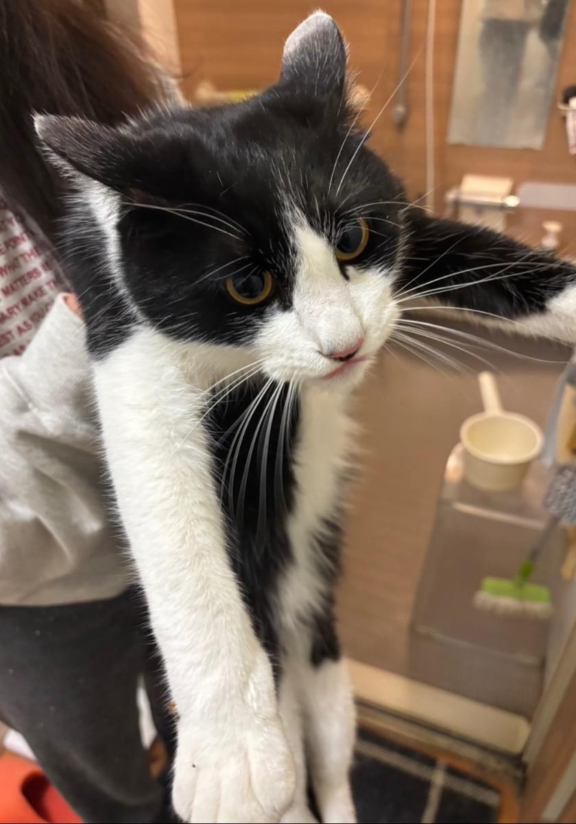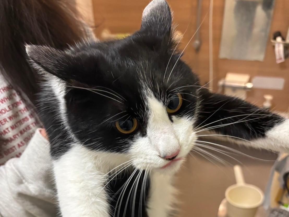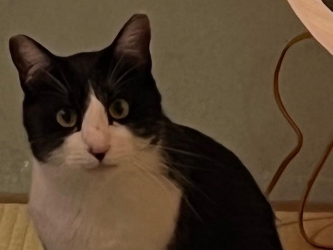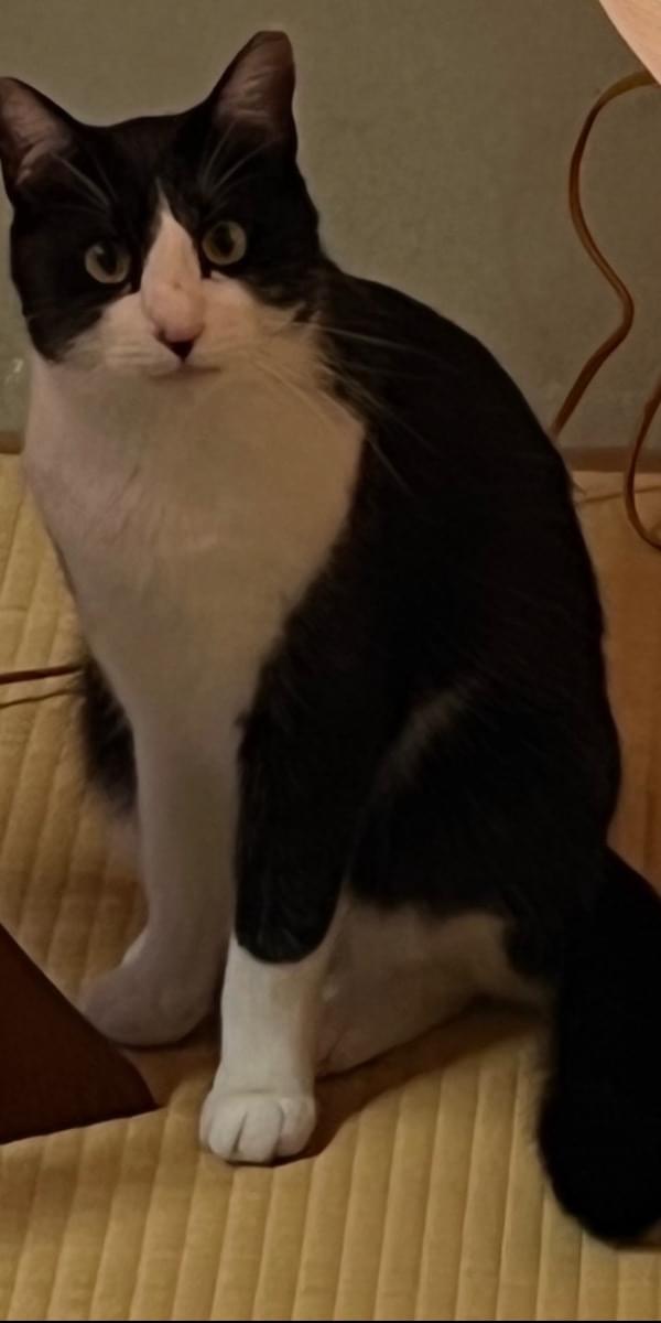 大きくて、尻尾が長く、ハチワレで、黒が多いです。