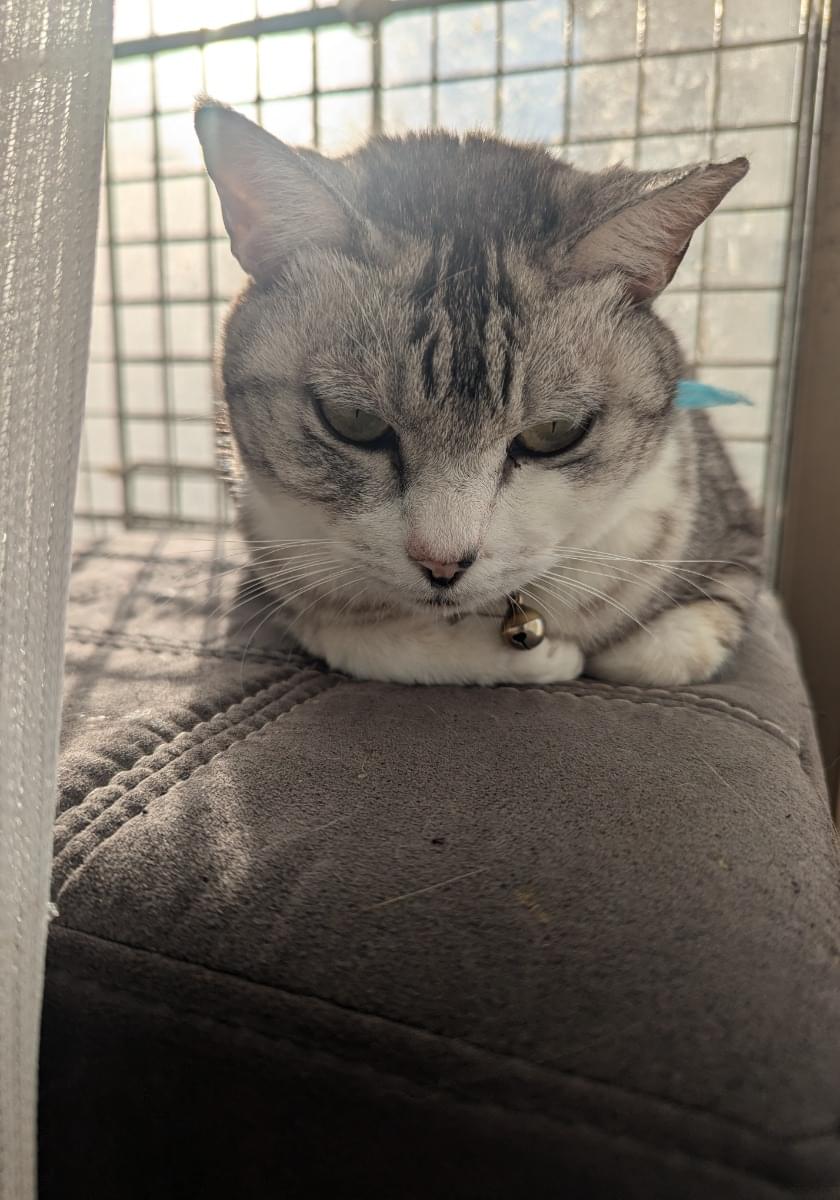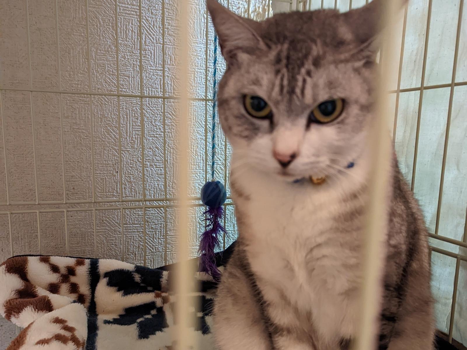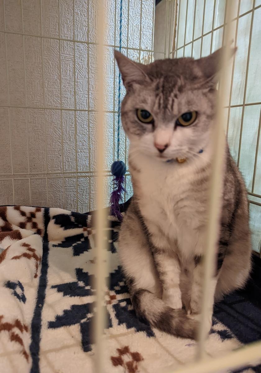 毛色はグレイ色のサバトラで青の首輪をしています