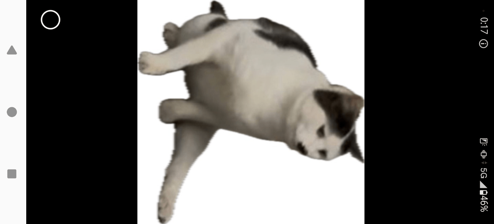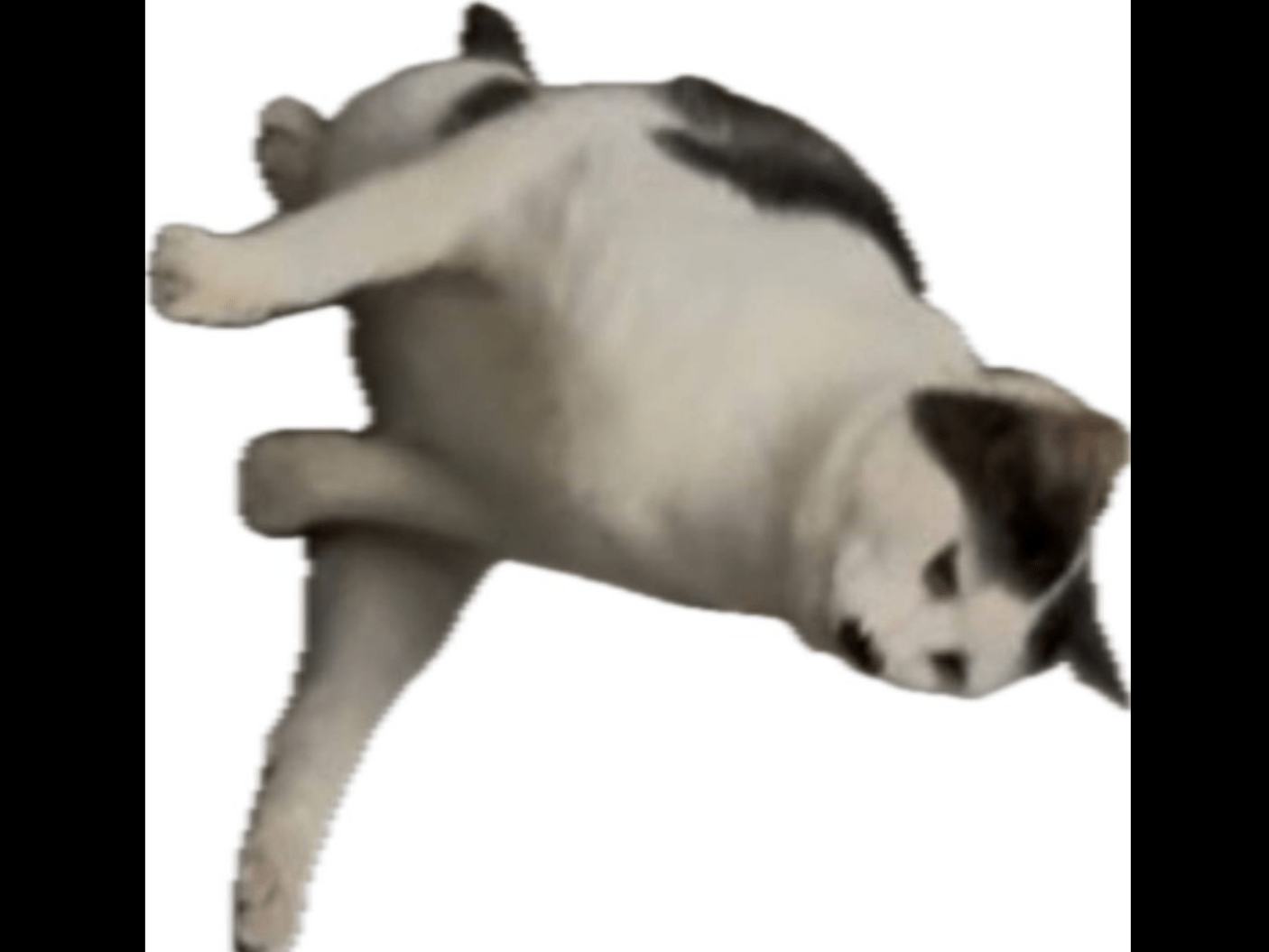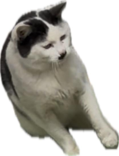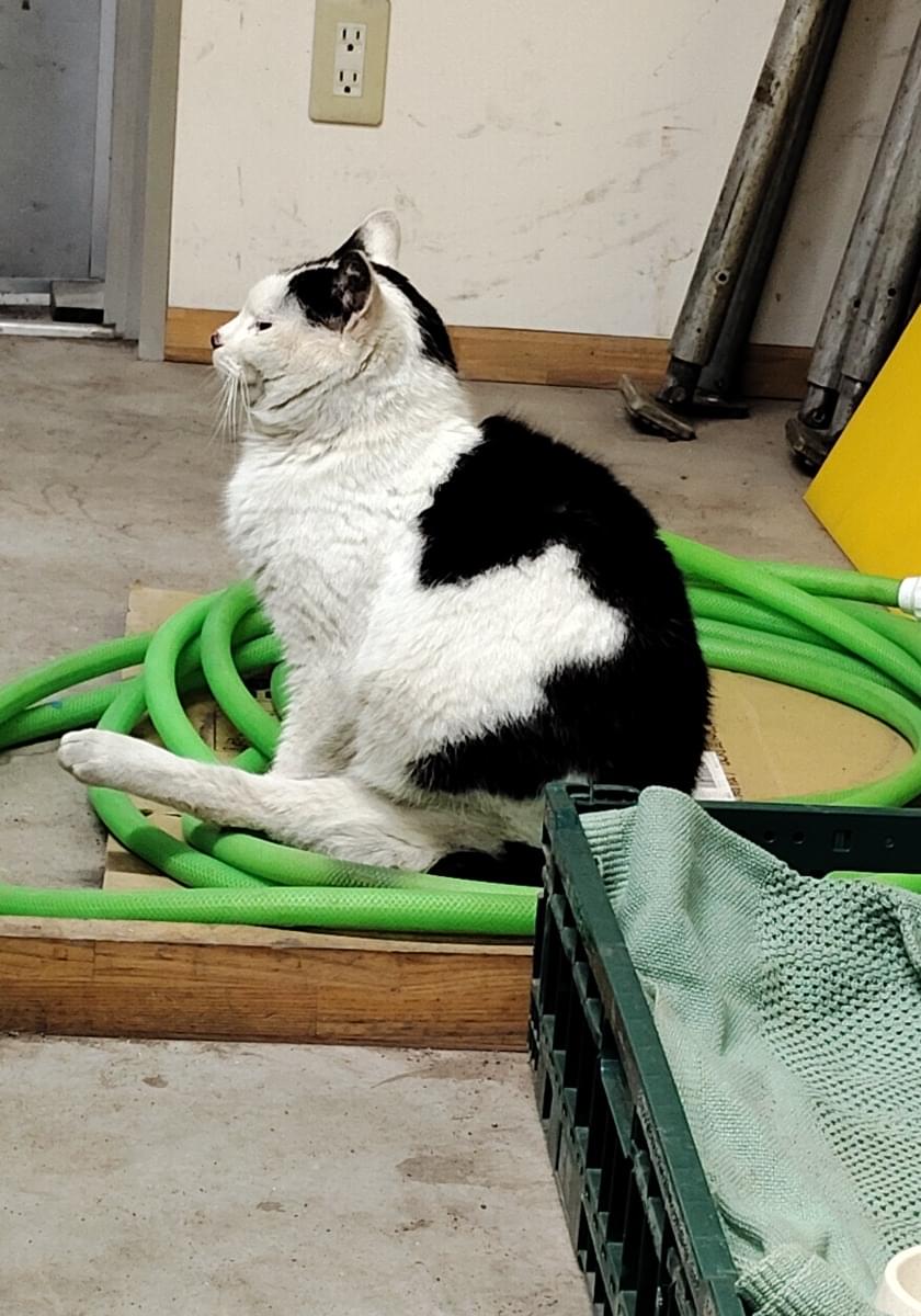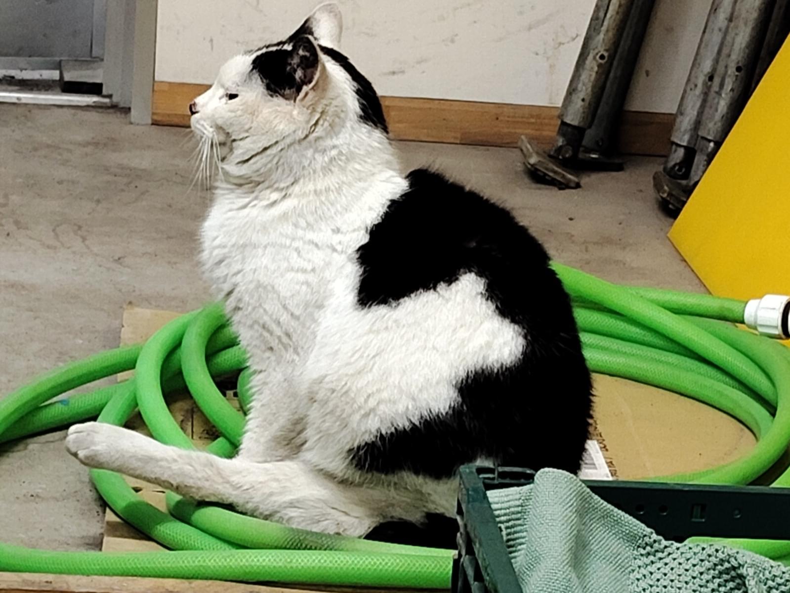 白黒、左後脚悪く、丸々肥ってカギしっぽです。